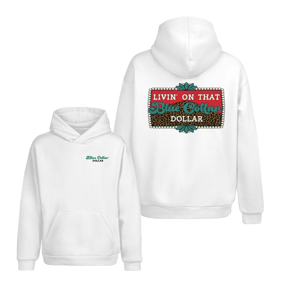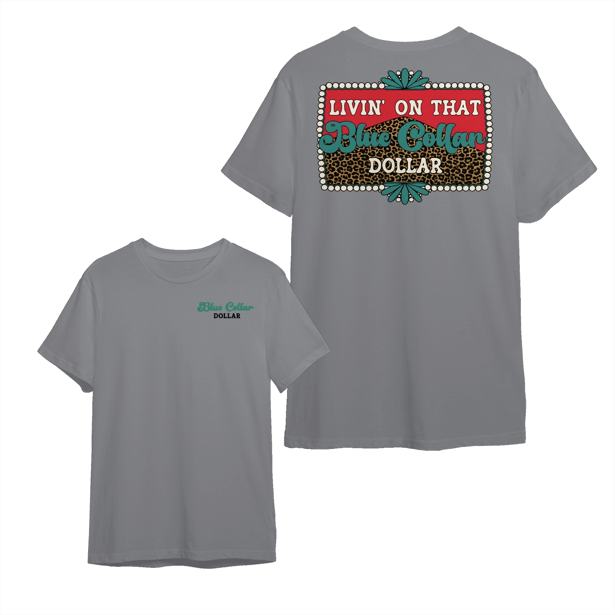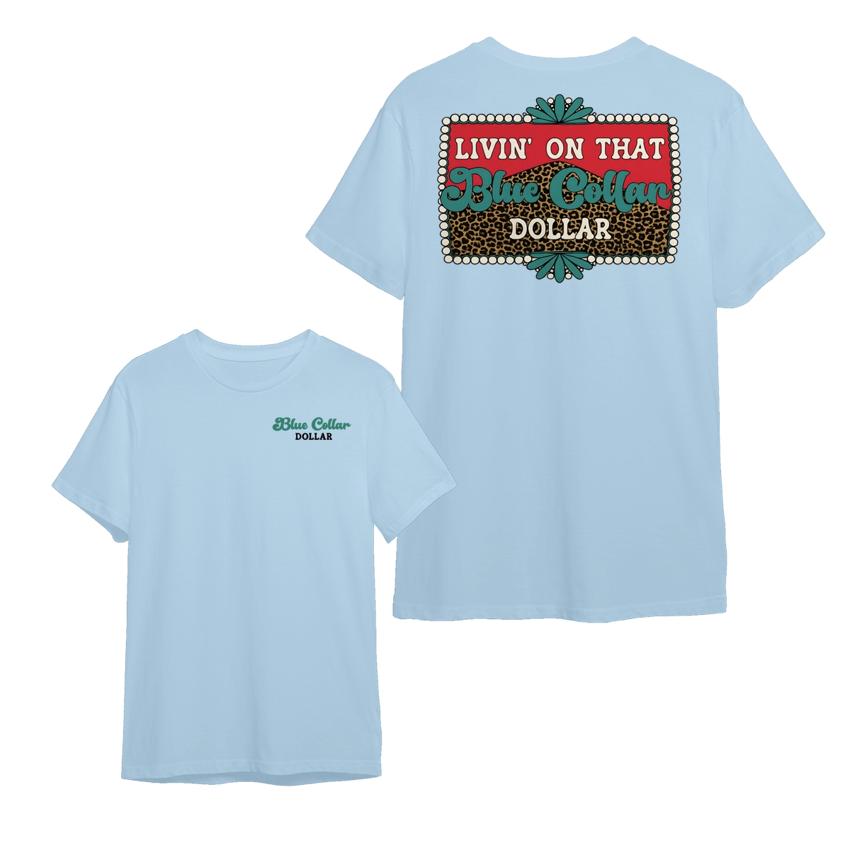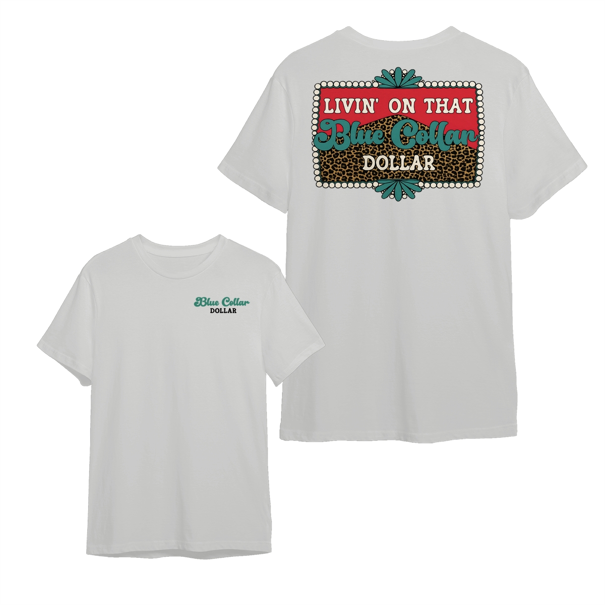 Blue Collar Dollar Brand Livin’ On That Blue Collar Dollar Tshirt Menswear Crewneck Short Sleeve Casual Tropical White 100% Cotton Breathable Comfortable Non-Toxic Ink Direct-to-Garment Printing Made to Order Tops