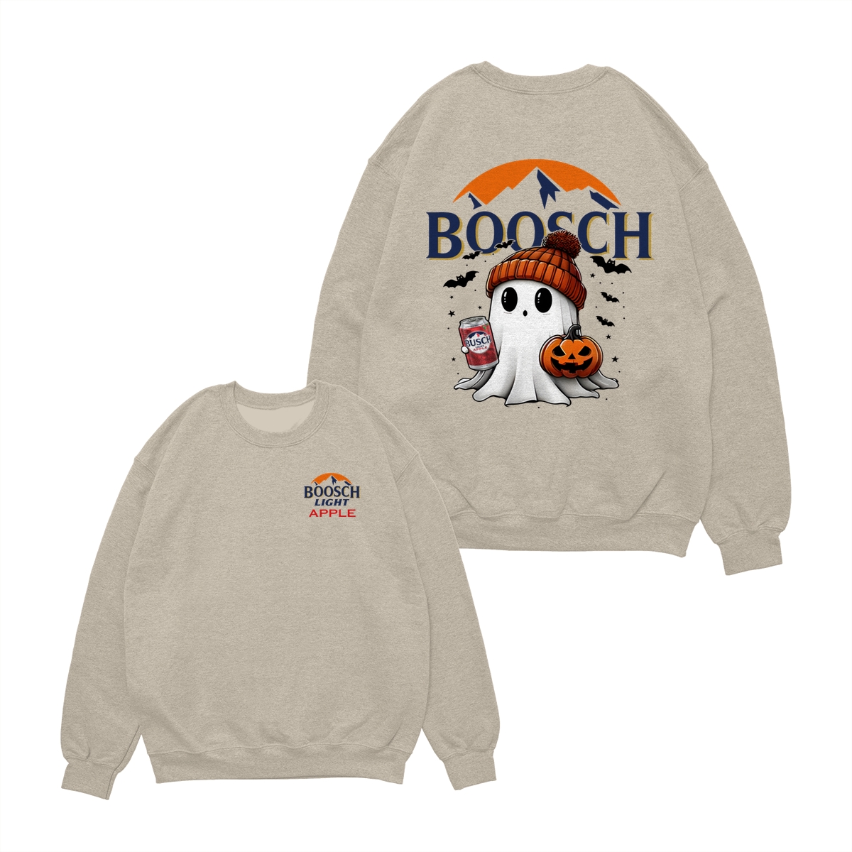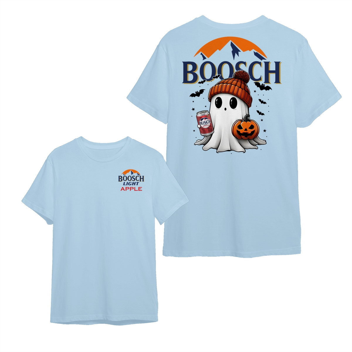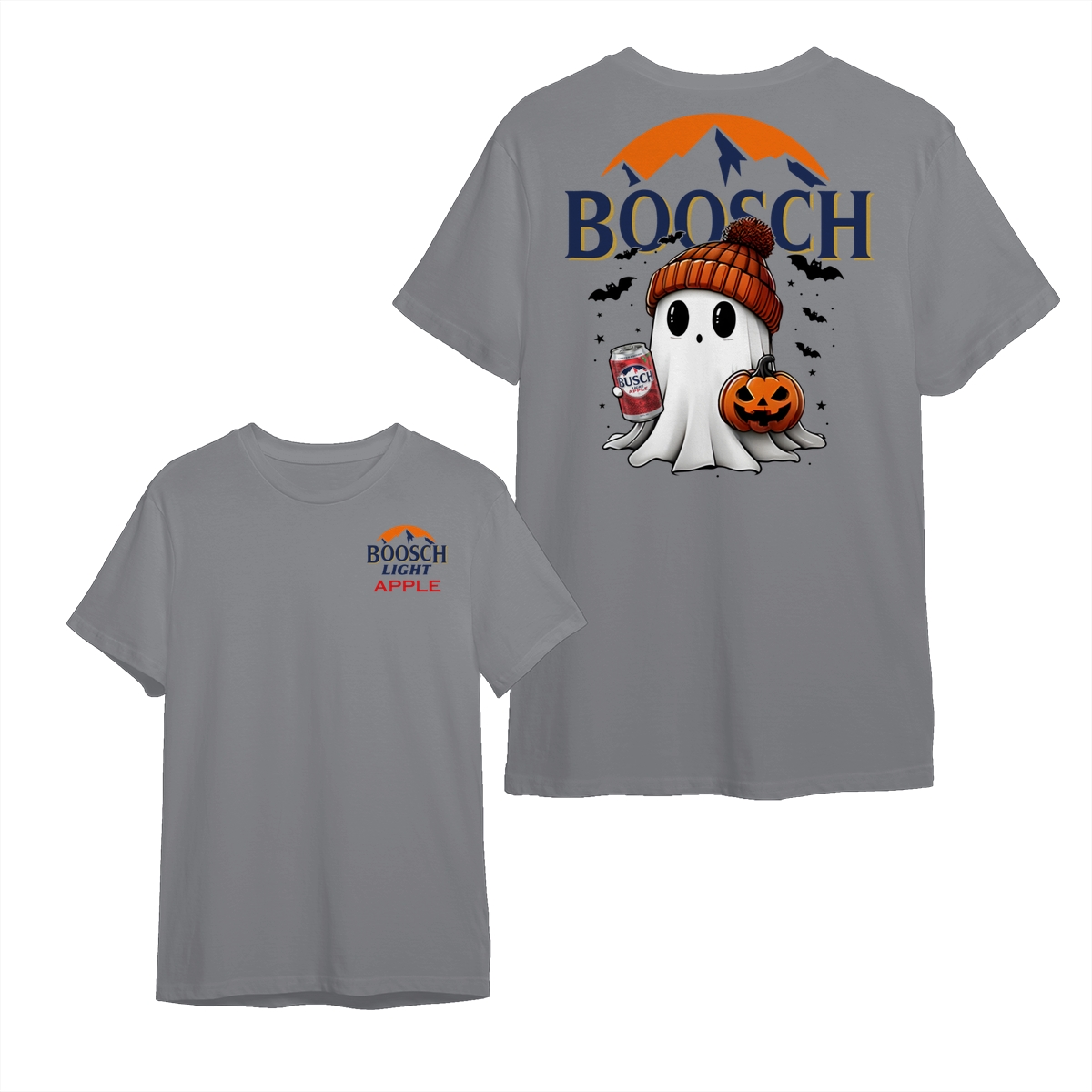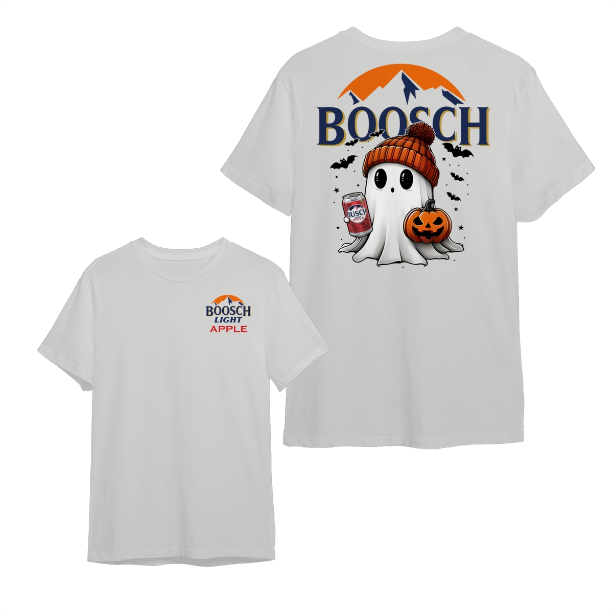 Boosch Light Apple Halloween T-Shirt, Cute Ghost with Pumpkin & Beer Can, Spooky Season 2-Sided Graphic Design Unisex Cotton Tee for Men & Women