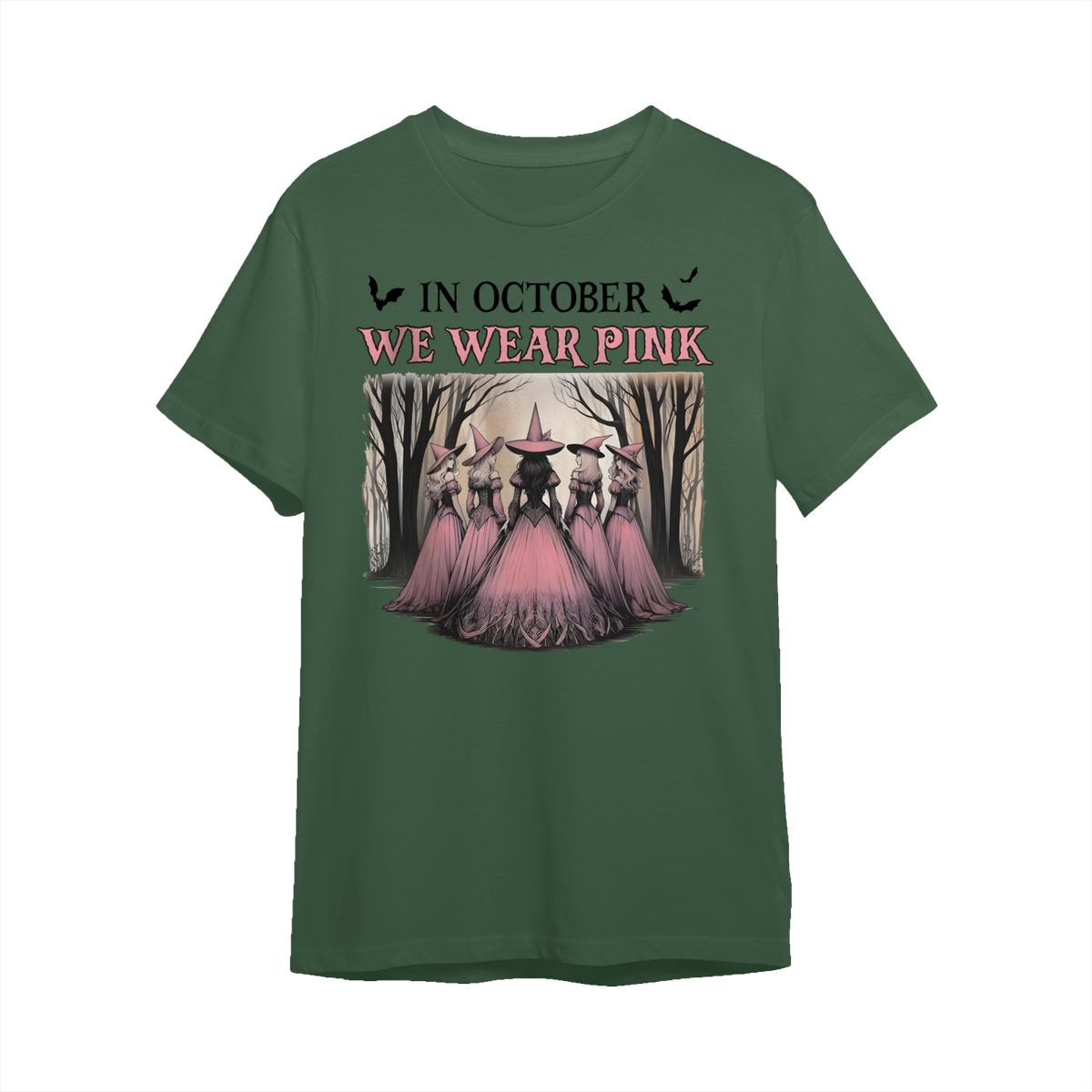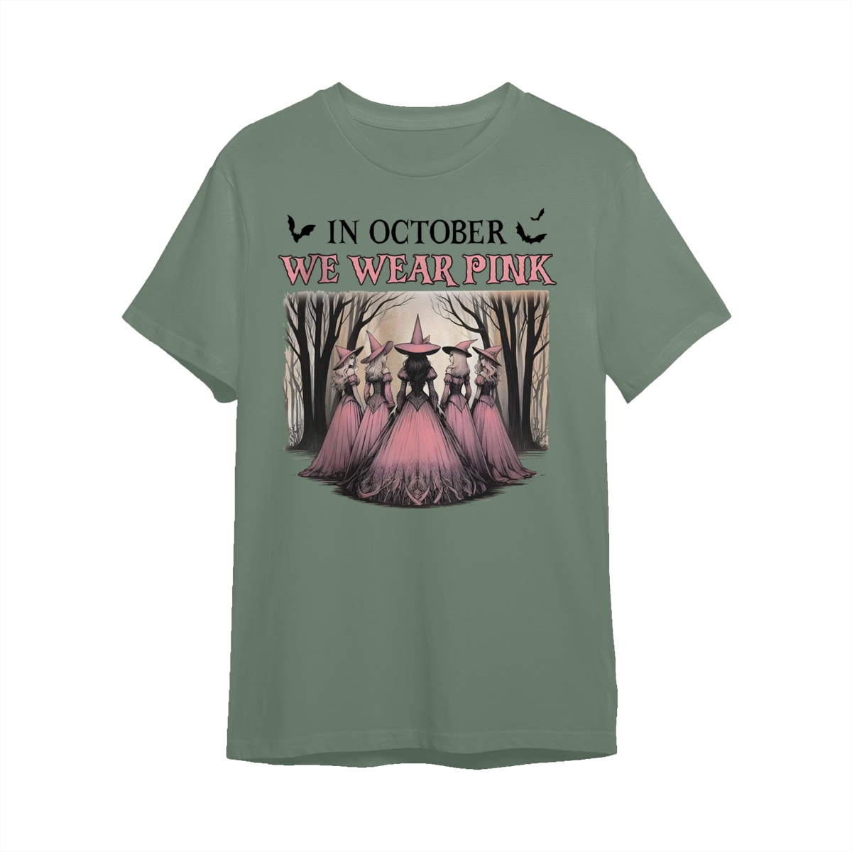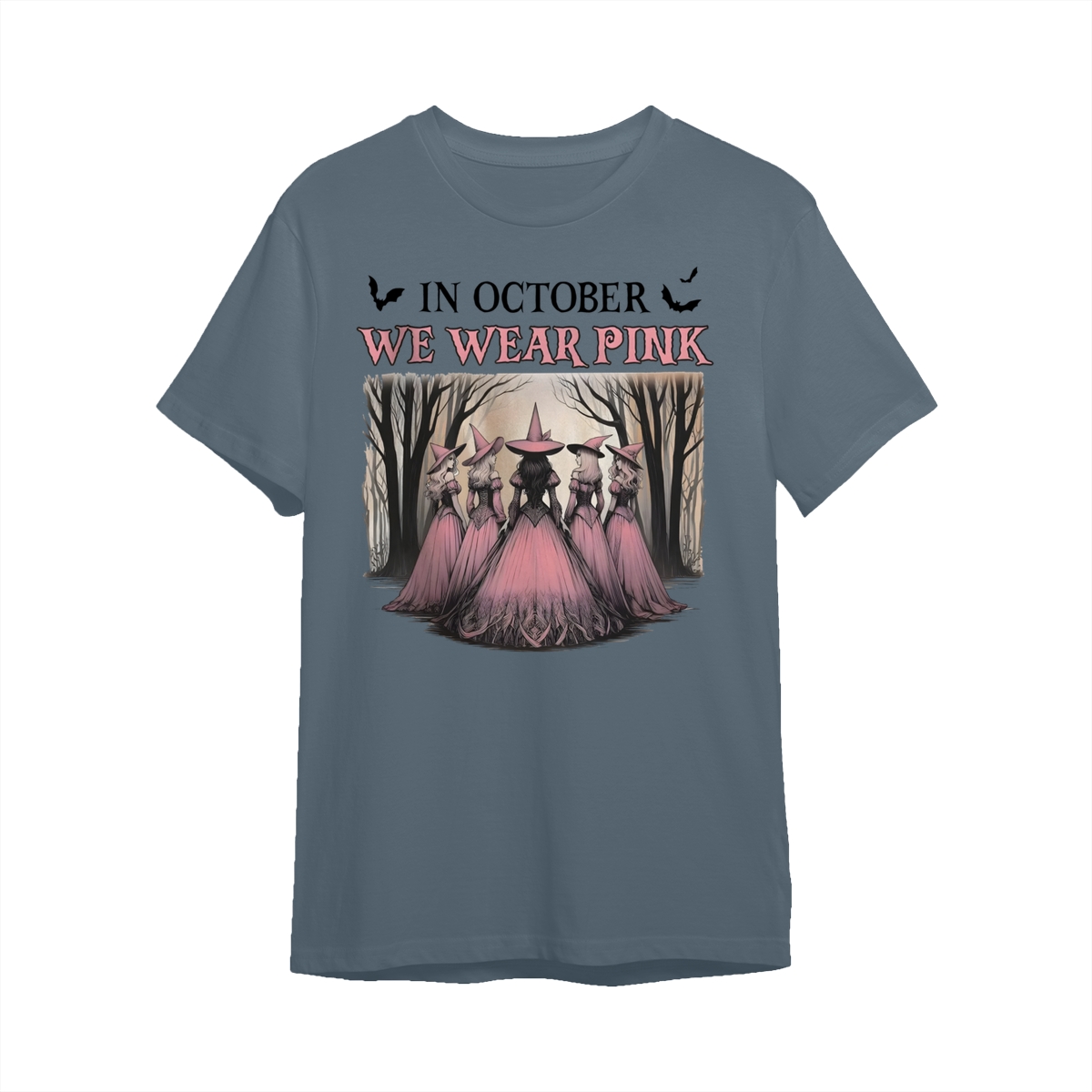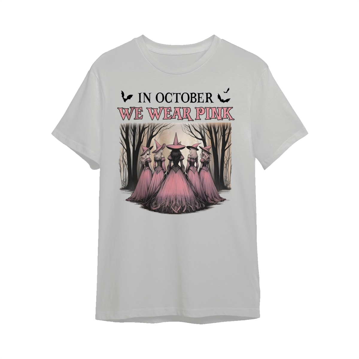 Breast Cancer Awareness Shirt, In October We Wear Pink Tee, Retro Ghost Halloween T-Shirt, Cute Witch Top, Pink Ribbon Support Gift
