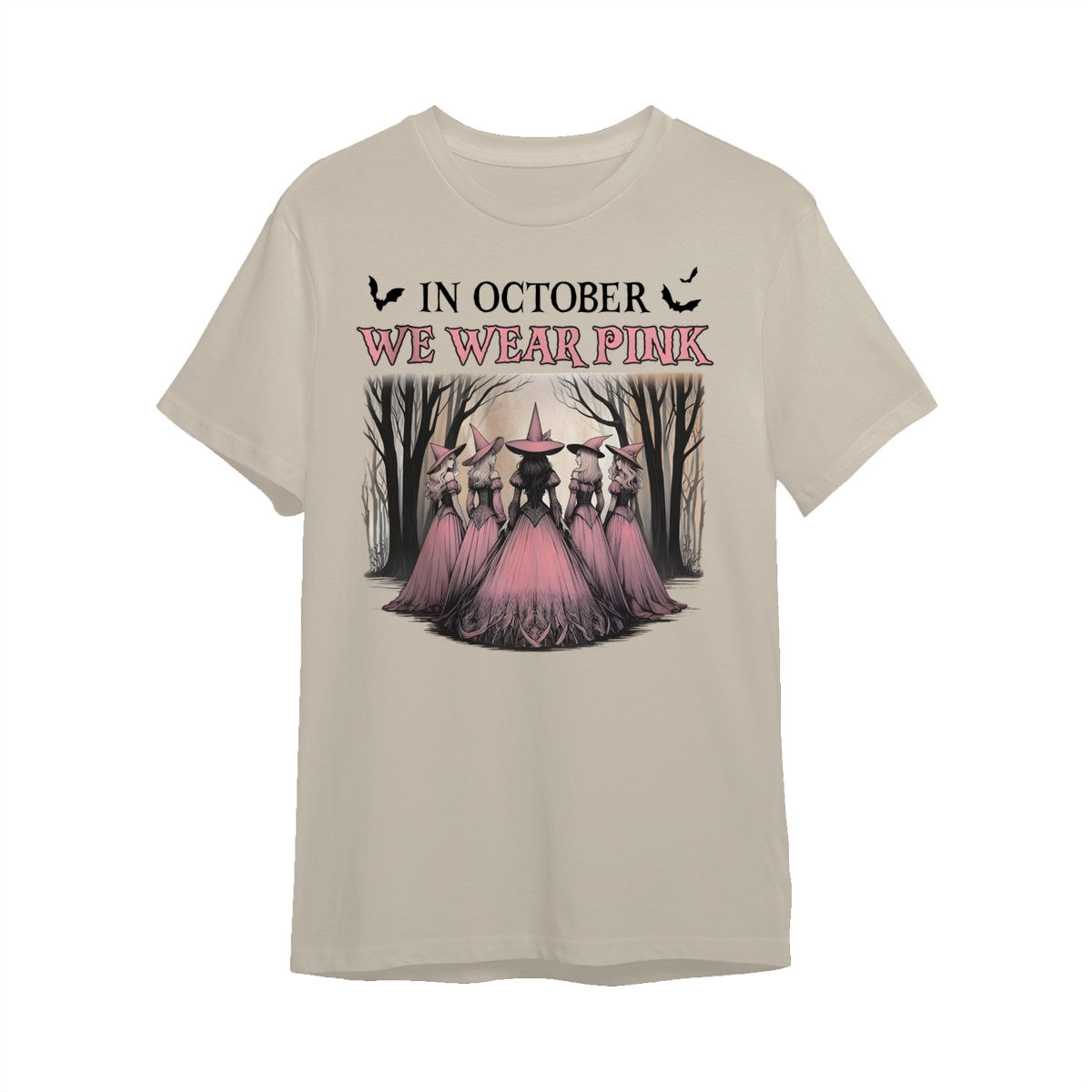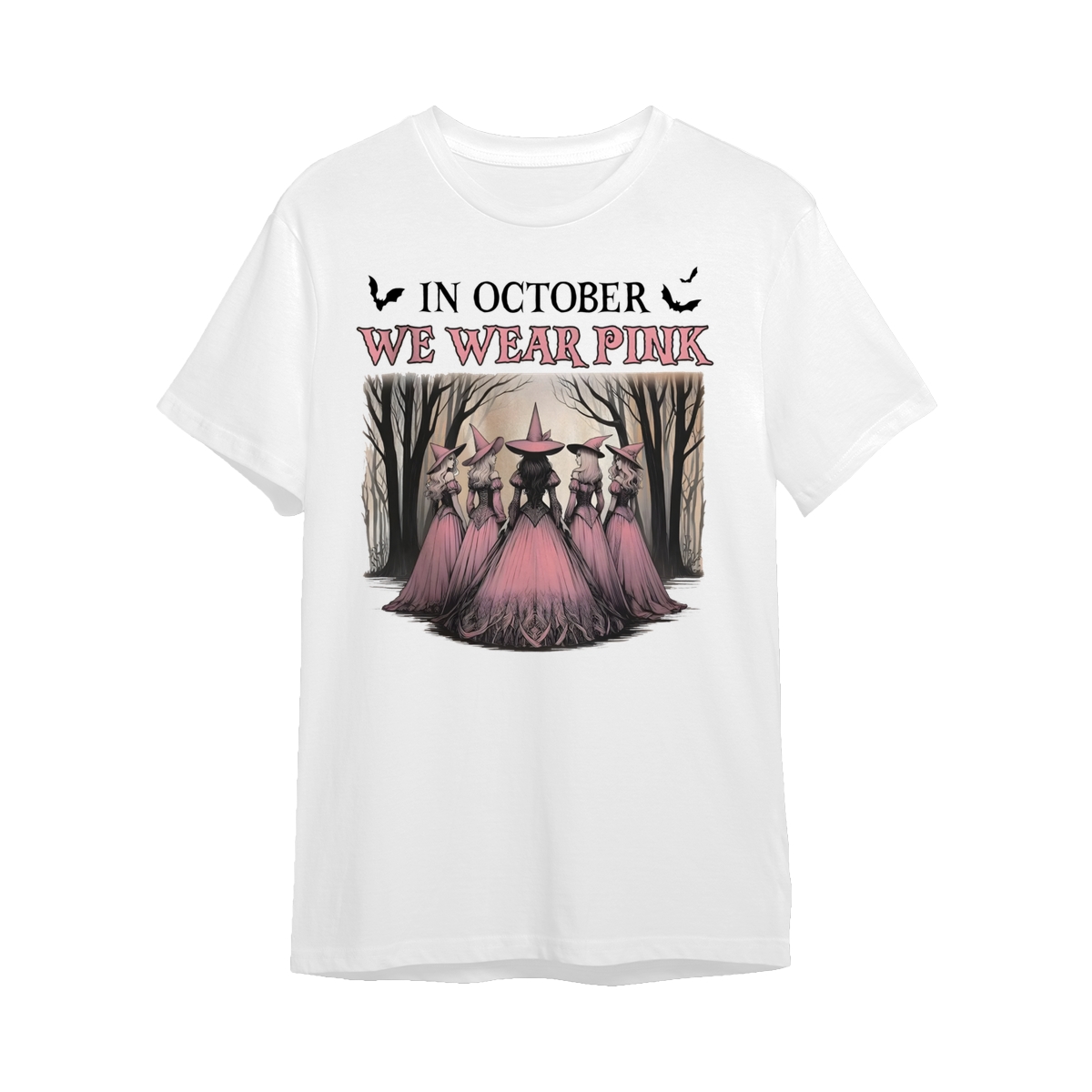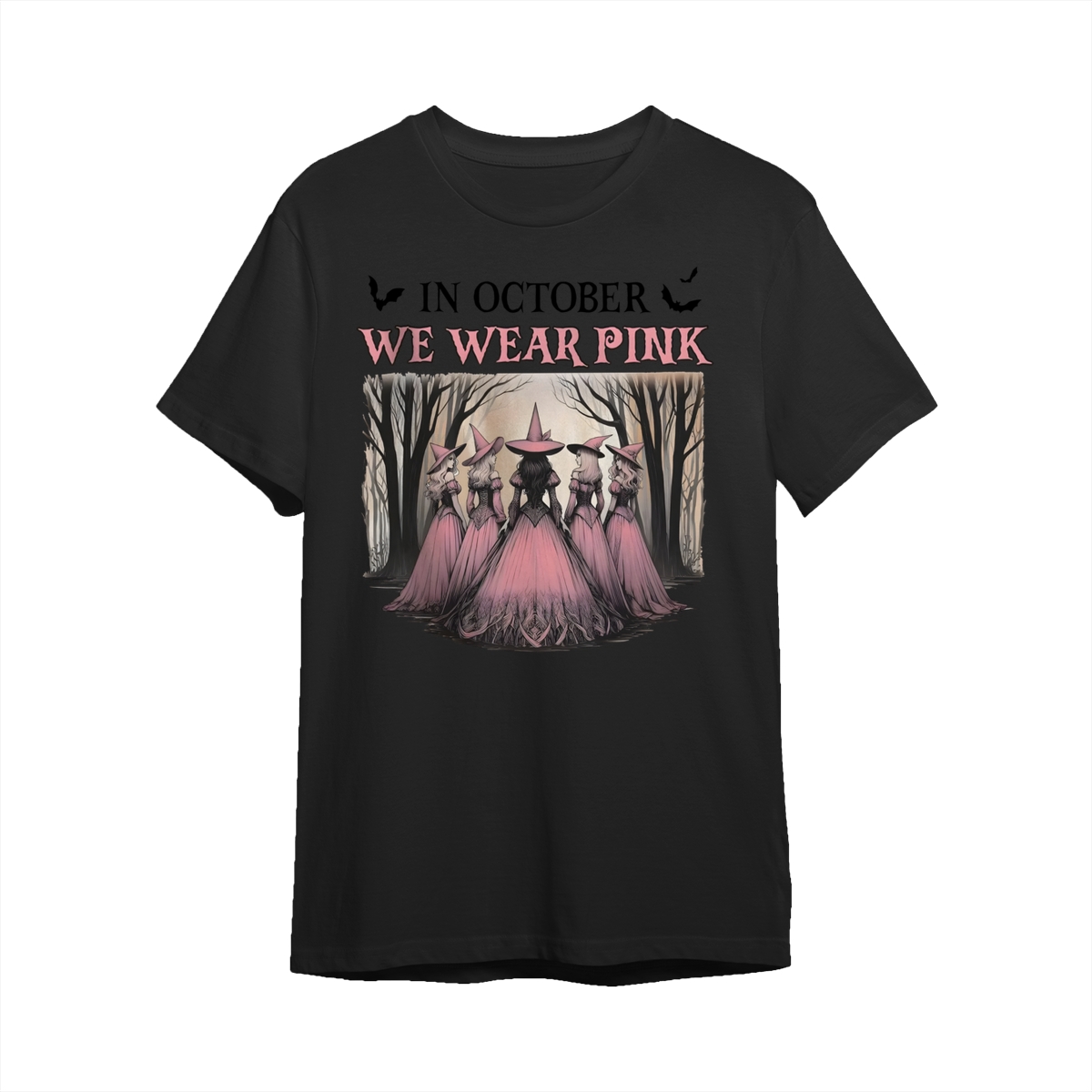 Breast Cancer Awareness Shirt, In October We Wear Pink Tee, Retro Ghost Halloween T-Shirt, Cute Witch Top, Pink Ribbon Support Gift