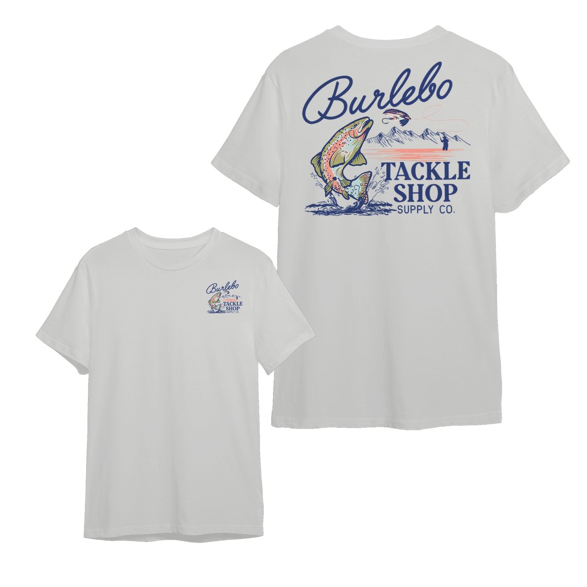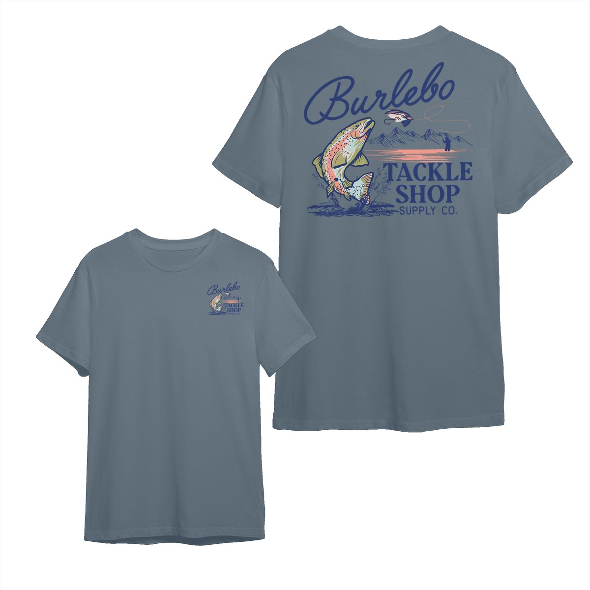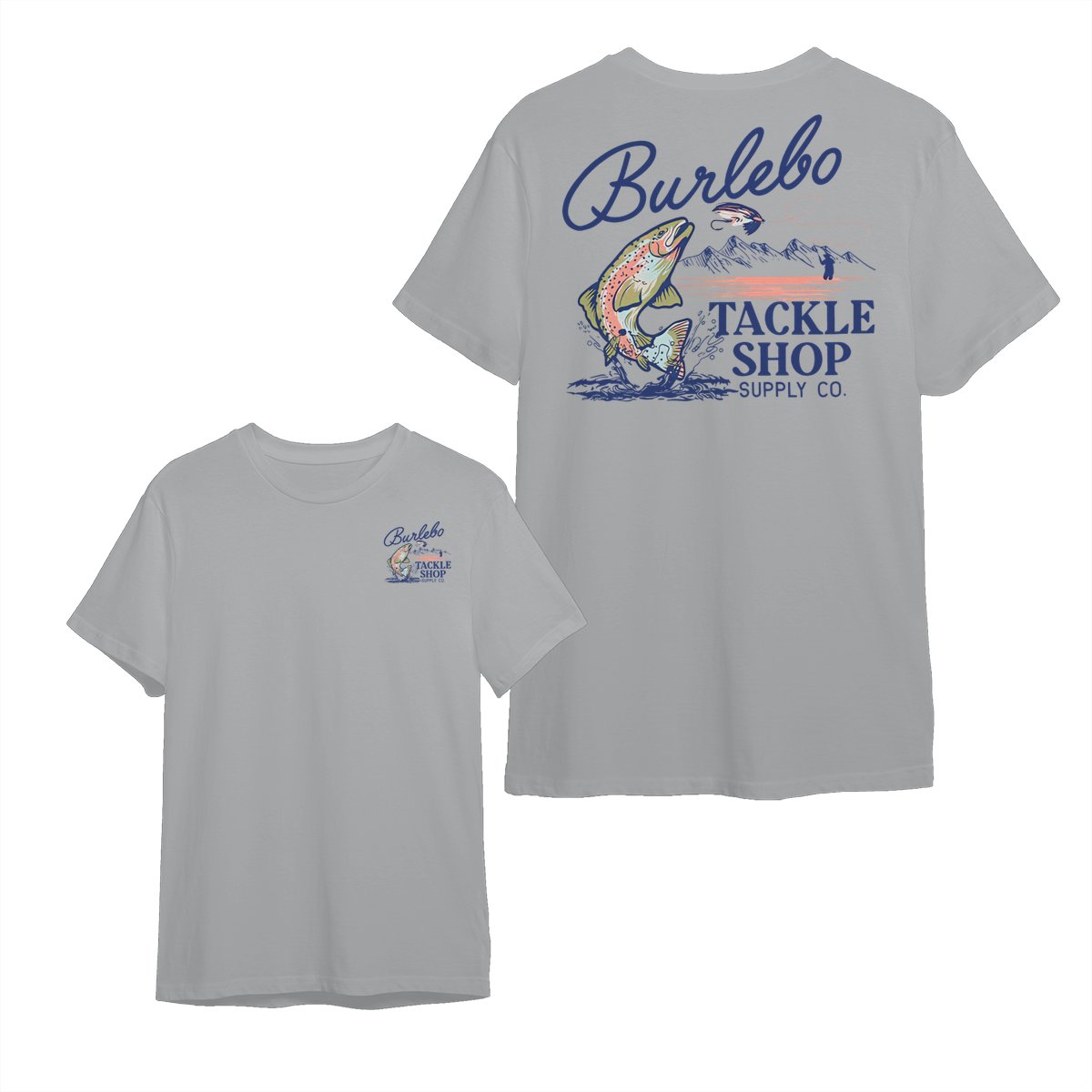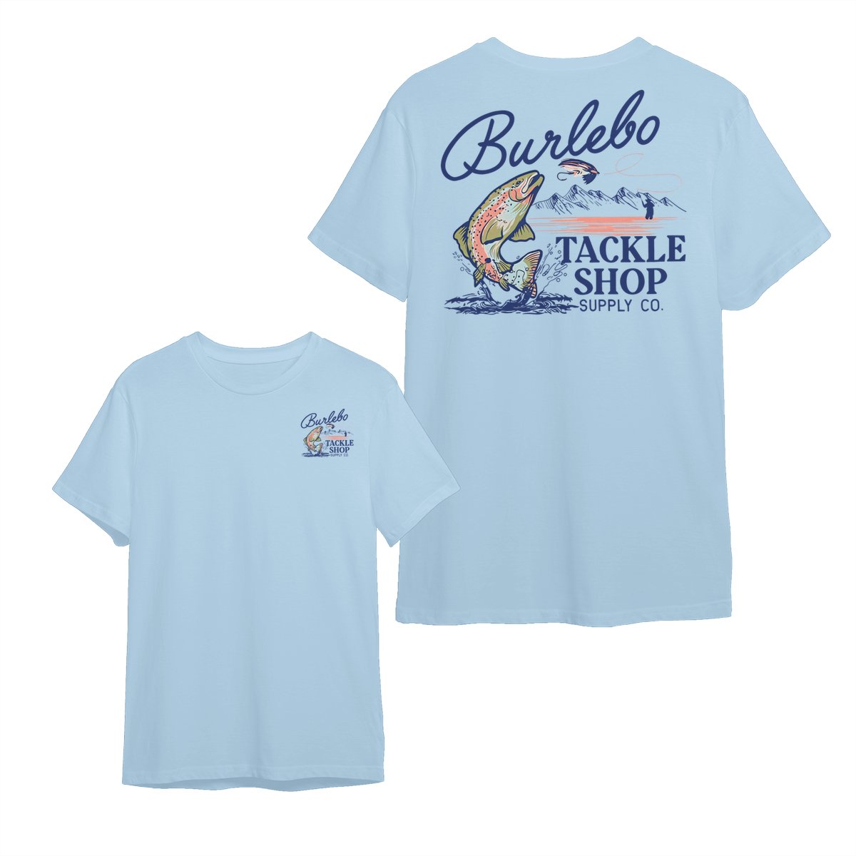 Burlebo Tackle Shop Fishing Shirt – Jumping Trout Graphic With Mountain And Fisherman Design, Outdoor Angler Tee, Nature Lover Outfit, Fishing Trip Shirt, Summer Sport Apparel
