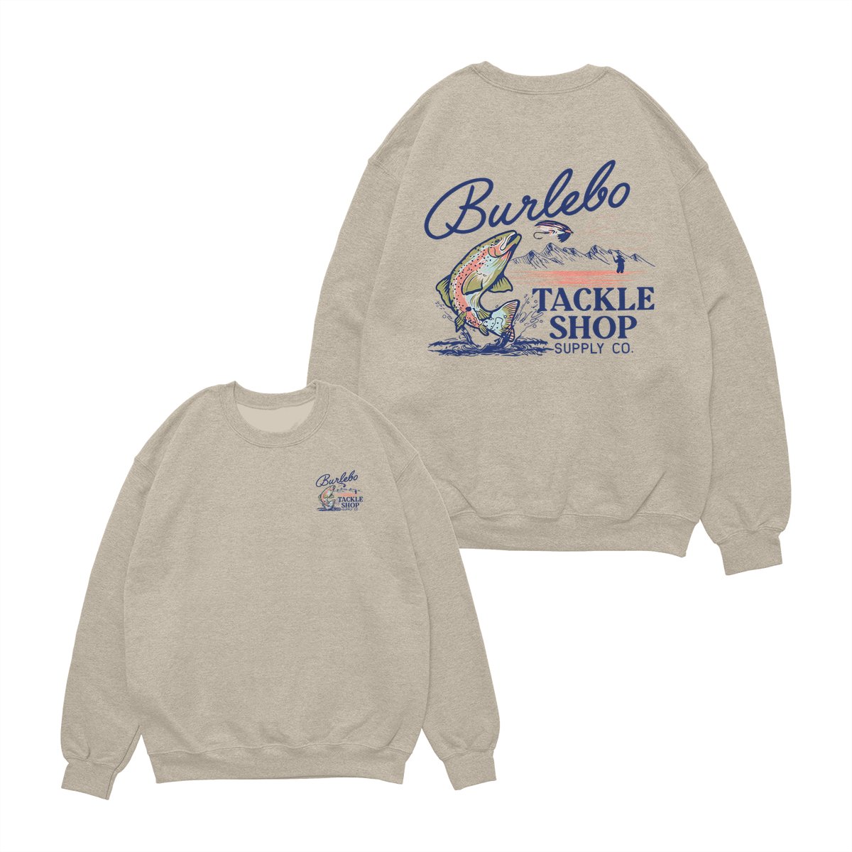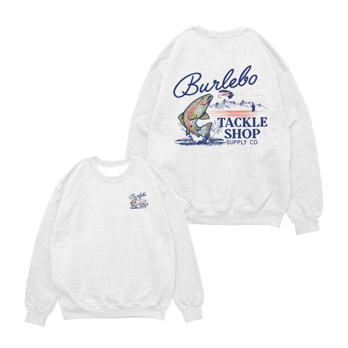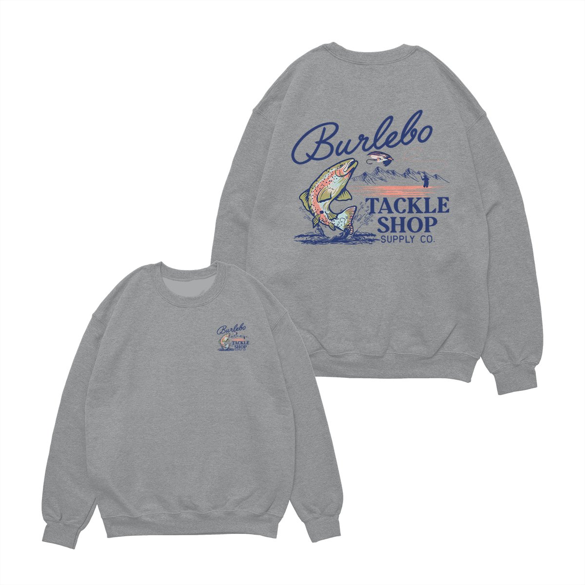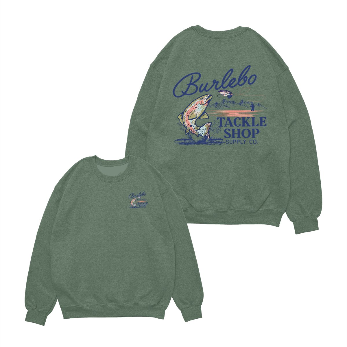 Burlebo Tackle Shop Fishing Shirt – Jumping Trout Graphic With Mountain And Fisherman Design, Outdoor Angler Tee, Nature Lover Outfit, Fishing Trip Shirt, Summer Sport Apparel