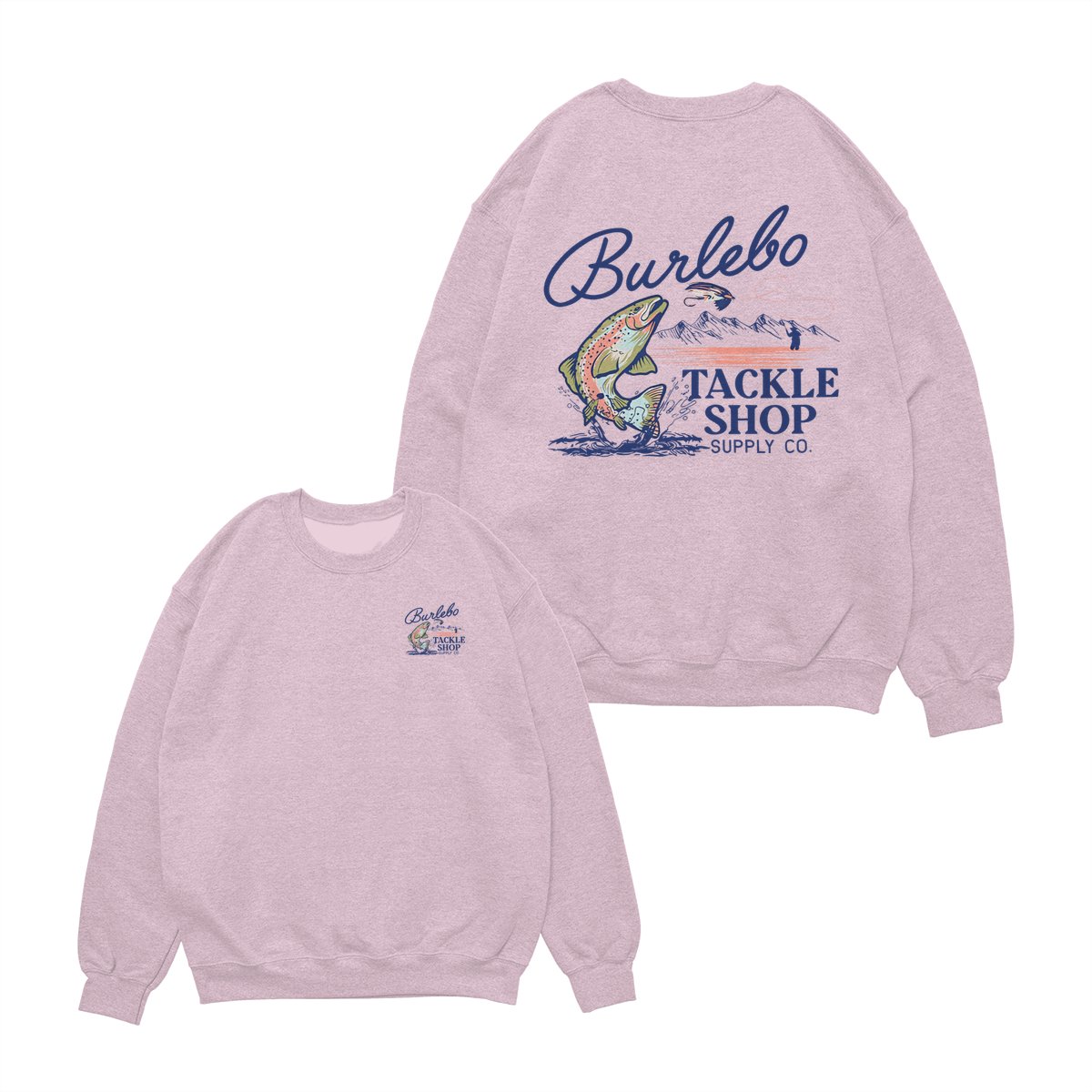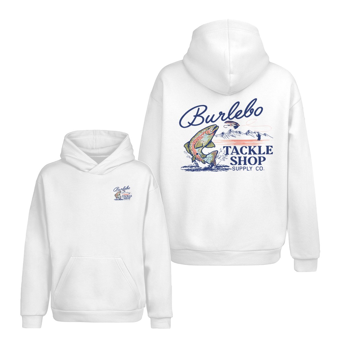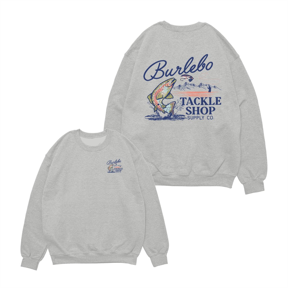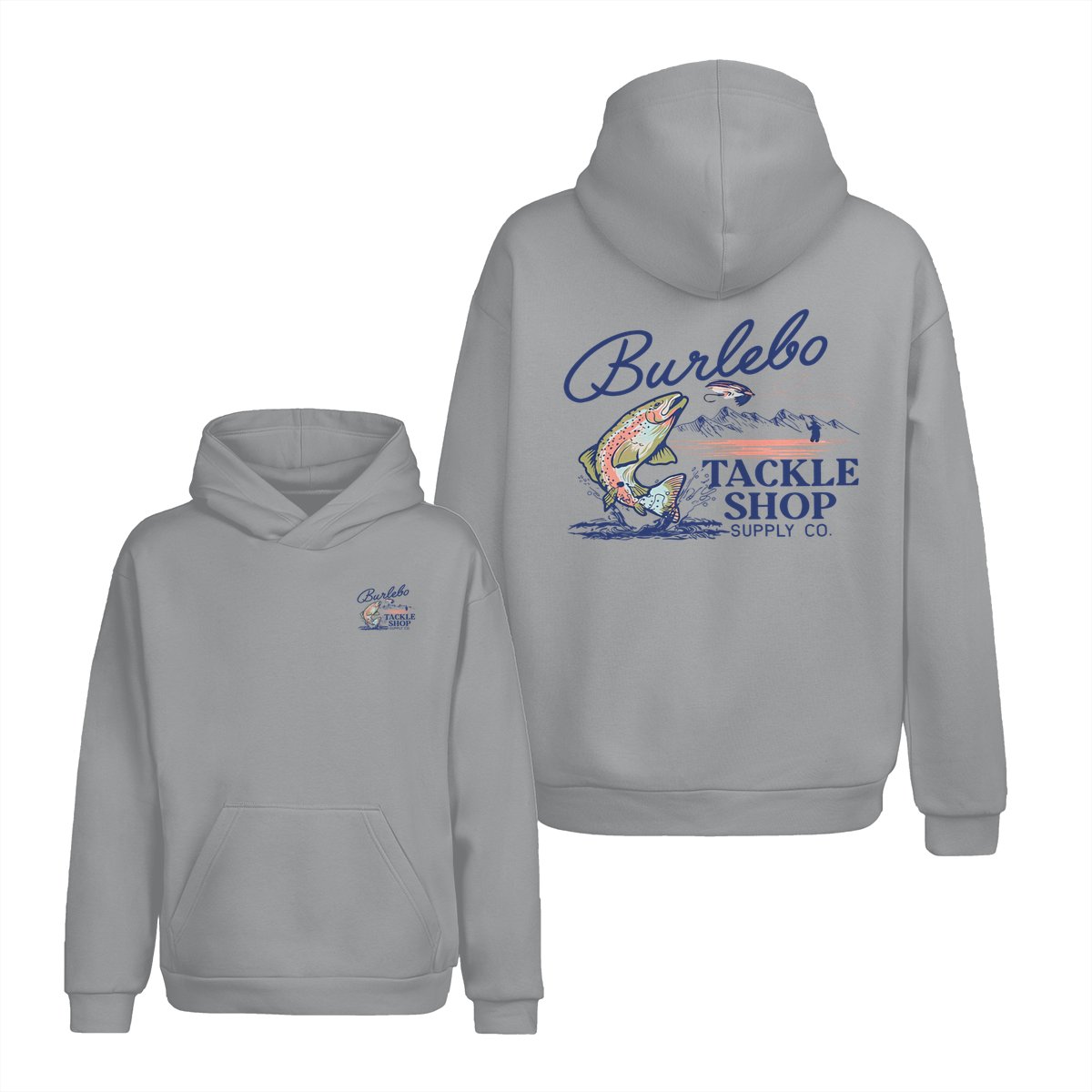 Burlebo Tackle Shop Fishing Shirt – Jumping Trout Graphic With Mountain And Fisherman Design, Outdoor Angler Tee, Nature Lover Outfit, Fishing Trip Shirt, Summer Sport Apparel