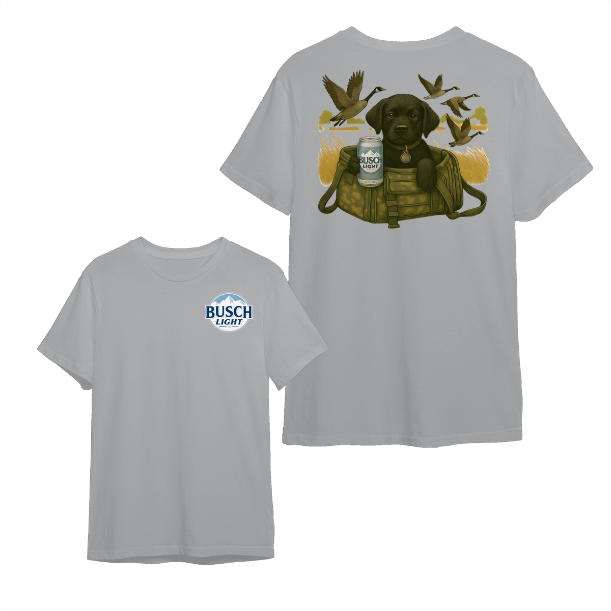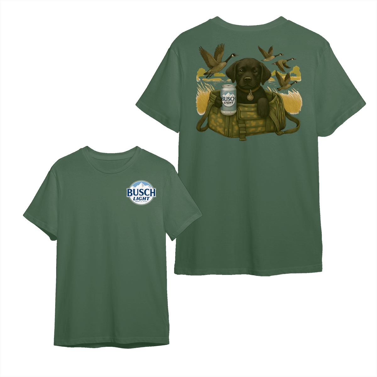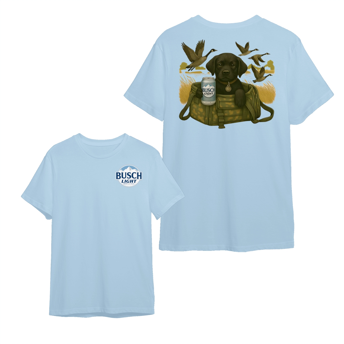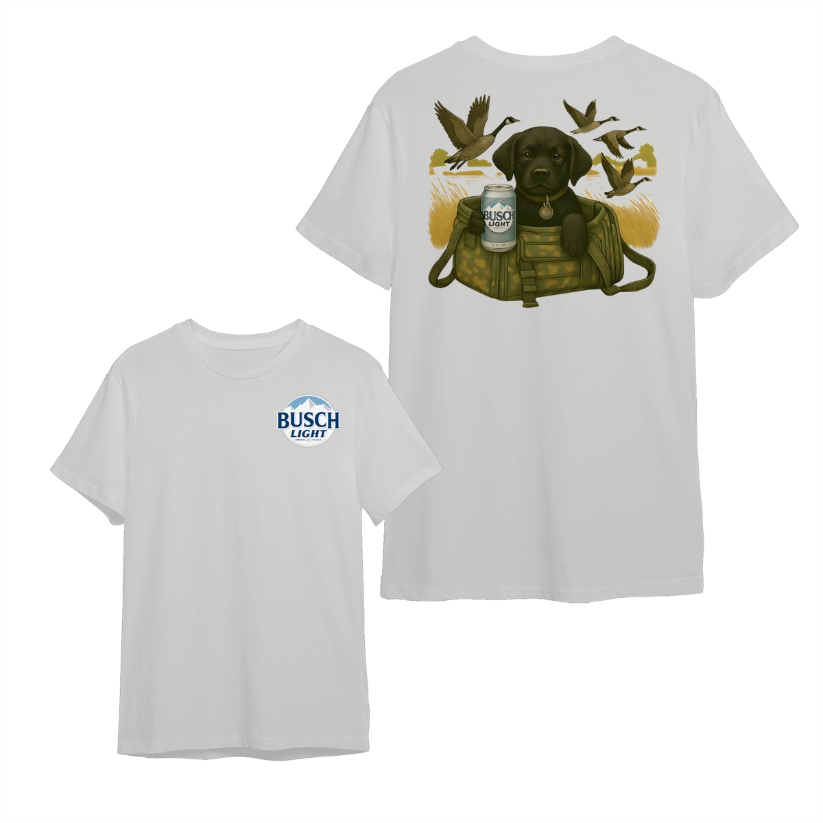 Busch Light Black Labrador Puppy Hunting Unisex T-Shirt, Camo Bag Graphic Tee, Gift for Dog Lover, Puppy Owner Mama, Duck Hunting, Funny Dog with Beer, For Men and Women
