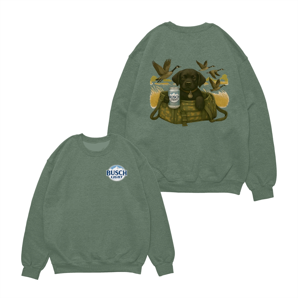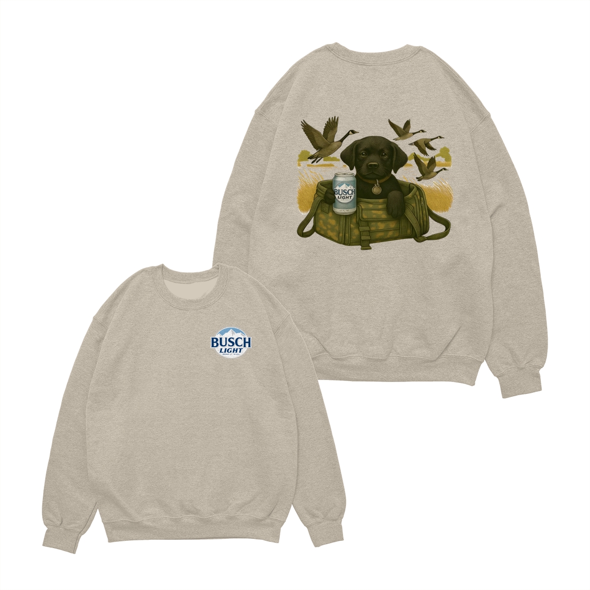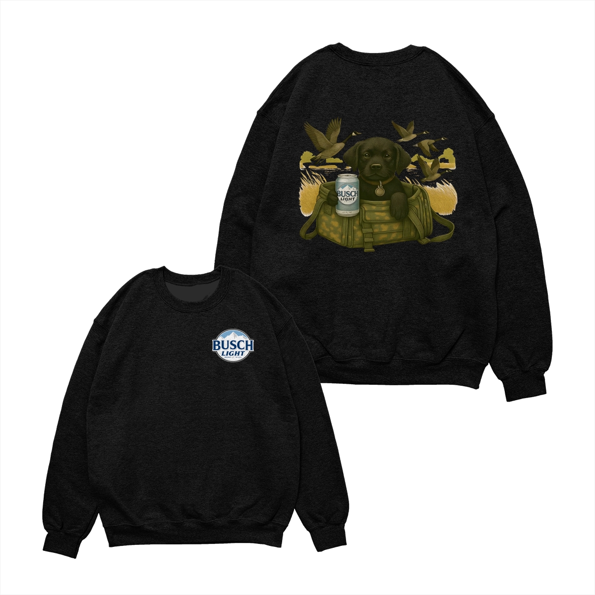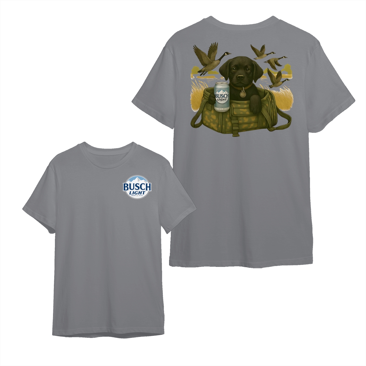 Busch Light Black Labrador Puppy Hunting Unisex T-Shirt, Camo Bag Graphic Tee, Gift for Dog Lover, Puppy Owner Mama, Duck Hunting, Funny Dog with Beer, For Men and Women