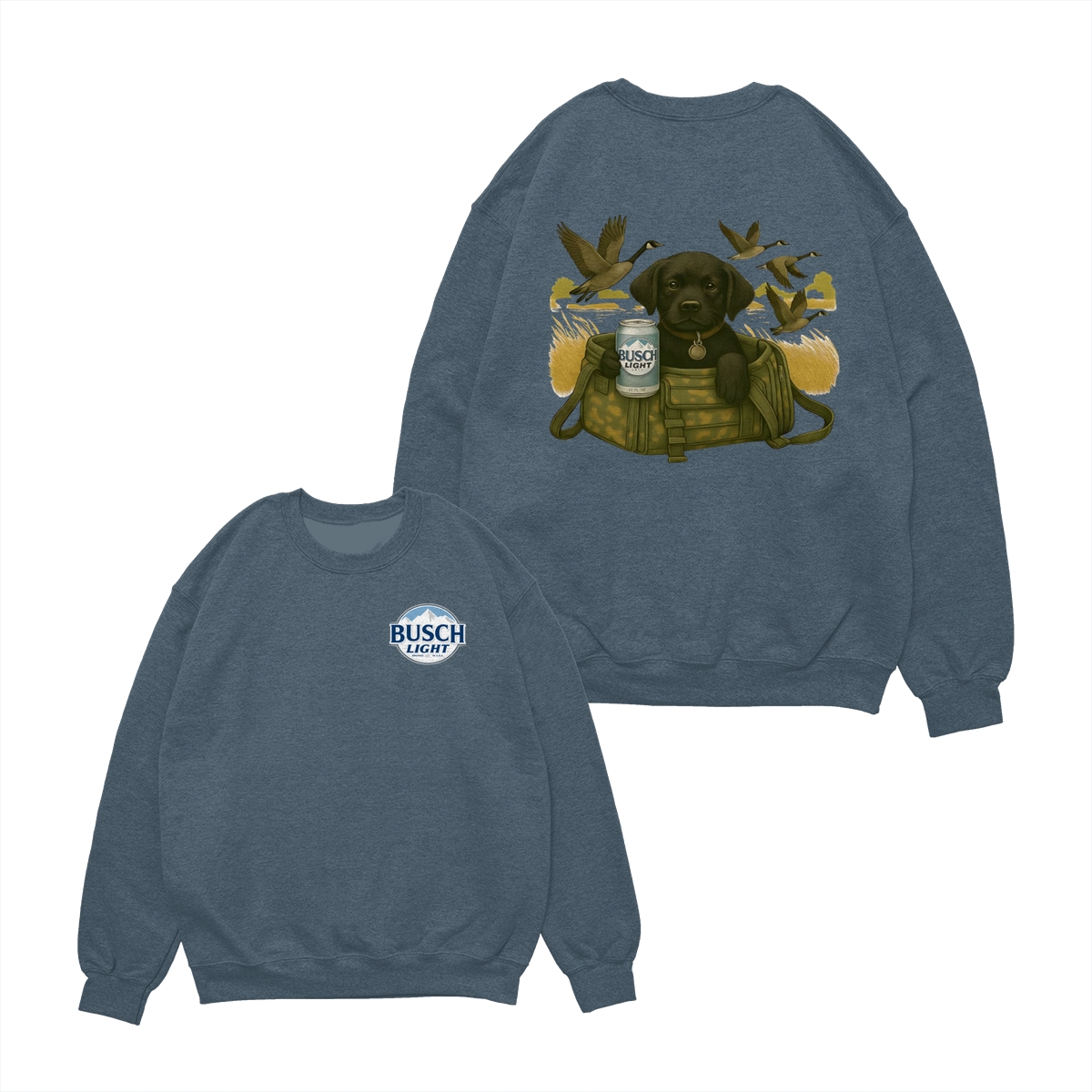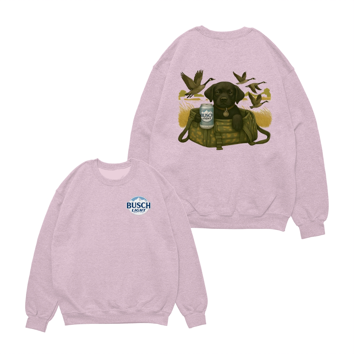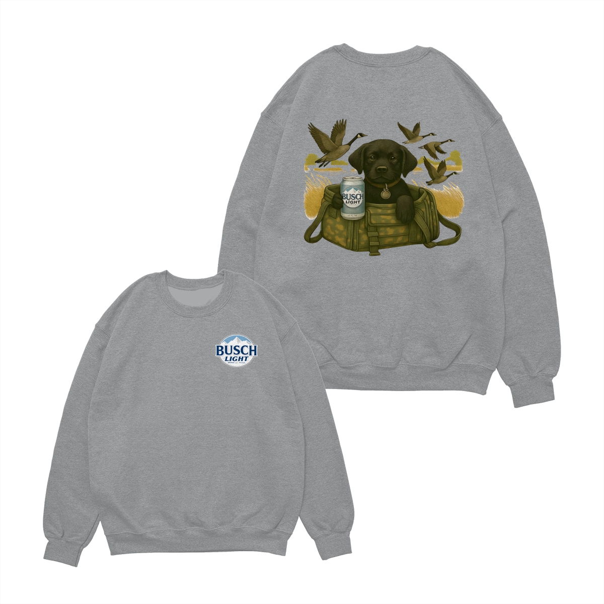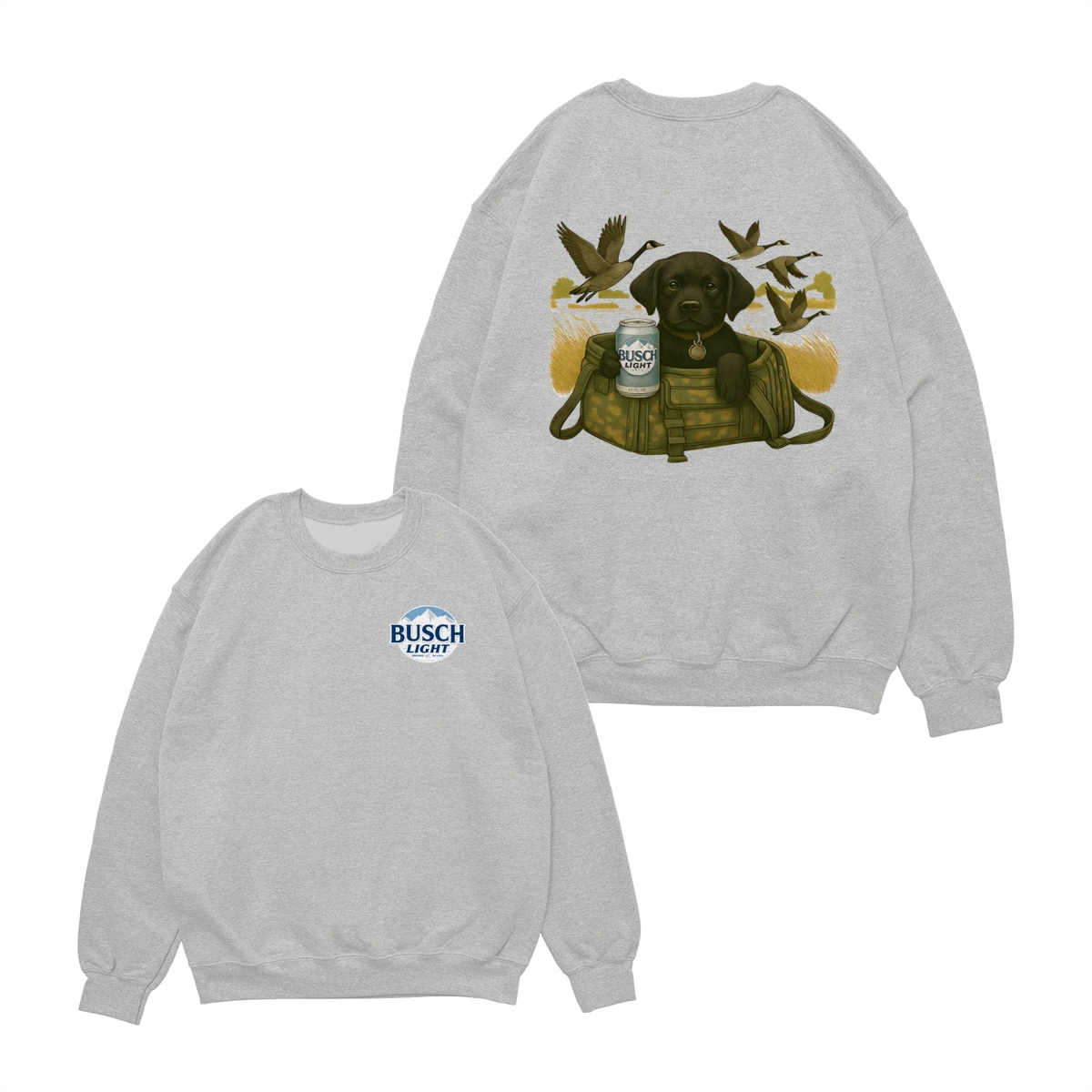 Busch Light Black Labrador Puppy Hunting Unisex T-Shirt, Camo Bag Graphic Tee, Gift for Dog Lover, Puppy Owner Mama, Duck Hunting, Funny Dog with Beer, For Men and Women
