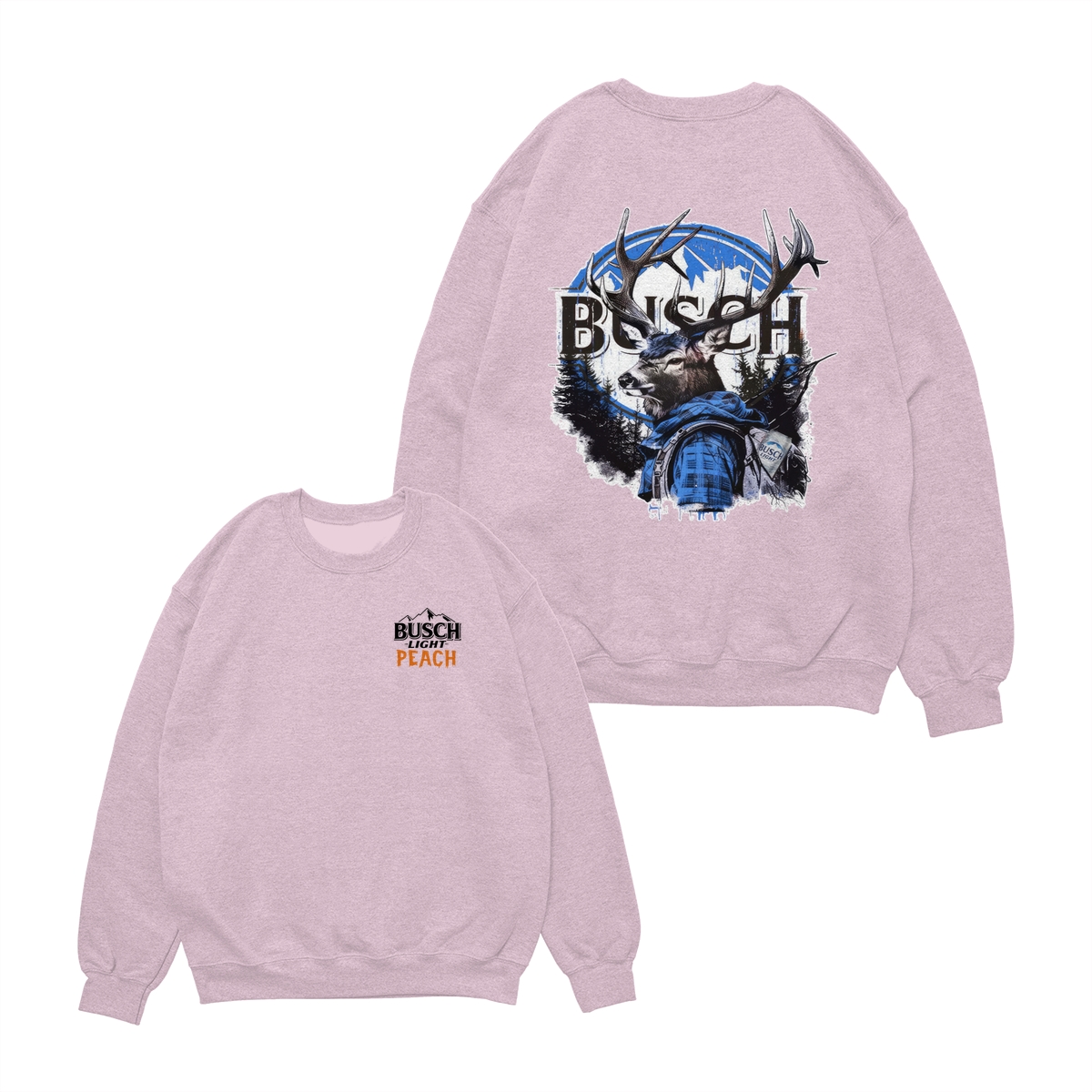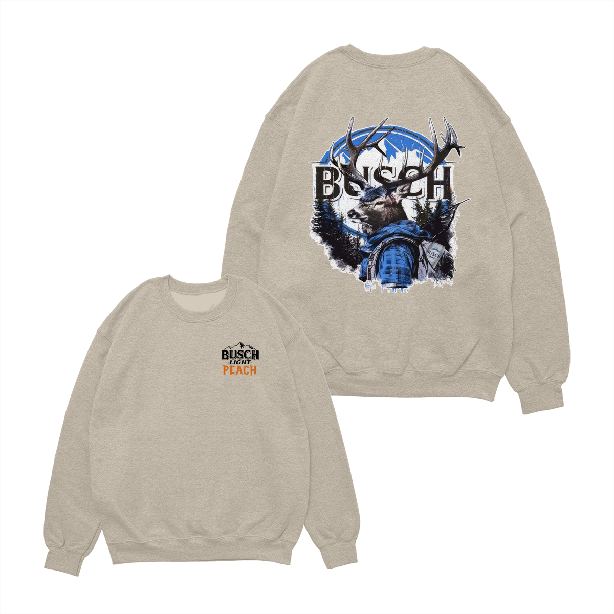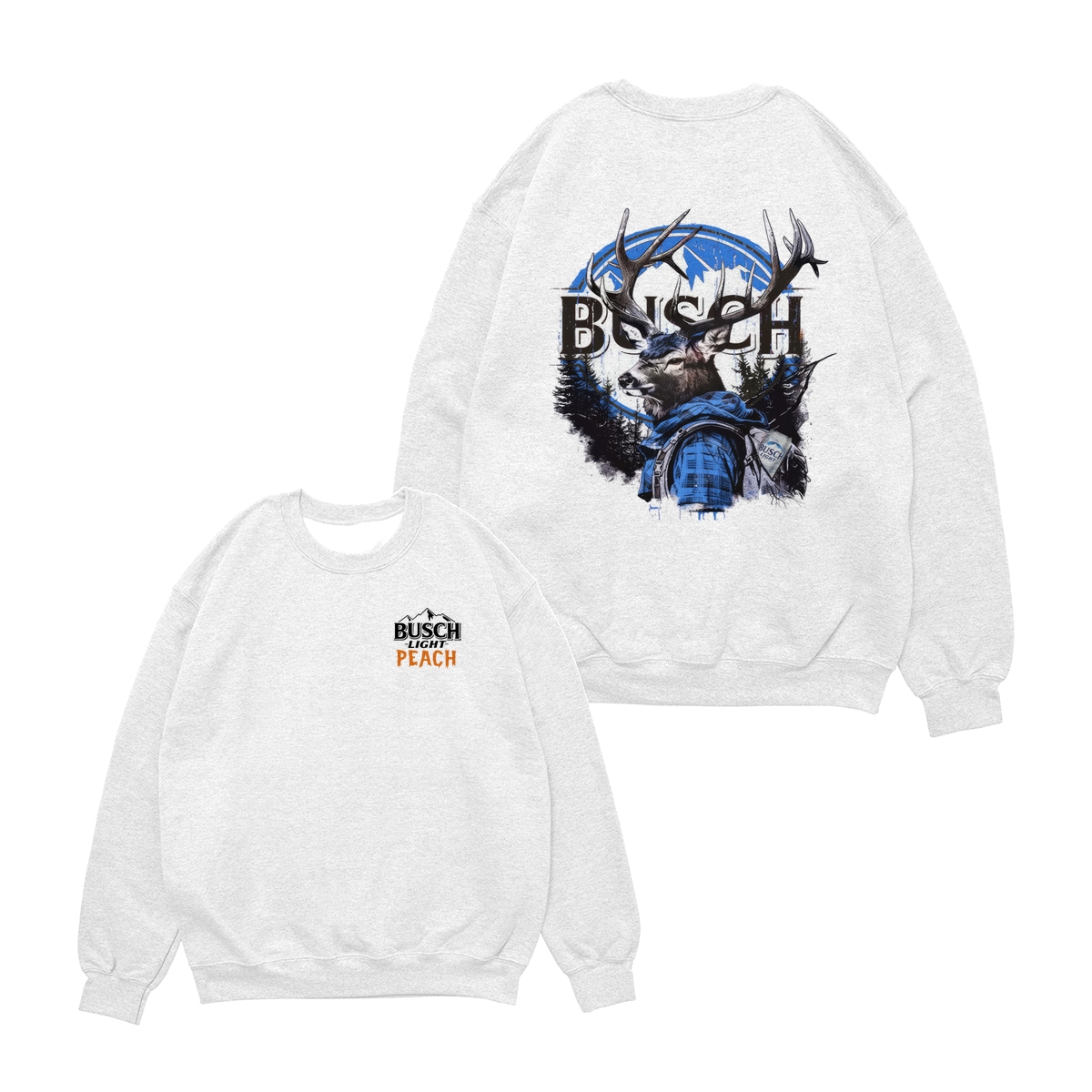 Busch Light Peach Hunting T-Shirt – Beer Merchandise for Hunters, Outdoorsmen, and Nature Enthusiasts, Premium White Cotton Tee with Small Chest Logo, Large Deer Wearing Plaid Shirt Graphic on the Back, Stylish and Comfortable Unisex for Men and Women