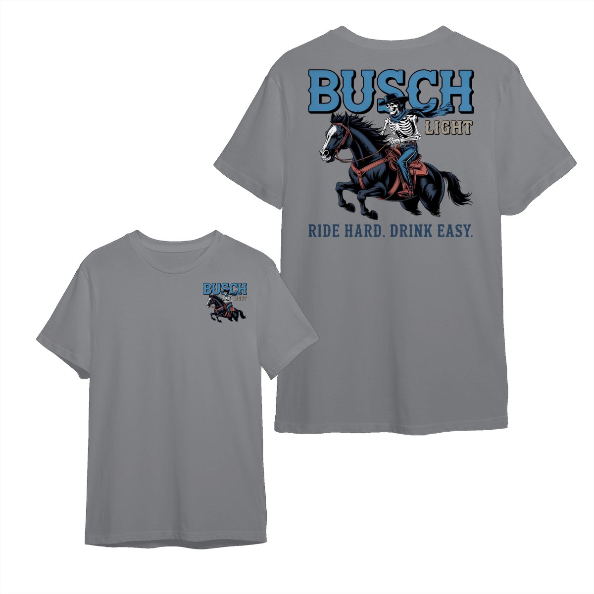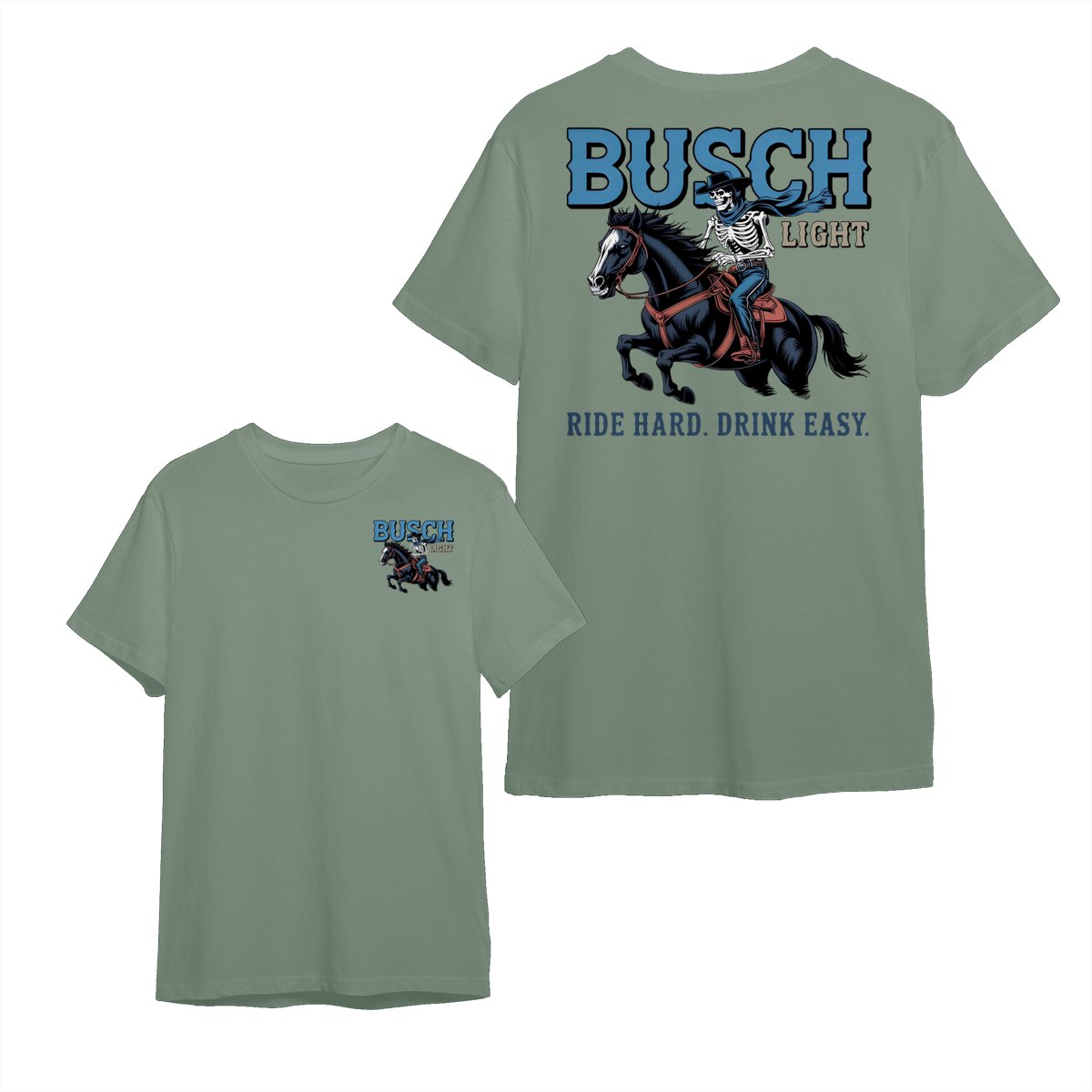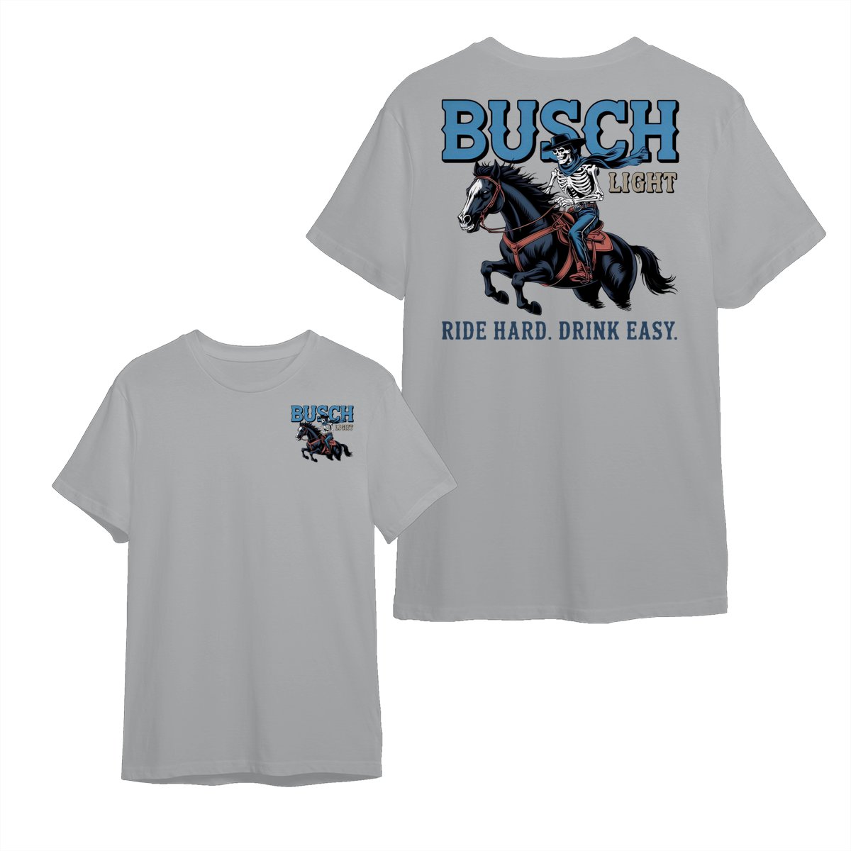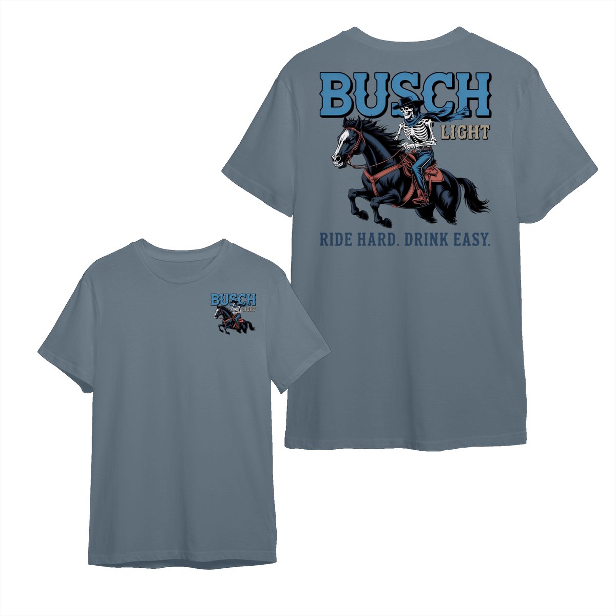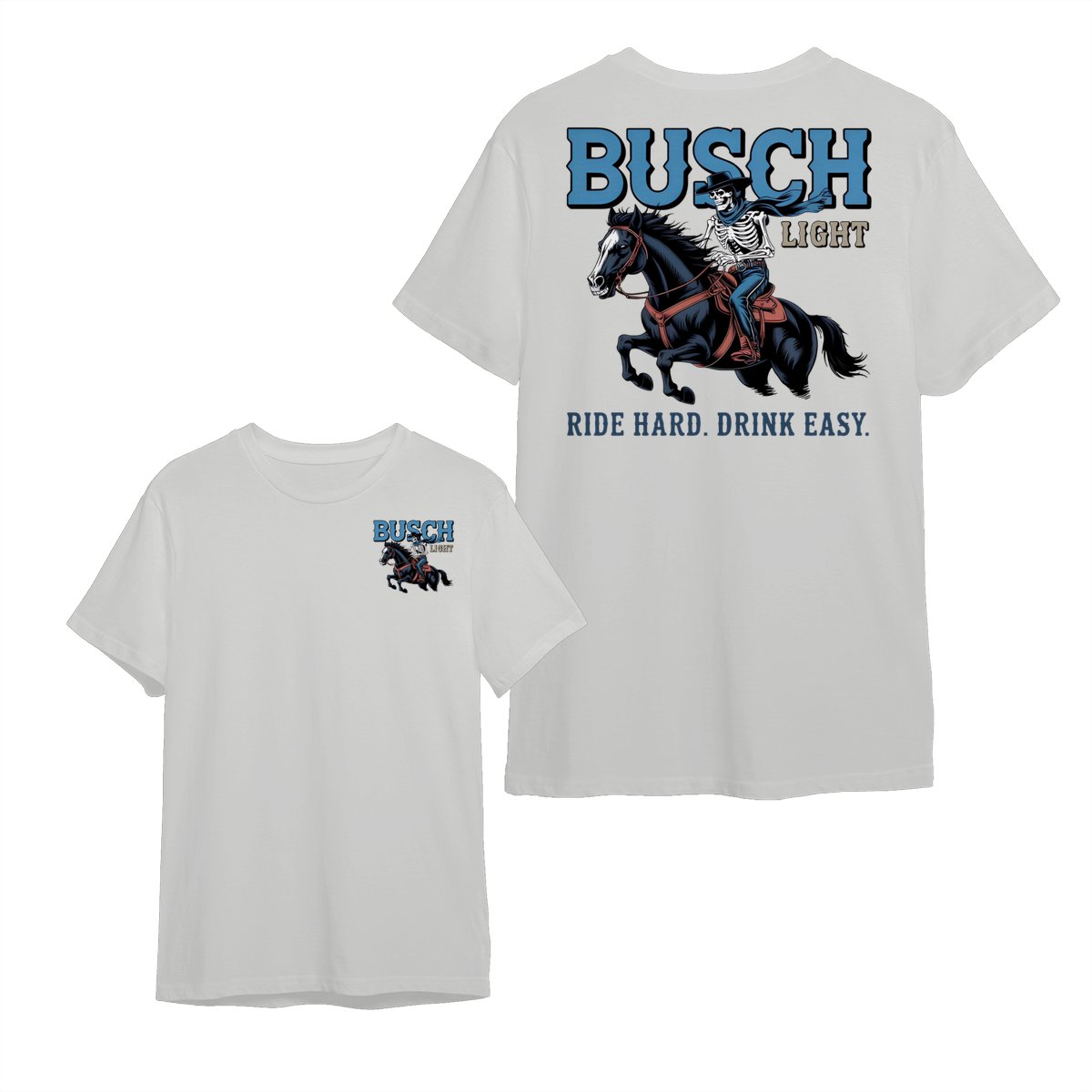 Busch Light Ride Hard Drink Easy T-Shirt – Skeleton Cowboy on Horse Graphic Tee, Vintage Rodeo Country Shirt for Men and Women, Beer Lover Gift Idea.