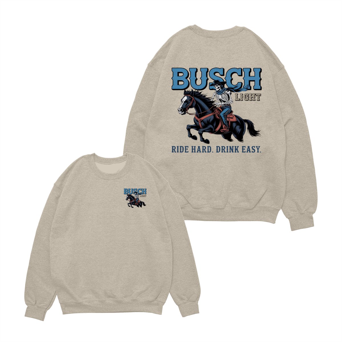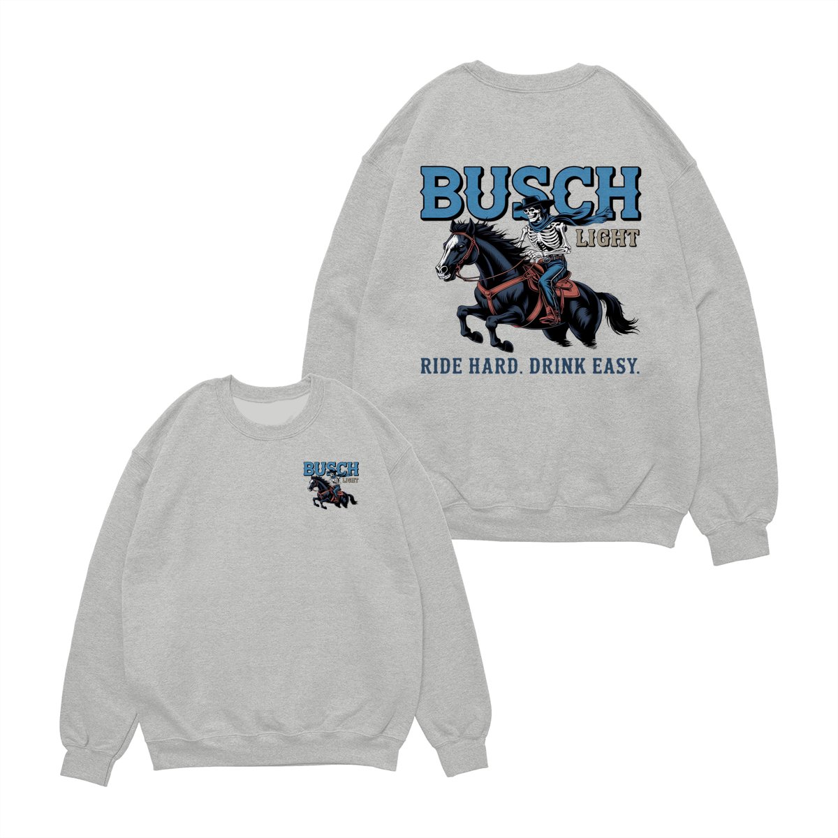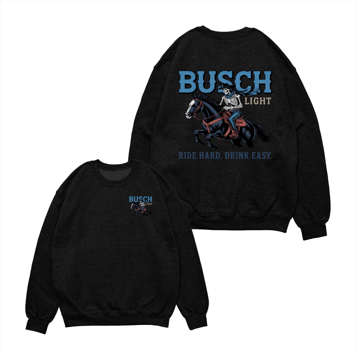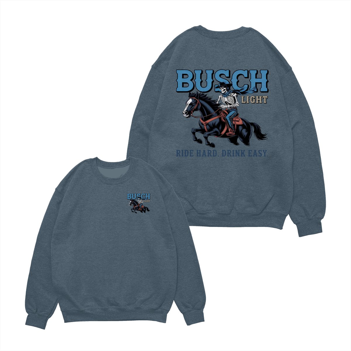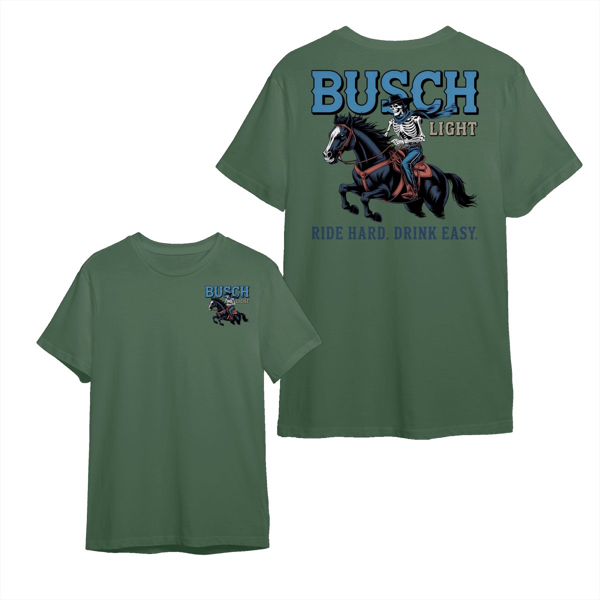 Busch Light Ride Hard Drink Easy T-Shirt – Skeleton Cowboy on Horse Graphic Tee, Vintage Rodeo Country Shirt for Men and Women, Beer Lover Gift Idea.