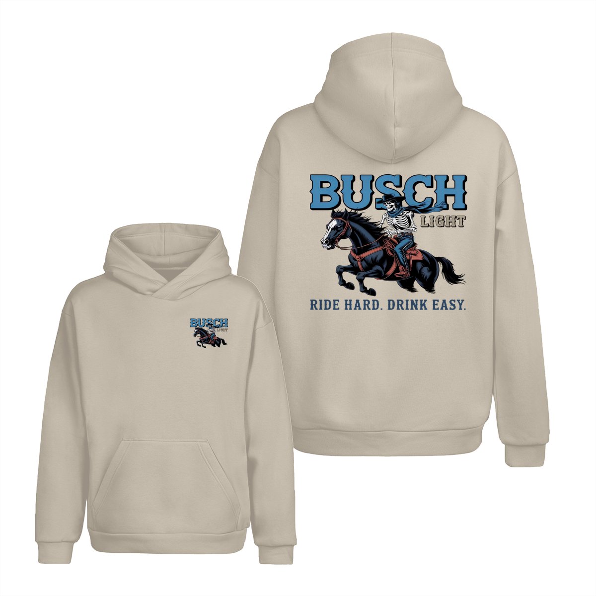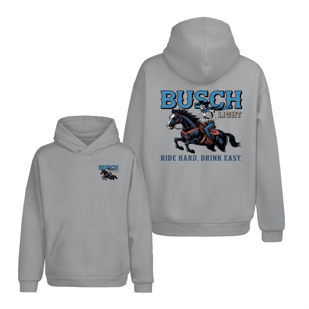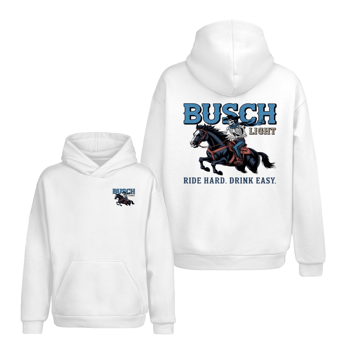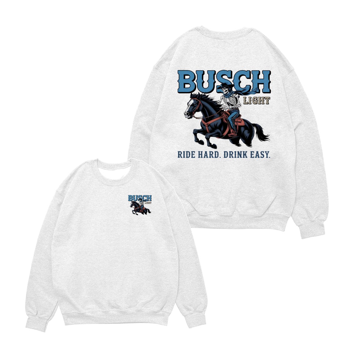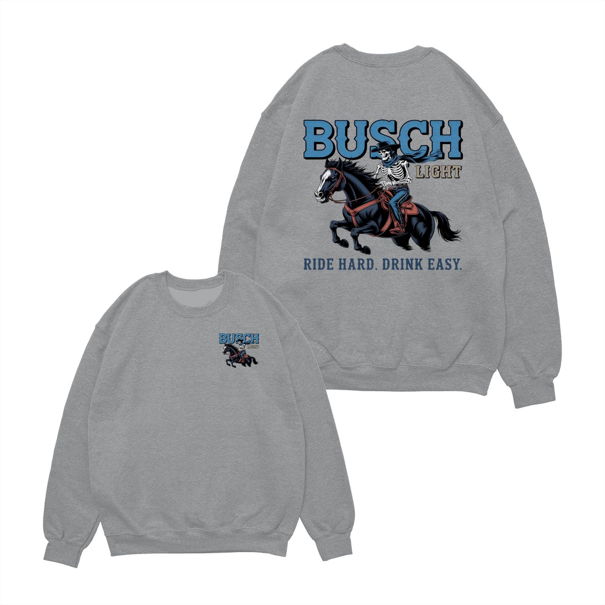 Busch Light Ride Hard Drink Easy T-Shirt – Skeleton Cowboy on Horse Graphic Tee, Vintage Rodeo Country Shirt for Men and Women, Beer Lover Gift Idea.