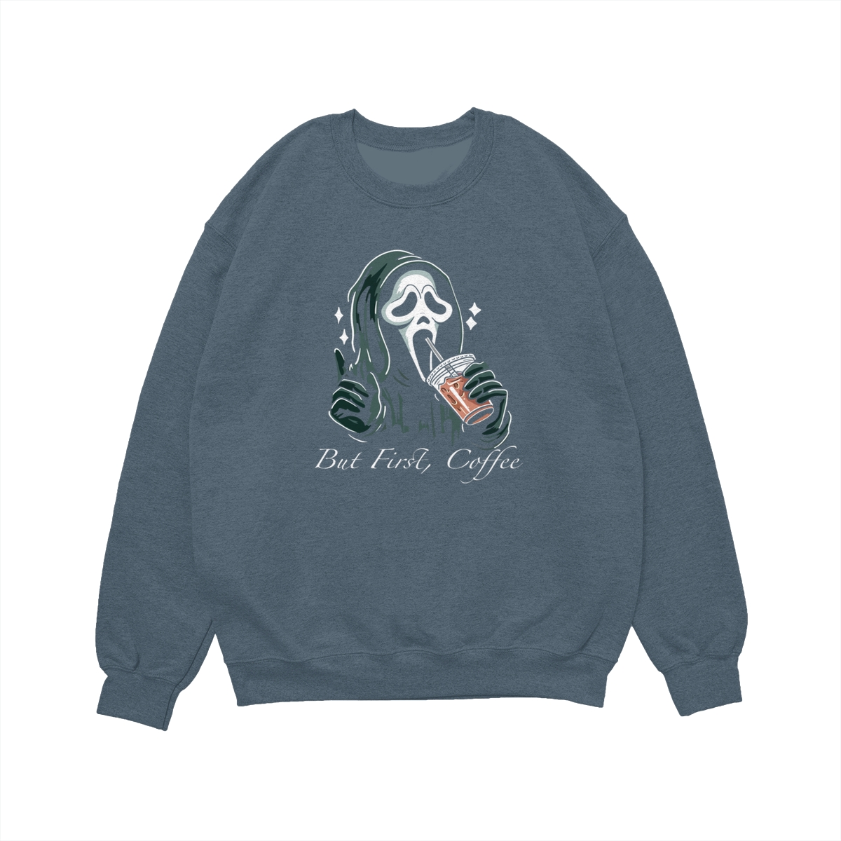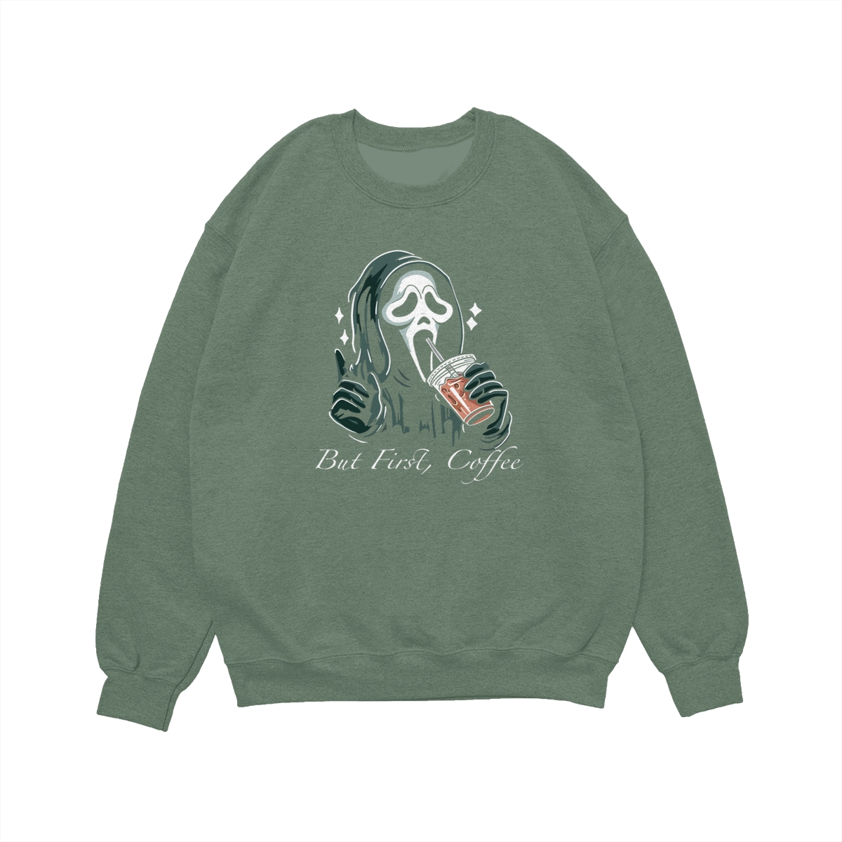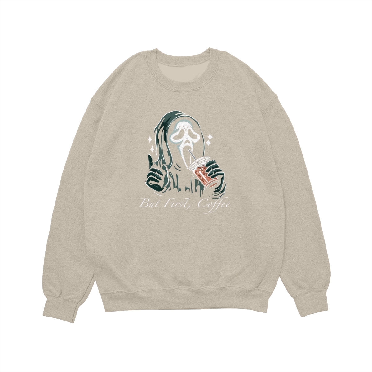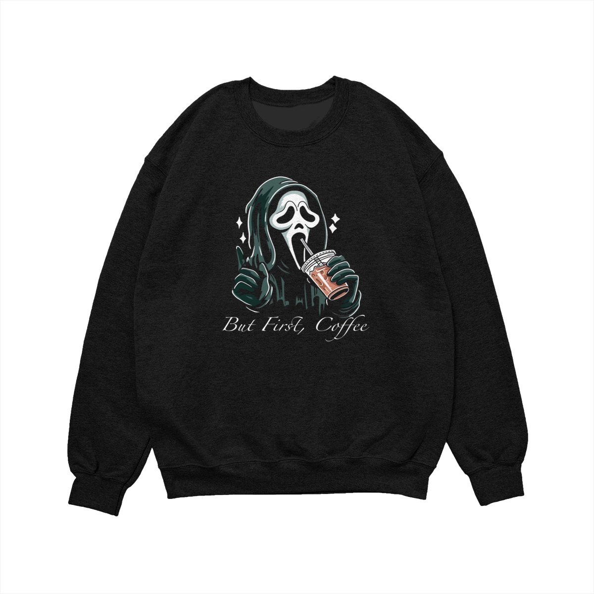 But First Coffee Halloween Shirt – Funny Ghost Face Horror Graphic Pullover, Spooky Coffee Lover Shirt, Cozy Fall Outfit Unisex Streetwear Tops Womenswear