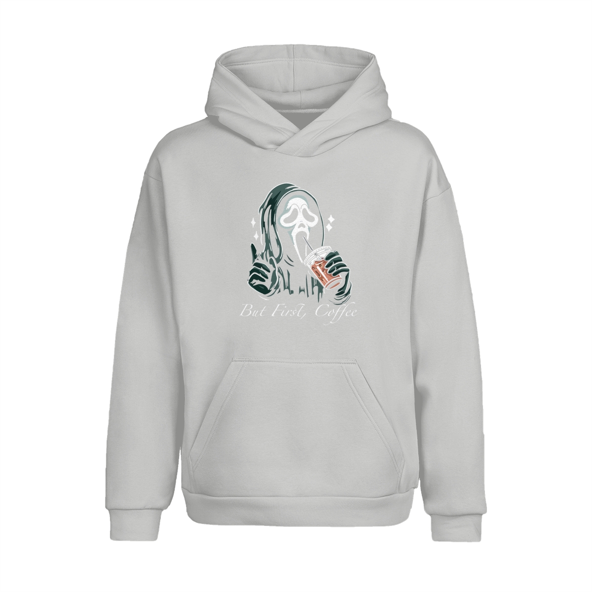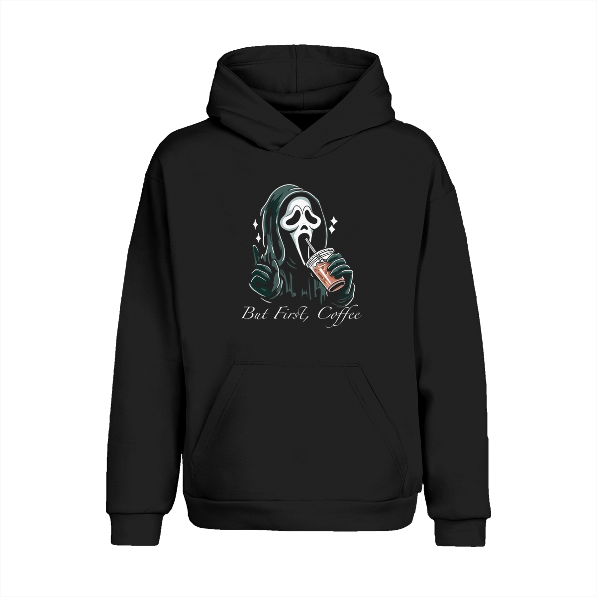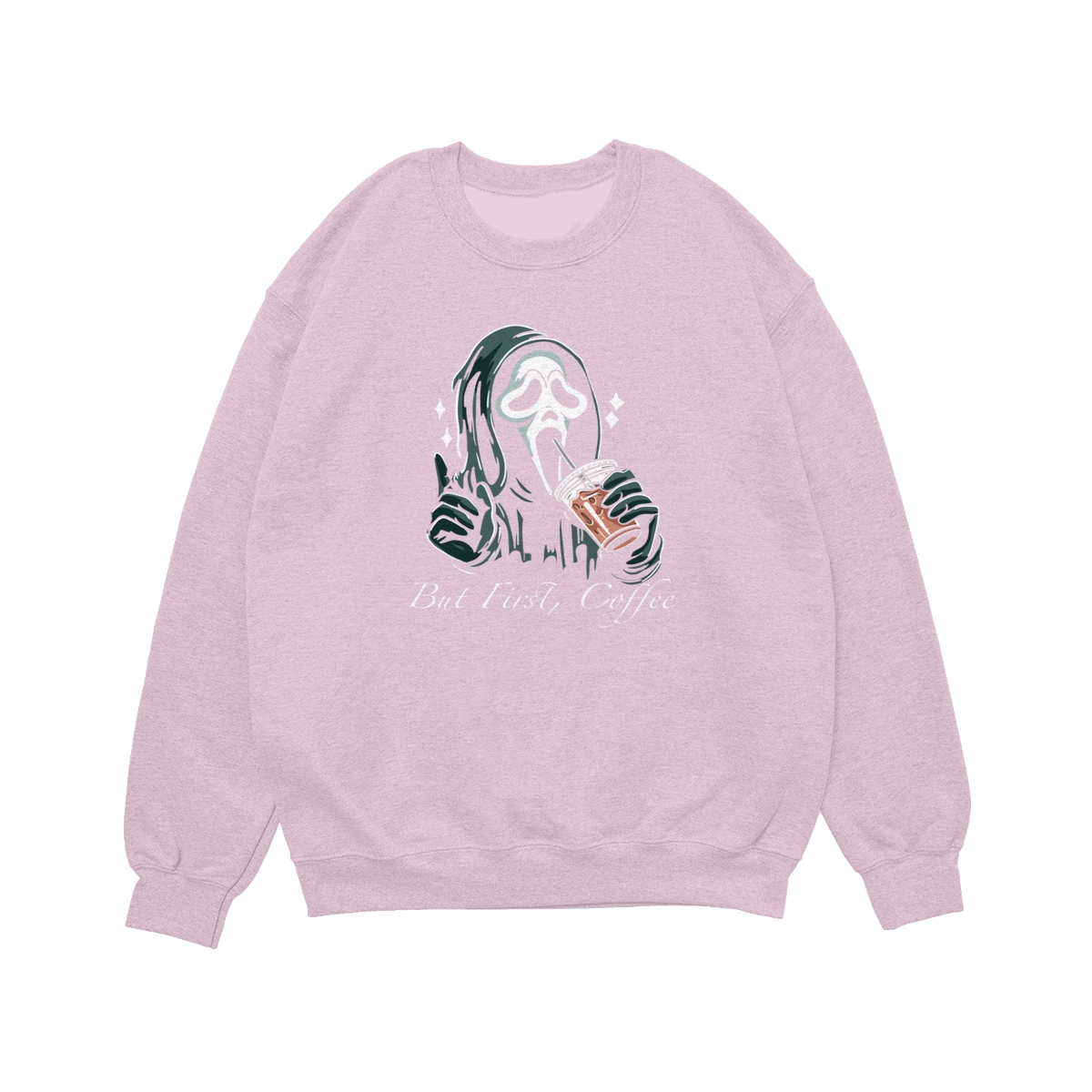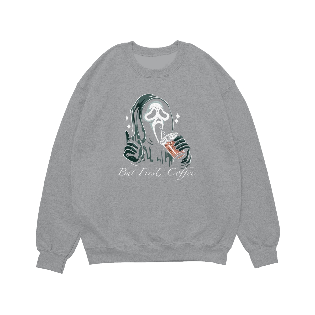 But First Coffee Halloween Shirt – Funny Ghost Face Horror Graphic Pullover, Spooky Coffee Lover Shirt, Cozy Fall Outfit Unisex Streetwear Tops Womenswear