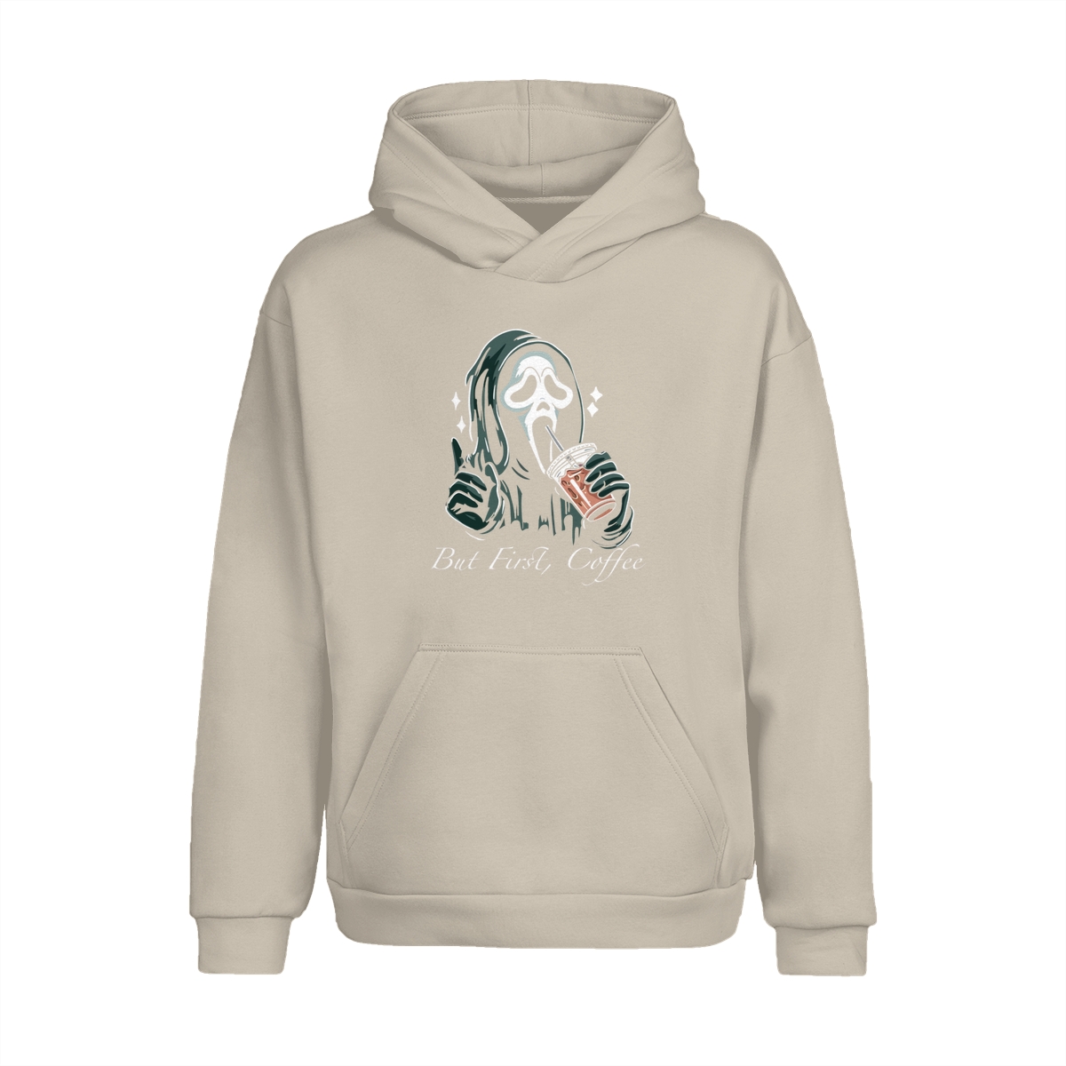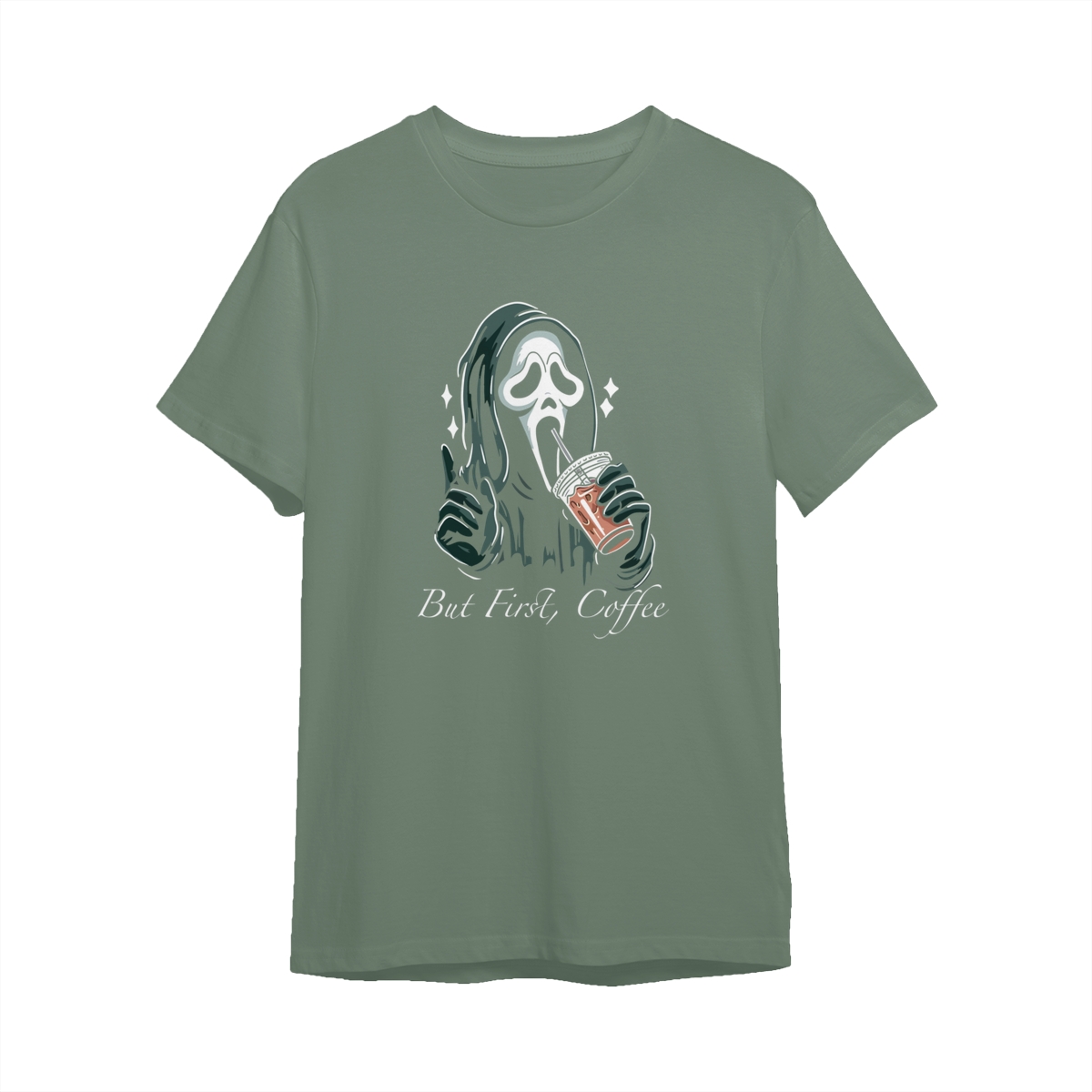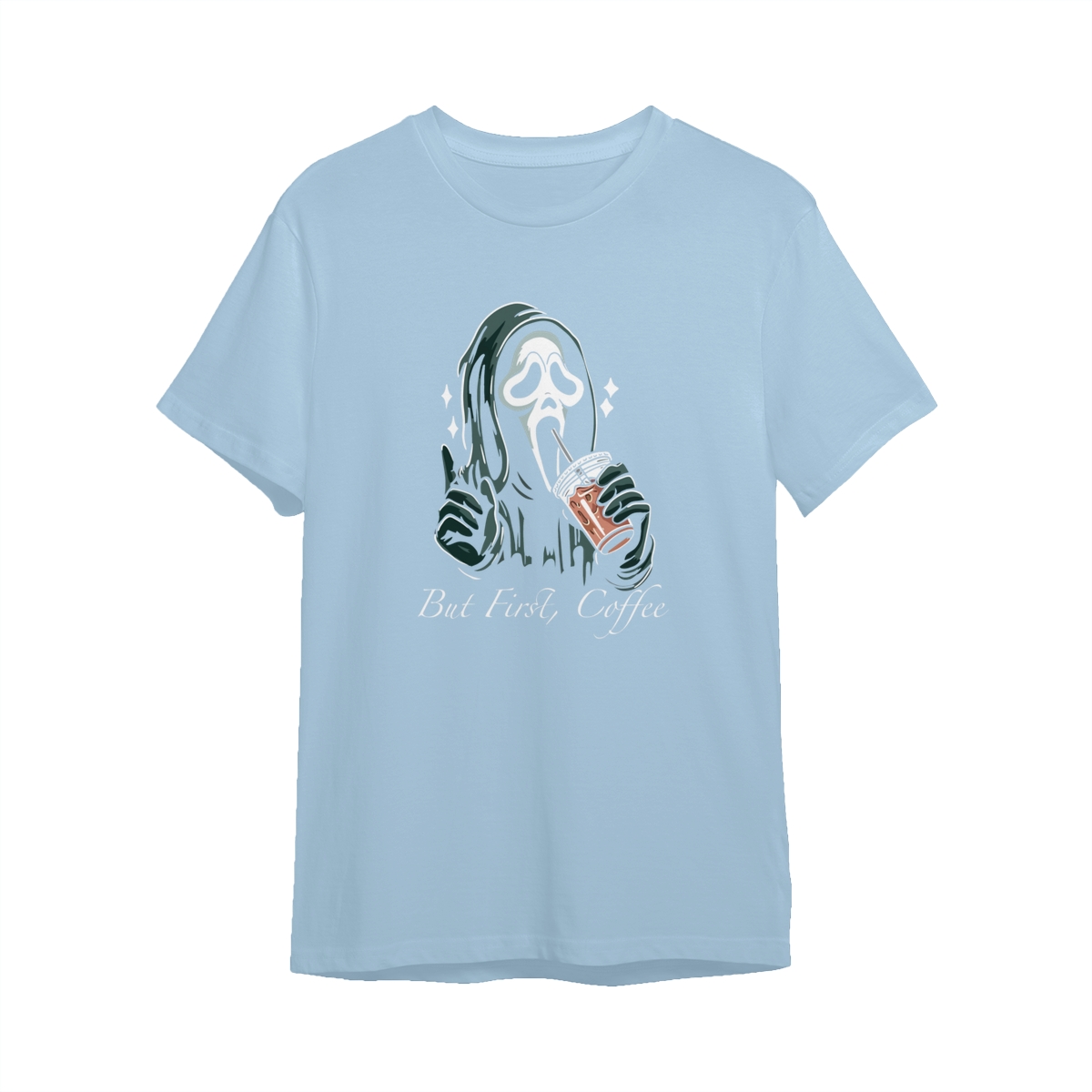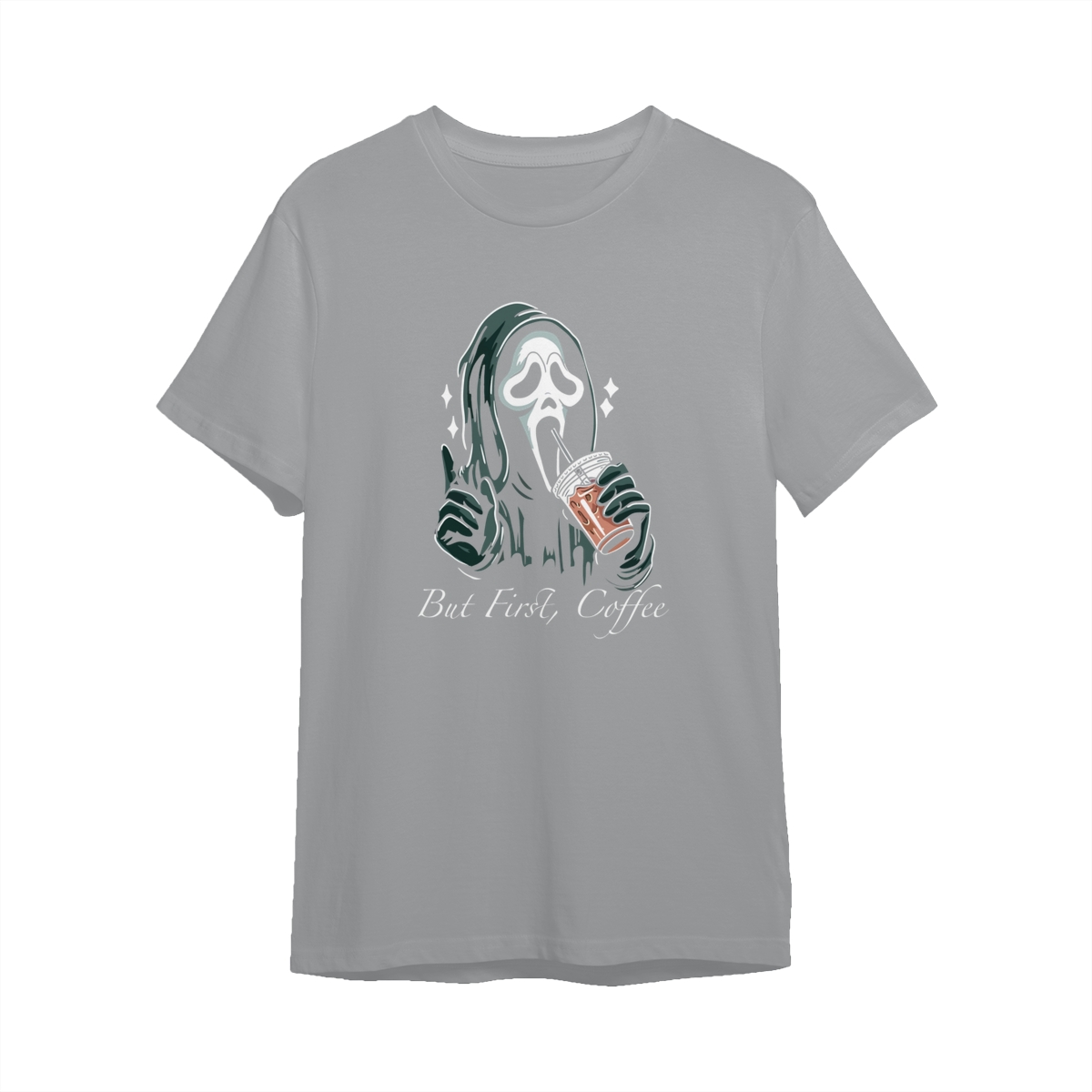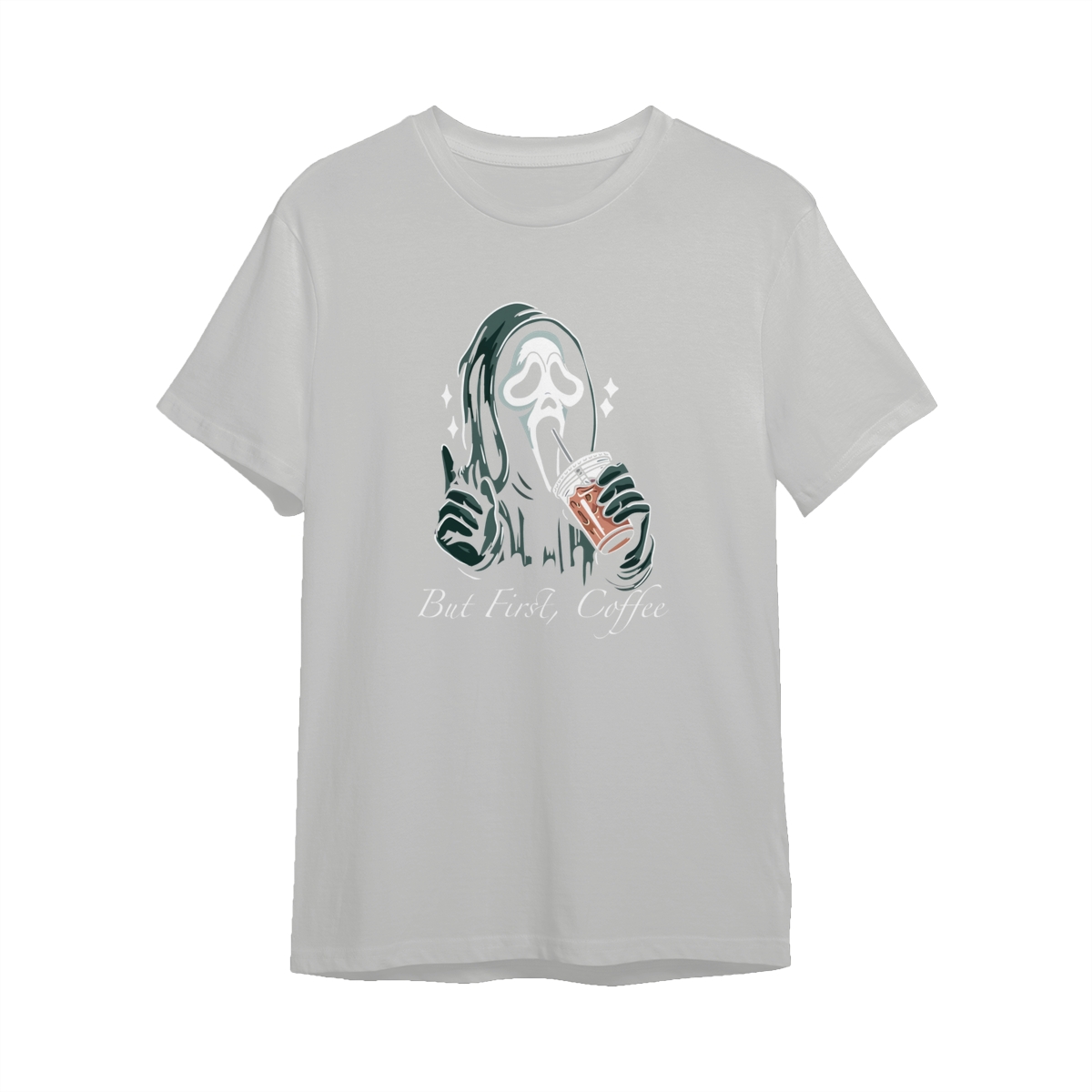 But First Coffee Halloween Shirt – Funny Ghost Face Horror Graphic Pullover, Spooky Coffee Lover Shirt, Cozy Fall Outfit Unisex Streetwear Tops Womenswear