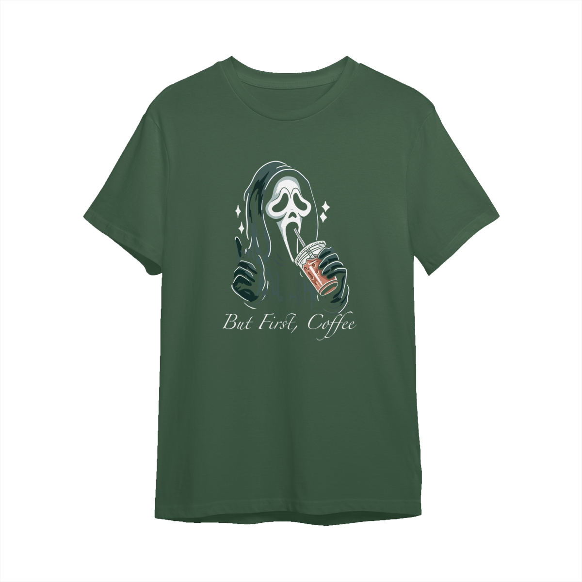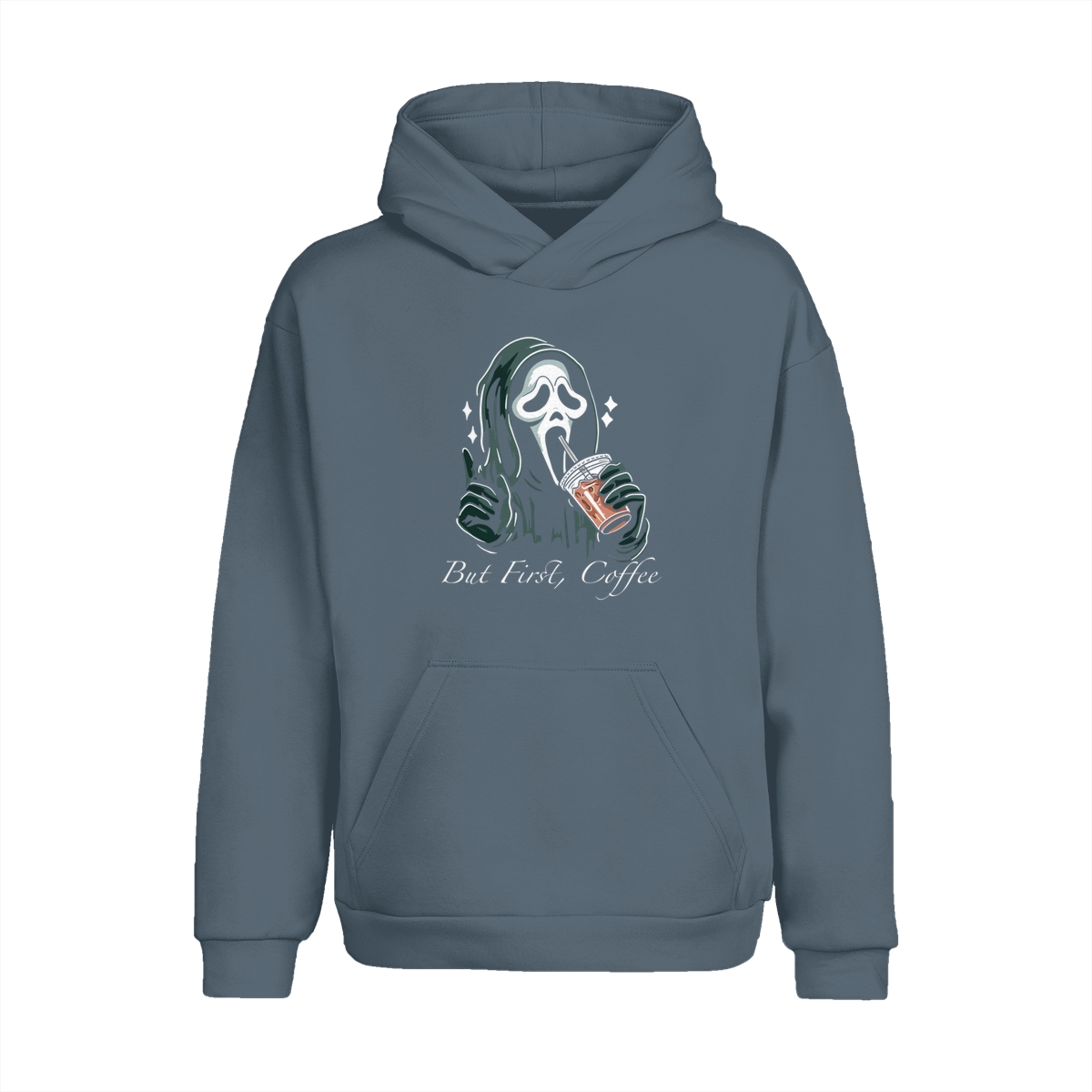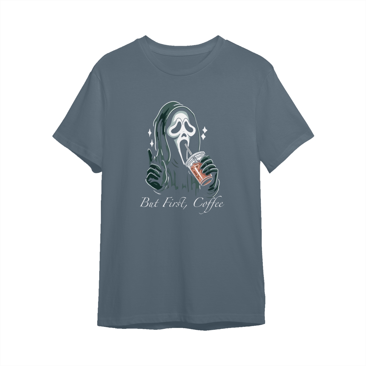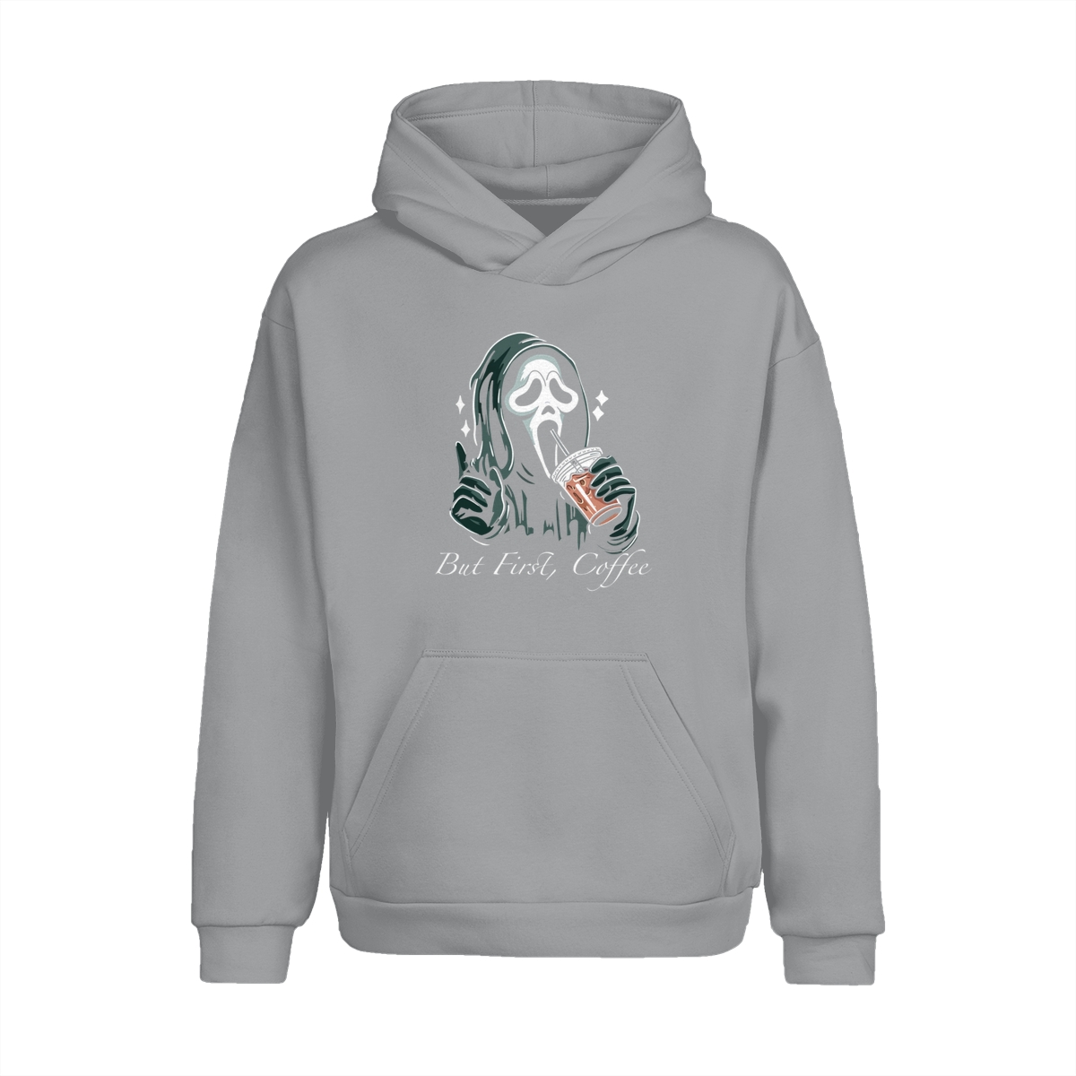 But First Coffee Halloween Shirt – Funny Ghost Face Horror Graphic Pullover, Spooky Coffee Lover Shirt, Cozy Fall Outfit Unisex Streetwear Tops Womenswear
