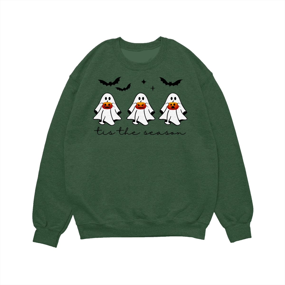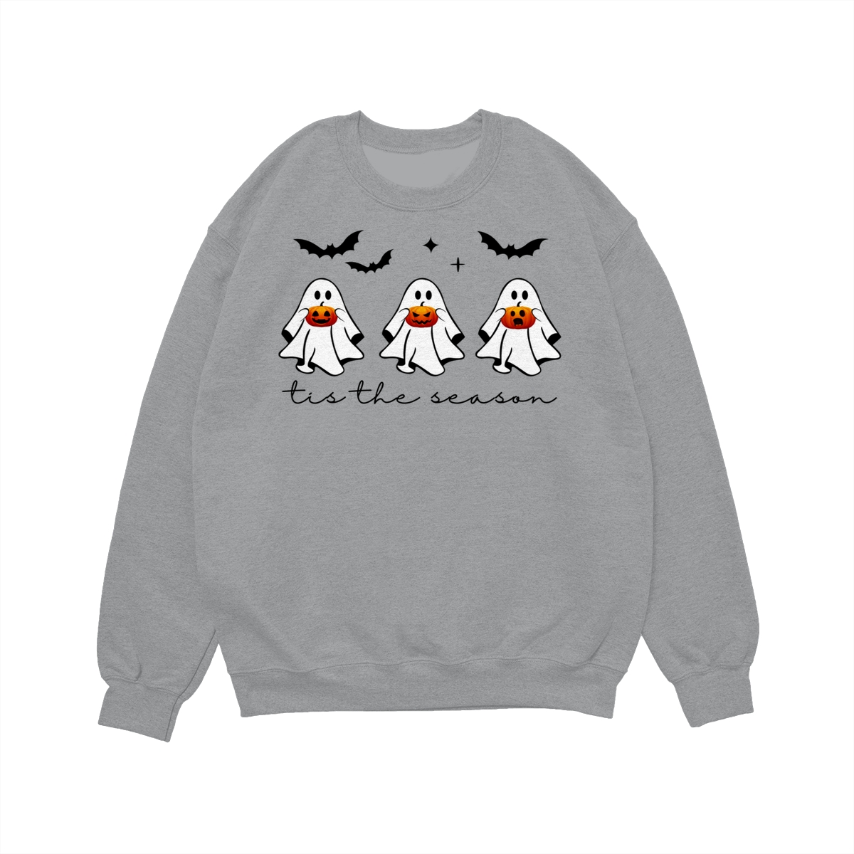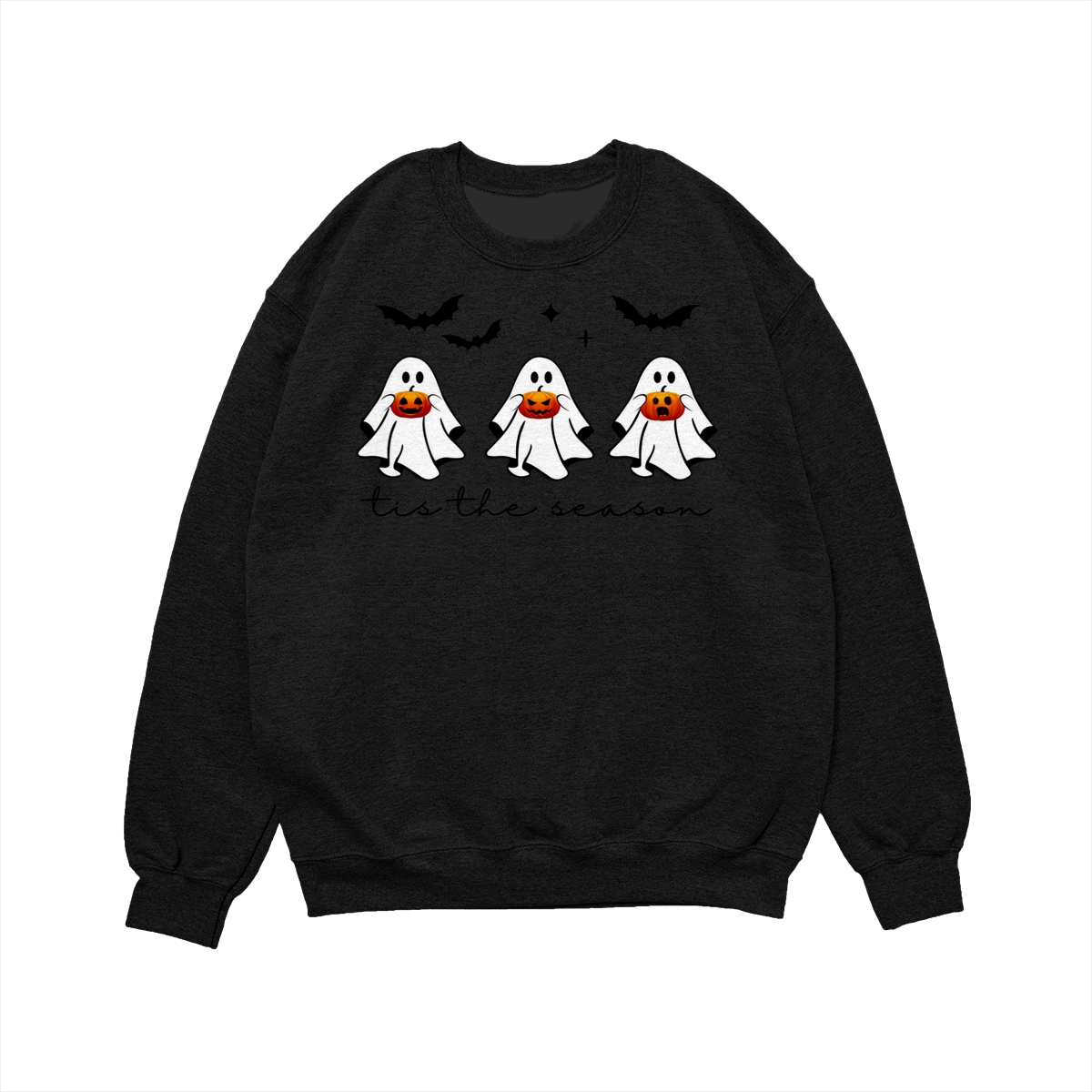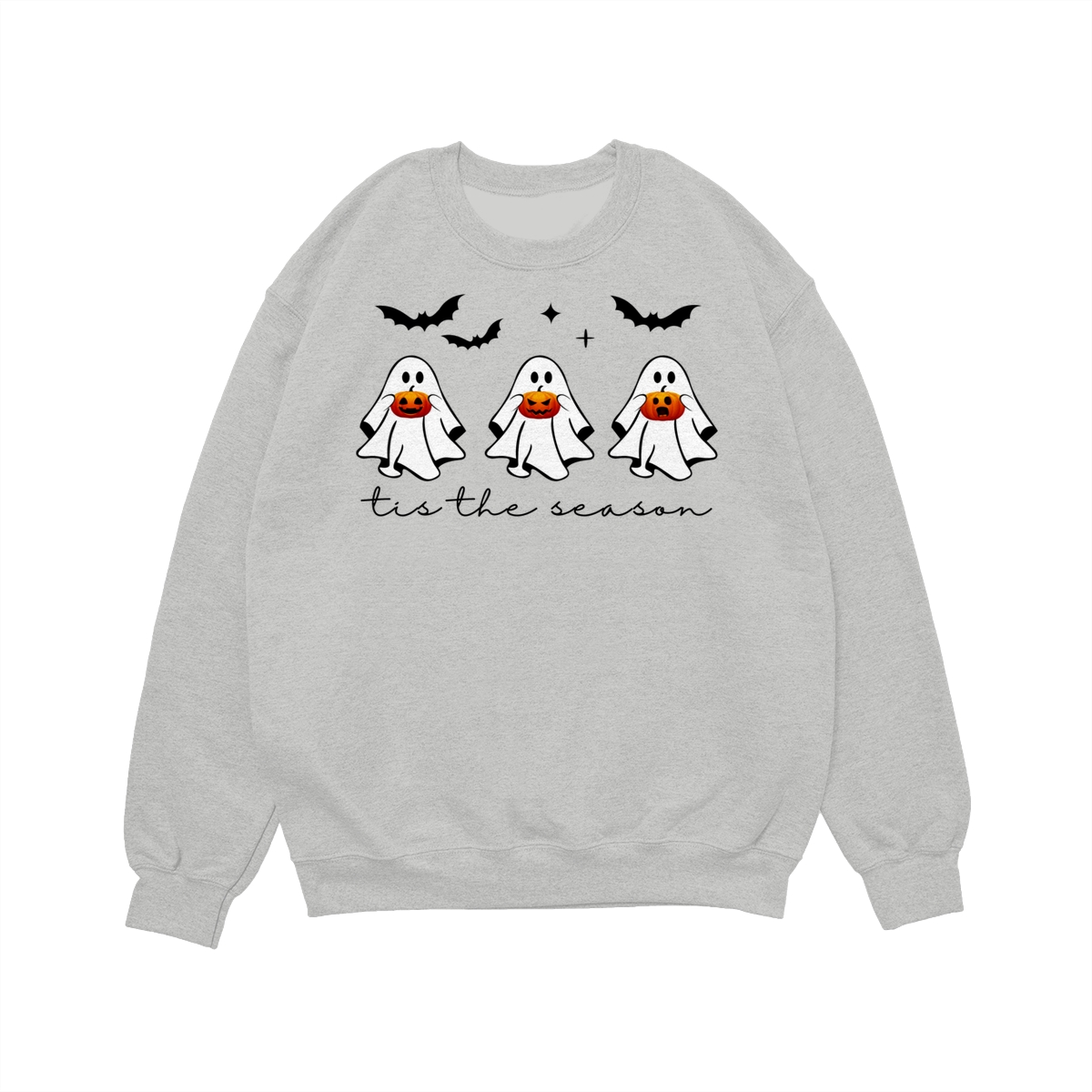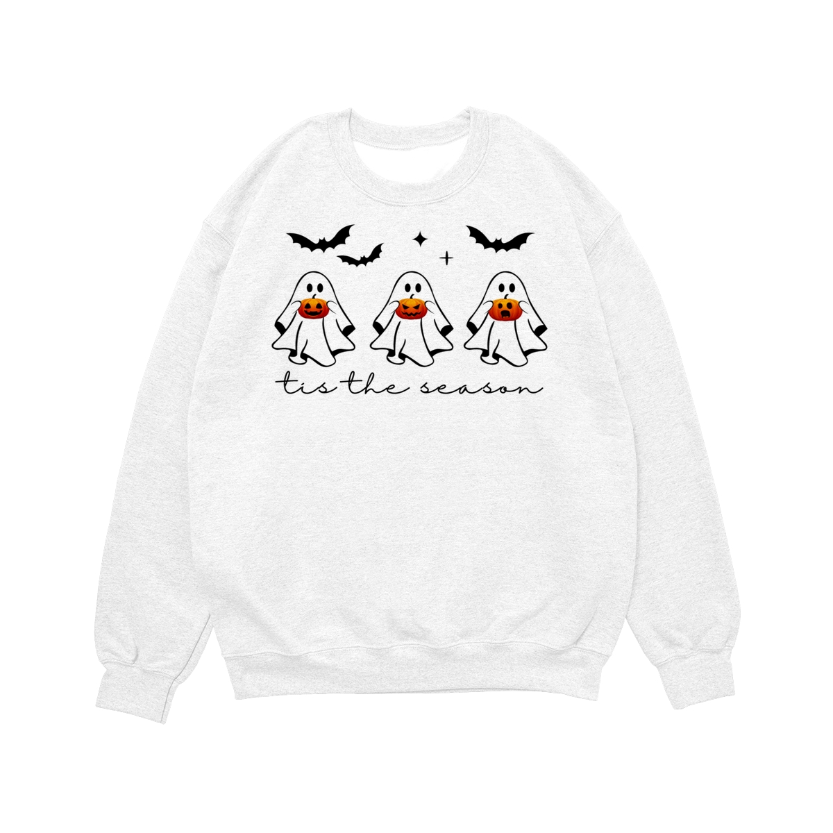 Cartoon Ghost & Bat & Letter Print Shirt, Halloween Themed Cute Casual Drop Shoulder Crew Neck Pullover for Daily Wear, Ladies Fall