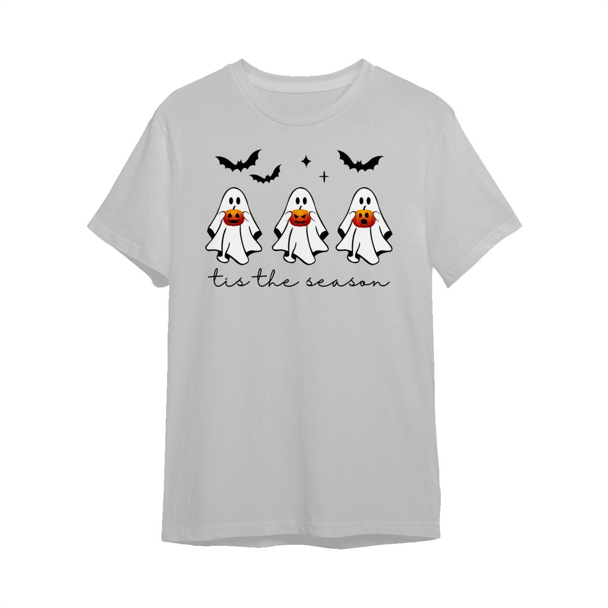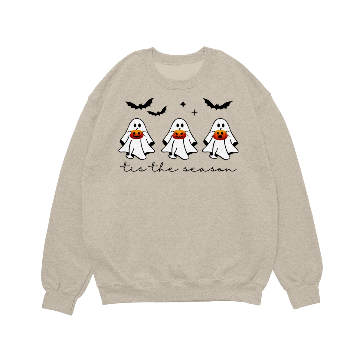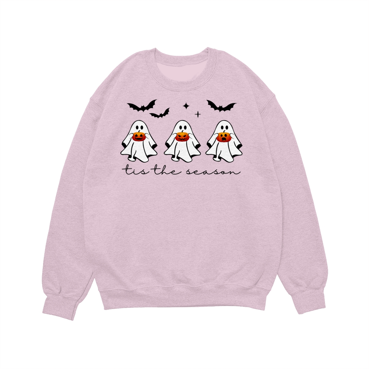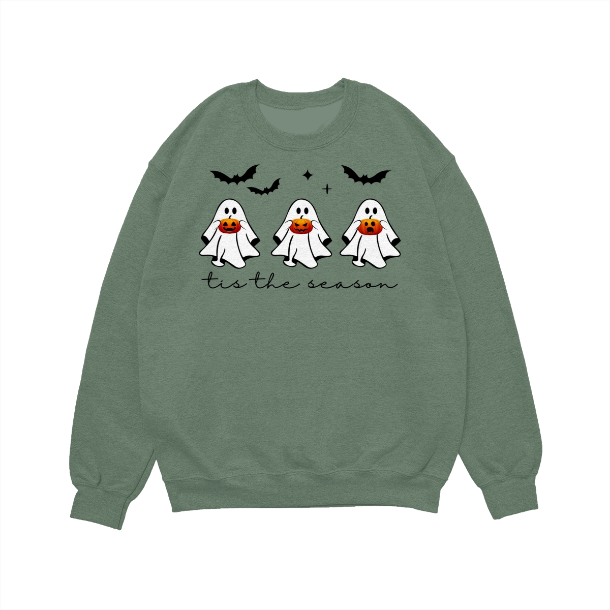 Cartoon Ghost & Bat & Letter Print Shirt, Halloween Themed Cute Casual Drop Shoulder Crew Neck Pullover for Daily Wear, Ladies Fall