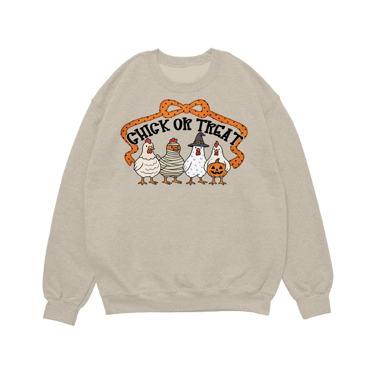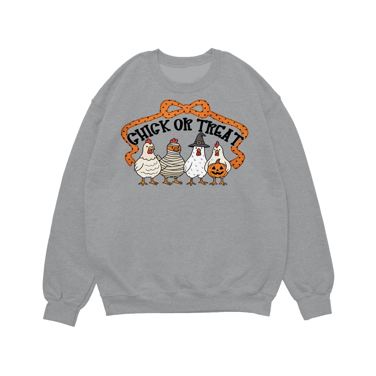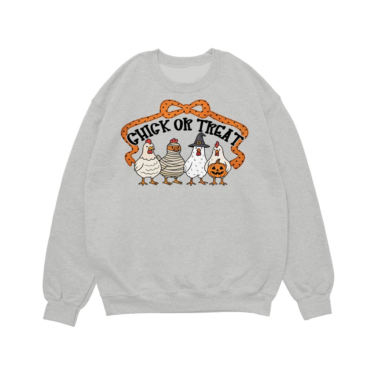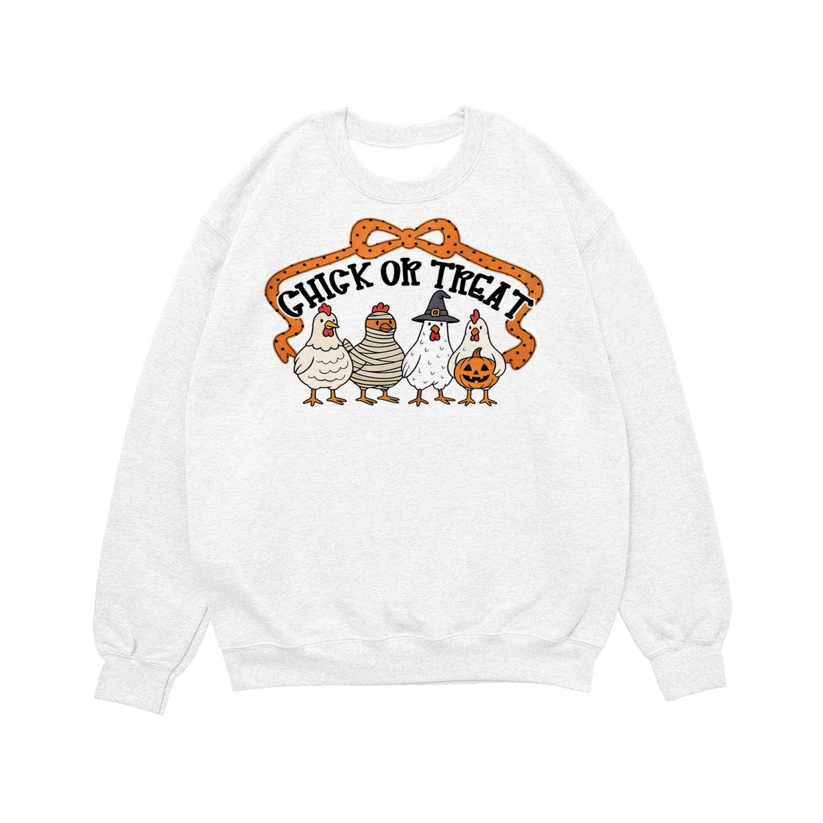 Chick or Treat Halloween TShirt/Sweatshirt/Hoodie – Funny Chicken Costume Design for Fall Cozy Unisex Sweater for Poultry Lovers TikTok Shop Store Women’s Casual Crewneck Long Sleeve 100% Cotton for Ash Colors
