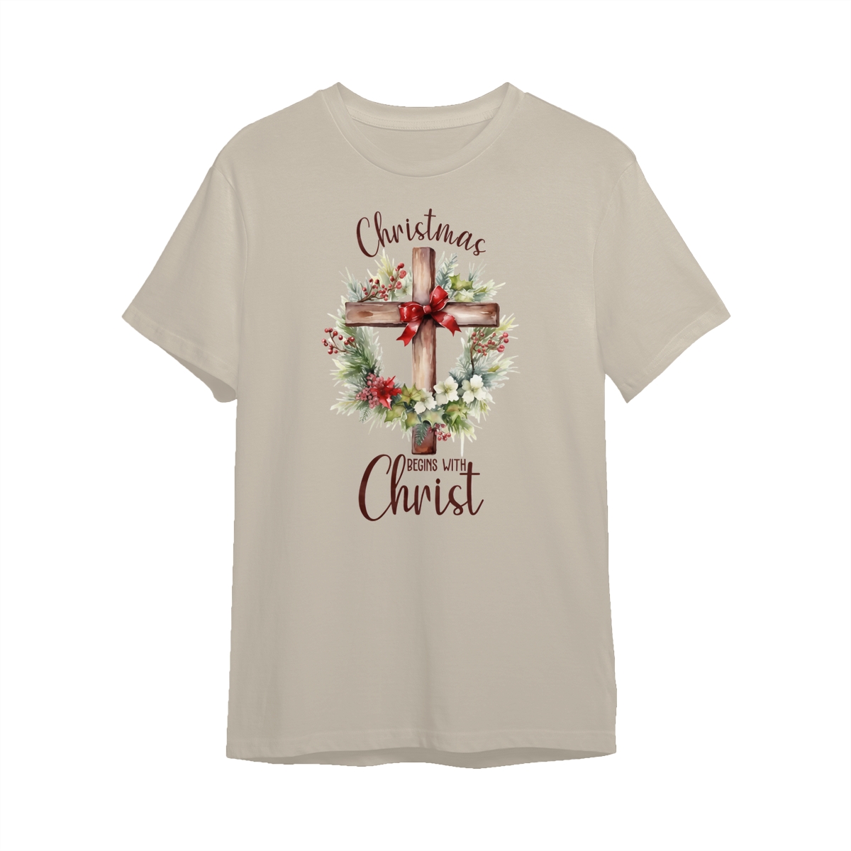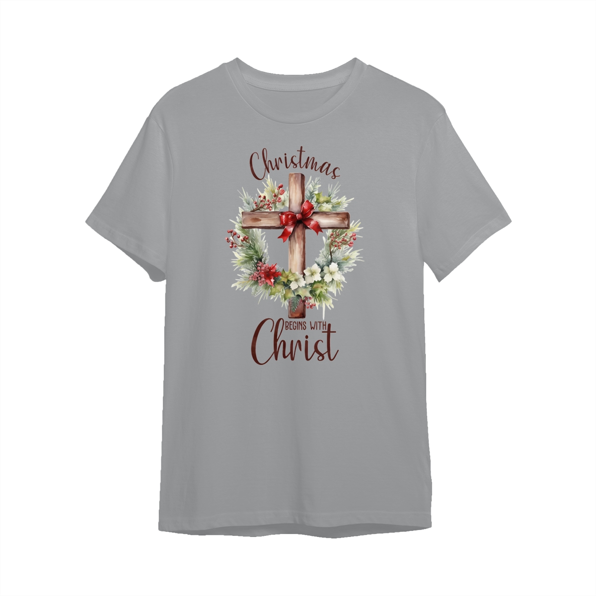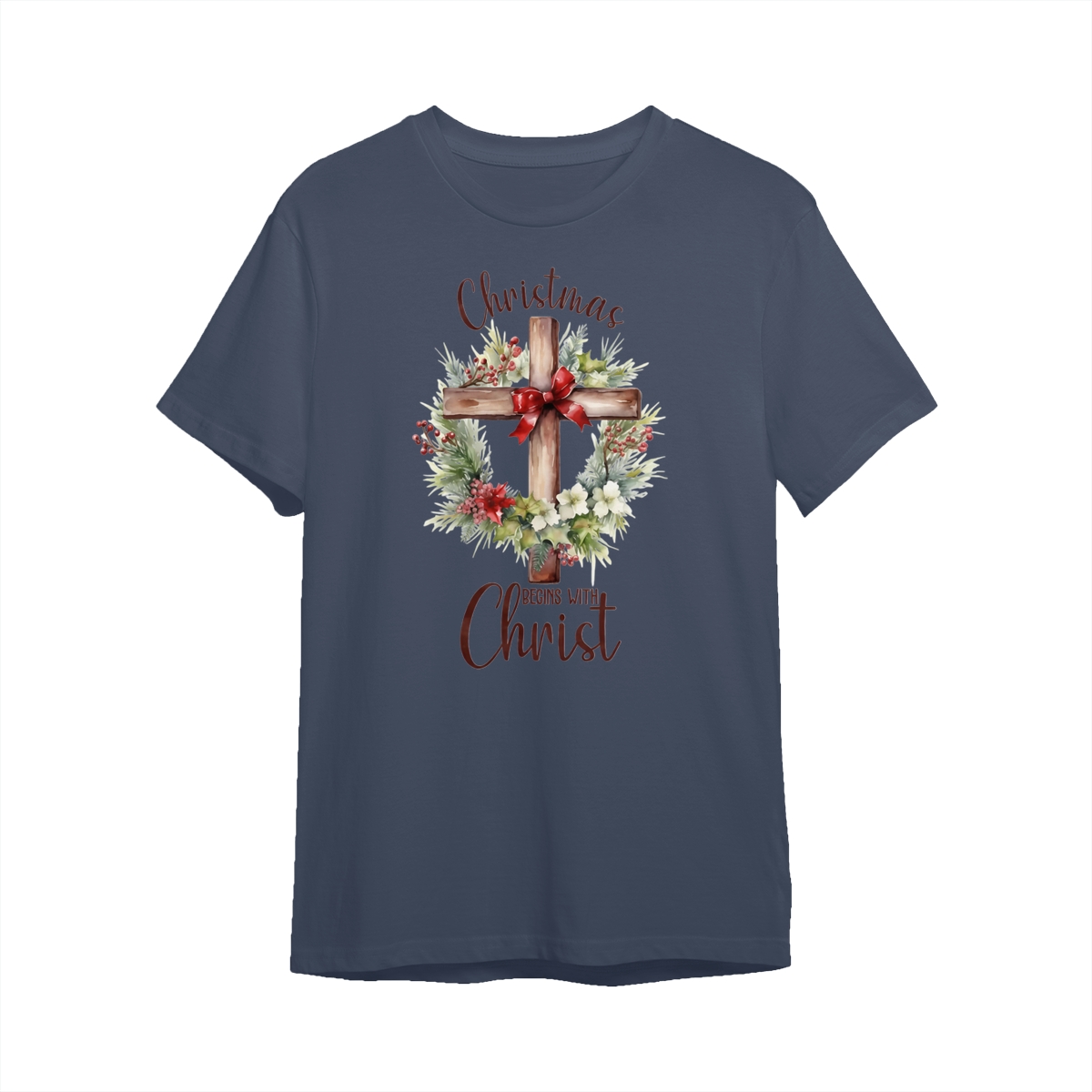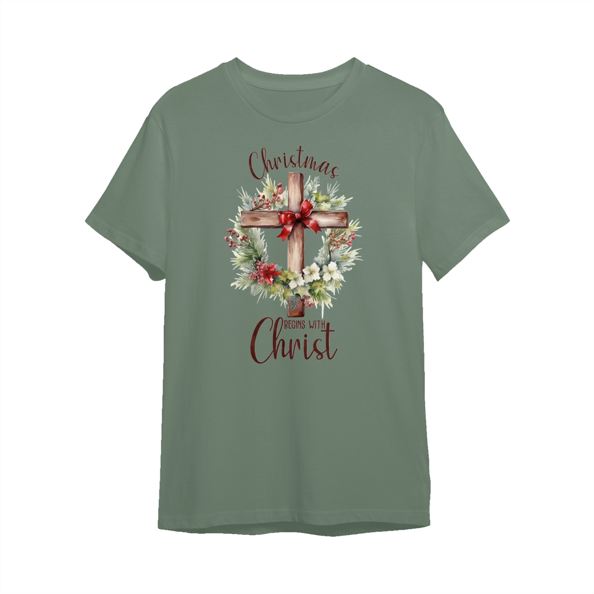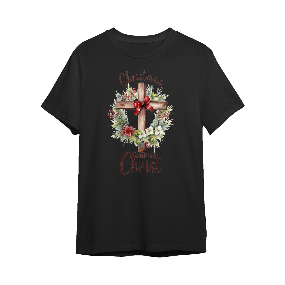 Christmas Begins With Christ T-Shirt – Faith Inspired Cross And Floral Wreath Design , Christian Holiday Unisex Tee , Religious Christmas Shirt , Meaningful Gift For Believers