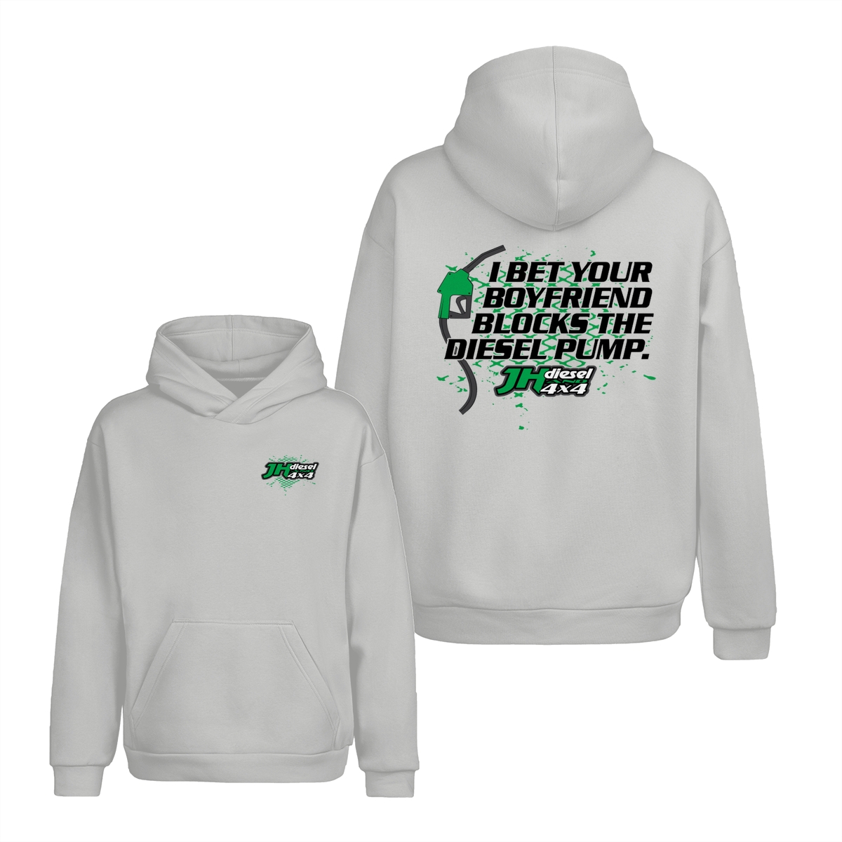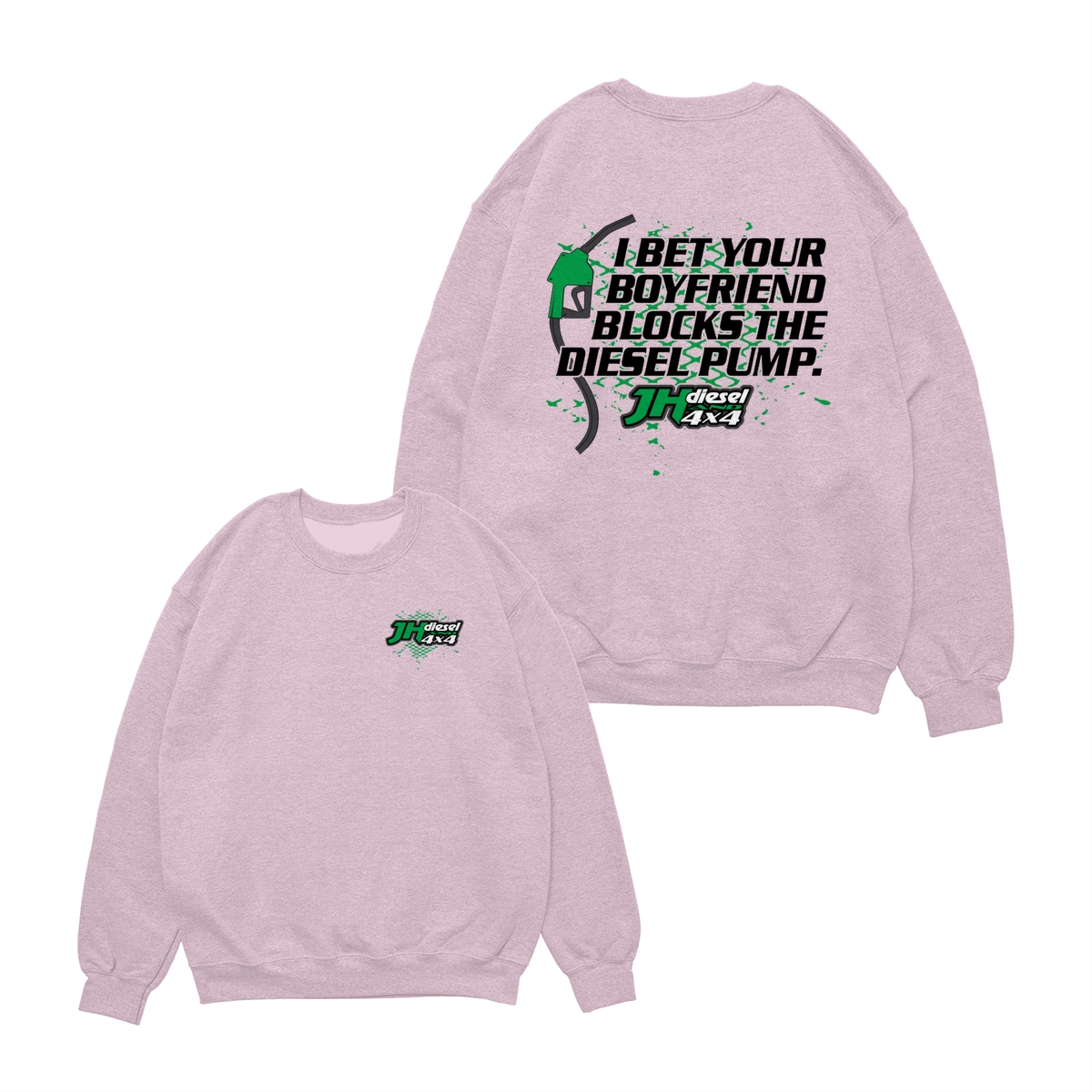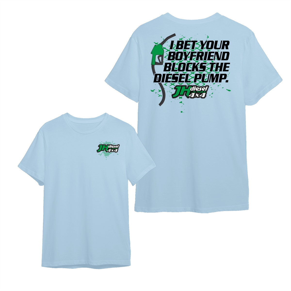 Cleetus McFarland JH’s Diesel ‘Your Boyfriend Blocks Diesel Pump’ Double-Sided T-Shirt – Funny Truck Apparel for Diesel Fans & Gearheads