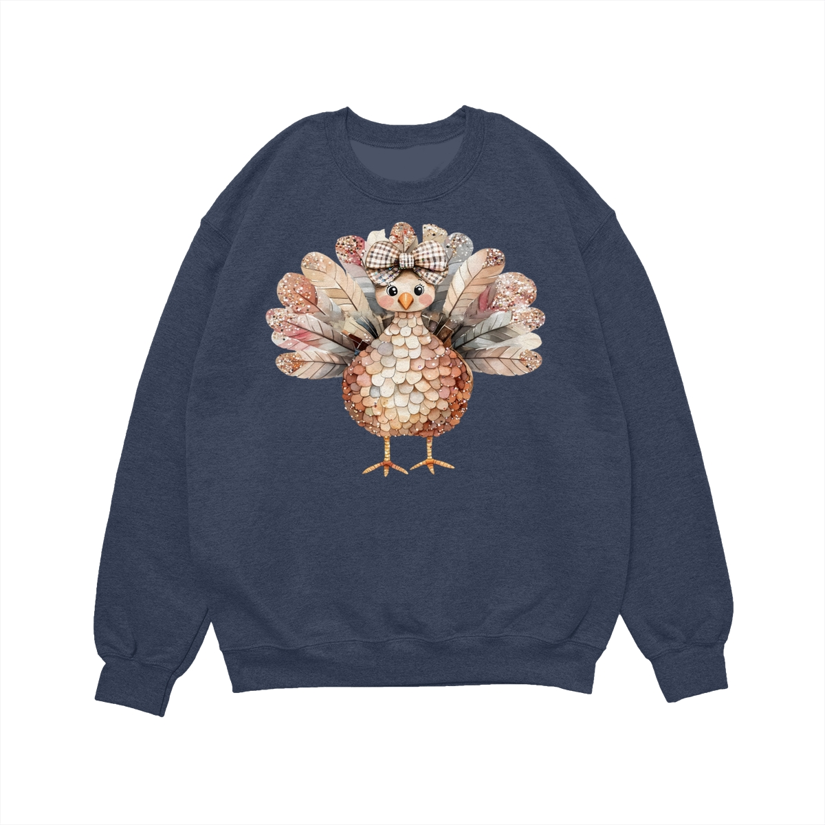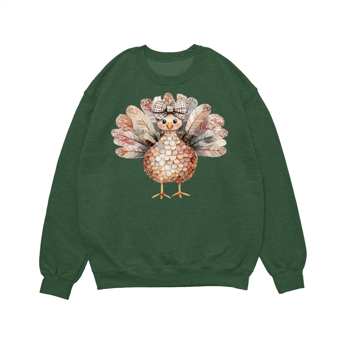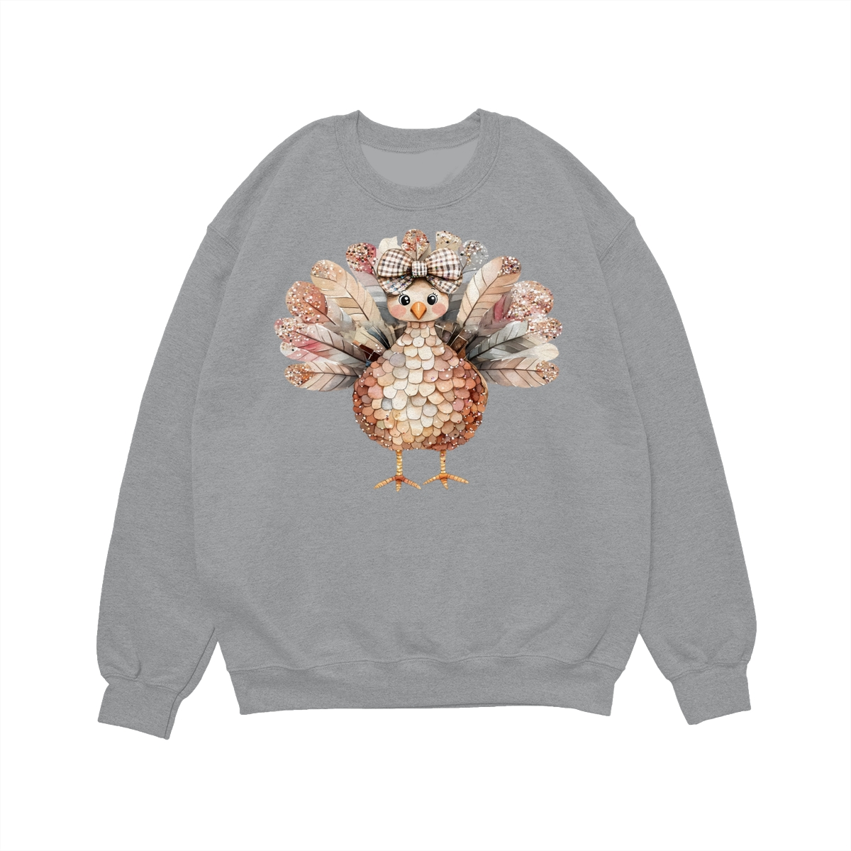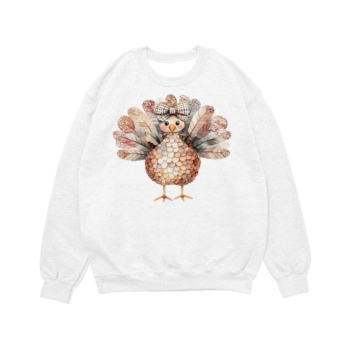 Colorful Coquette Turkey Shirt, Glitter Bow Cotton Women’s Pullover, Thanksgiving Fall Style, Cute Girly Autumn Gift, Soft Women’s Crewneck, Made in USA