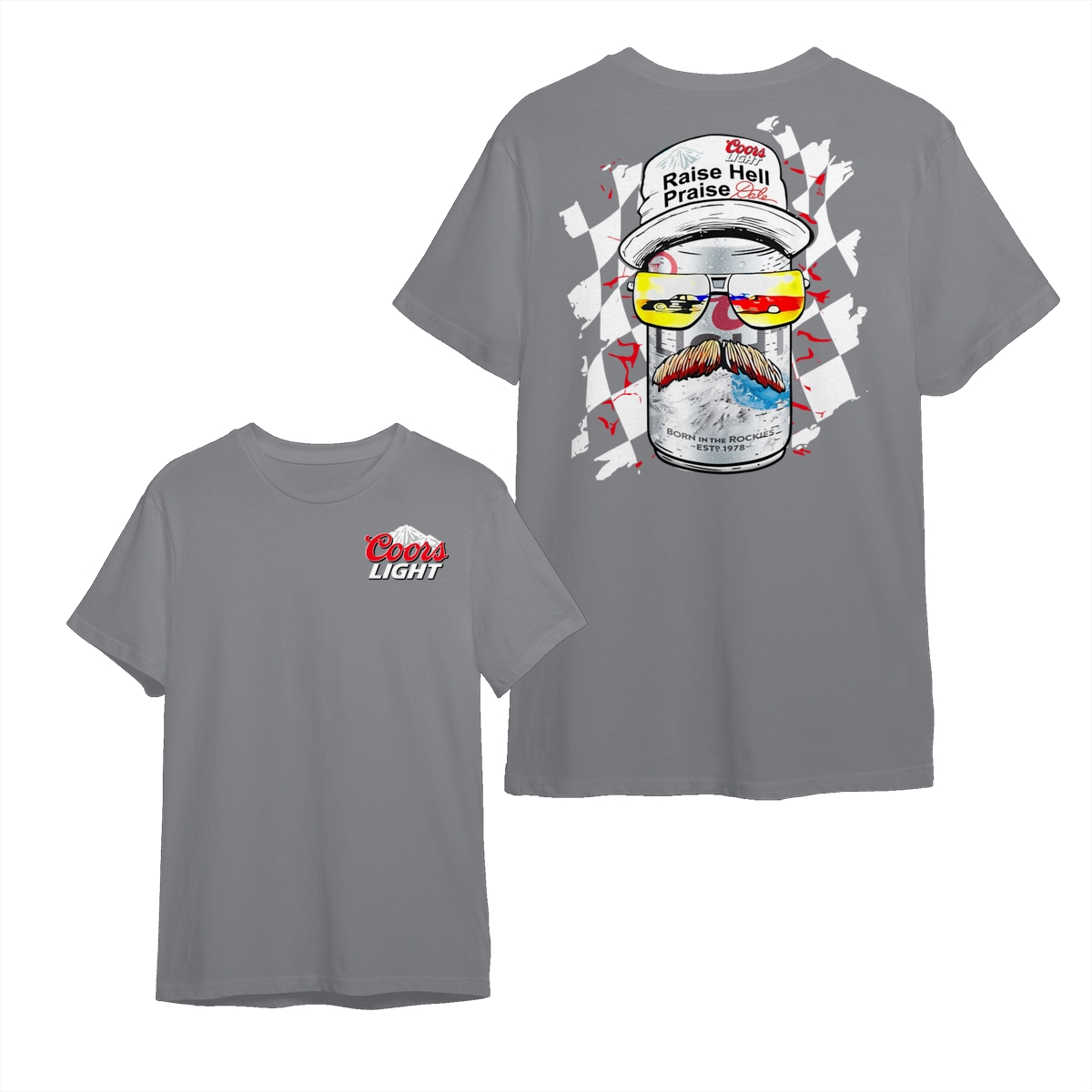 Coors-Light ‘Raise Hell Praise Dale’ T-Shirt, Retro Beer Can Graphic, Add to Cart Buy Now Tee, Fun Statement Style for Race Days