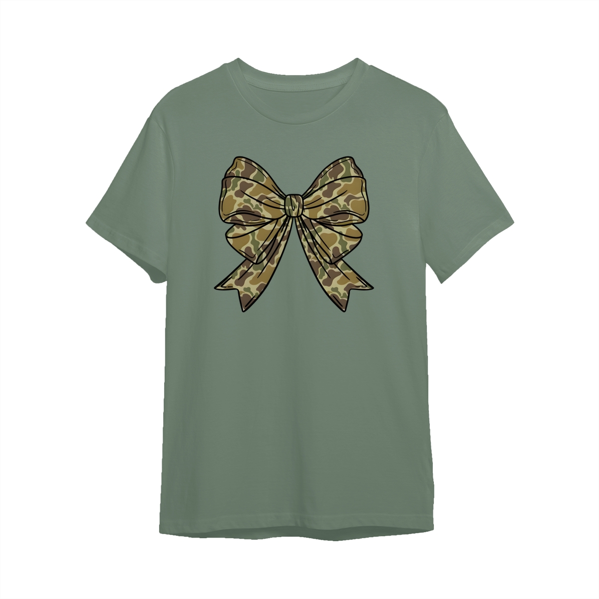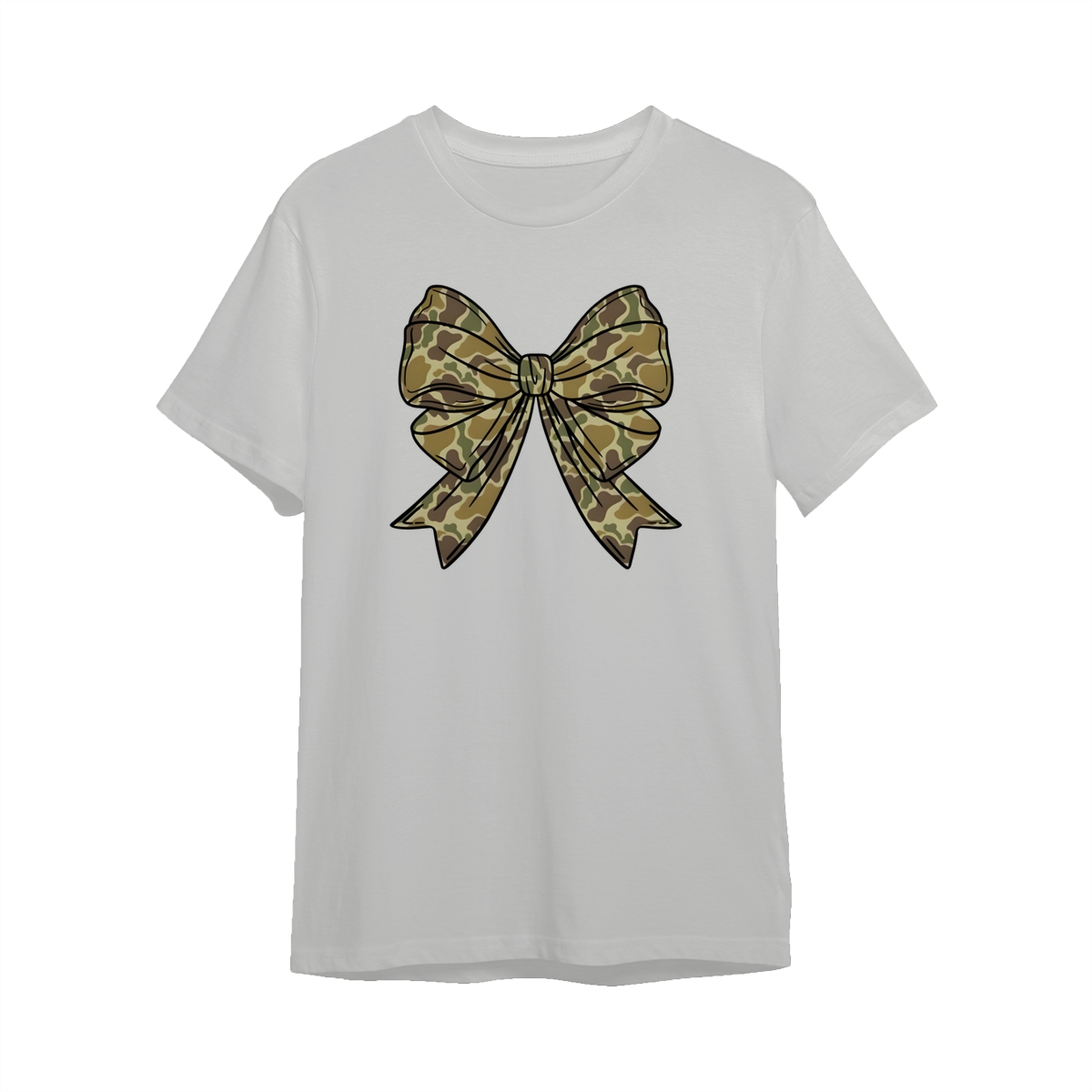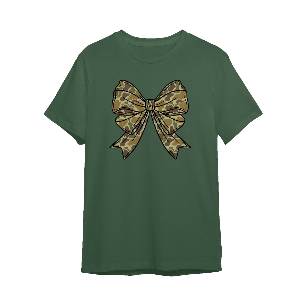 Coquette Old Camo Bow T-Shirt, Women’s Hunting Tee, Wife Hunting Shirt, Dove Hunting Duck Hunting Shirt for Women Cotton T-Shirt Comfy Back To School Casual Top Womenswear