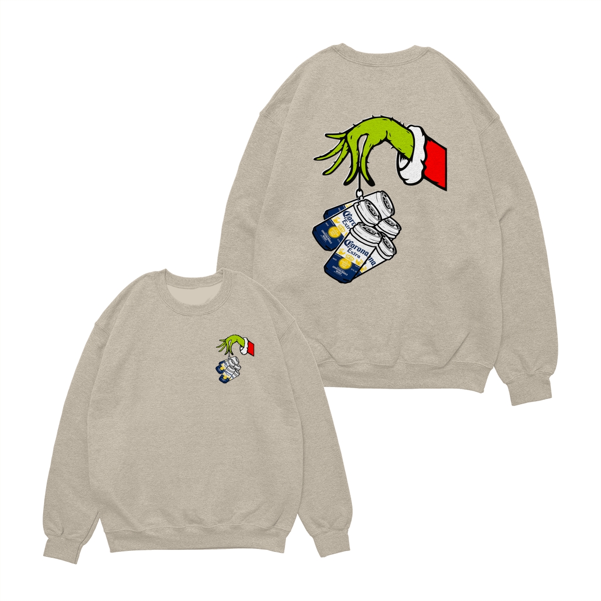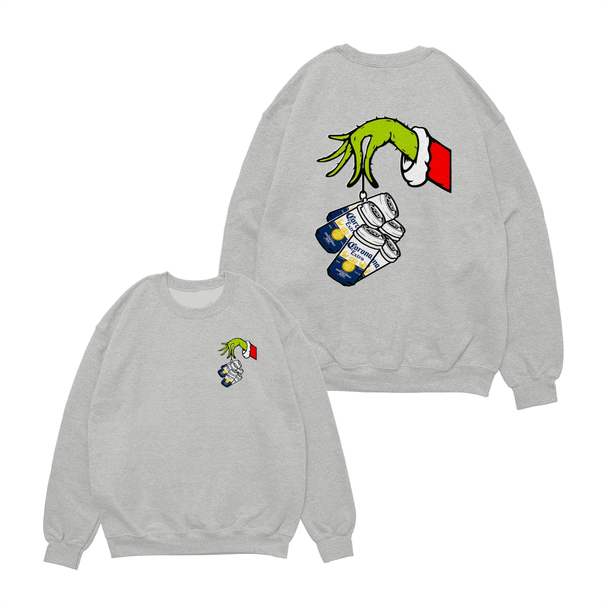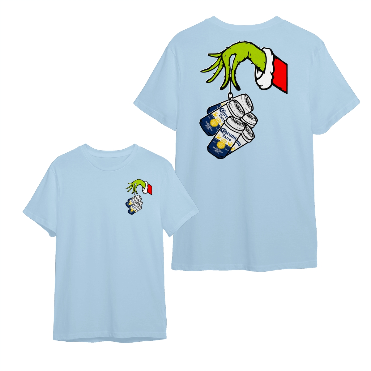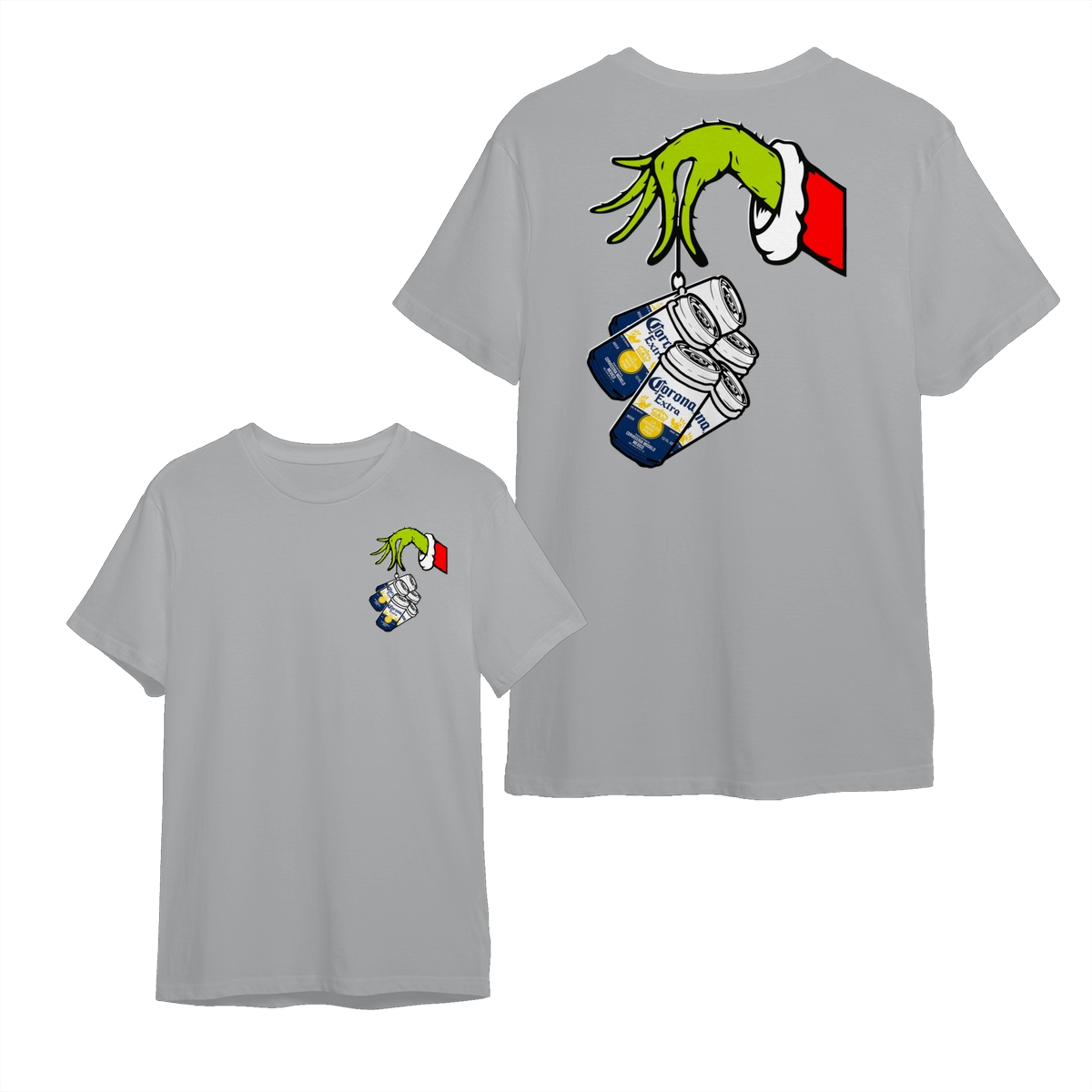 Corona Extra Christmas Movie The Grinch Hand T-Shirt, Christmas Green Guy Holding Corona Beer Cans 2 Sided Graphic Printed Unisex Classic Cotton T-Shirt