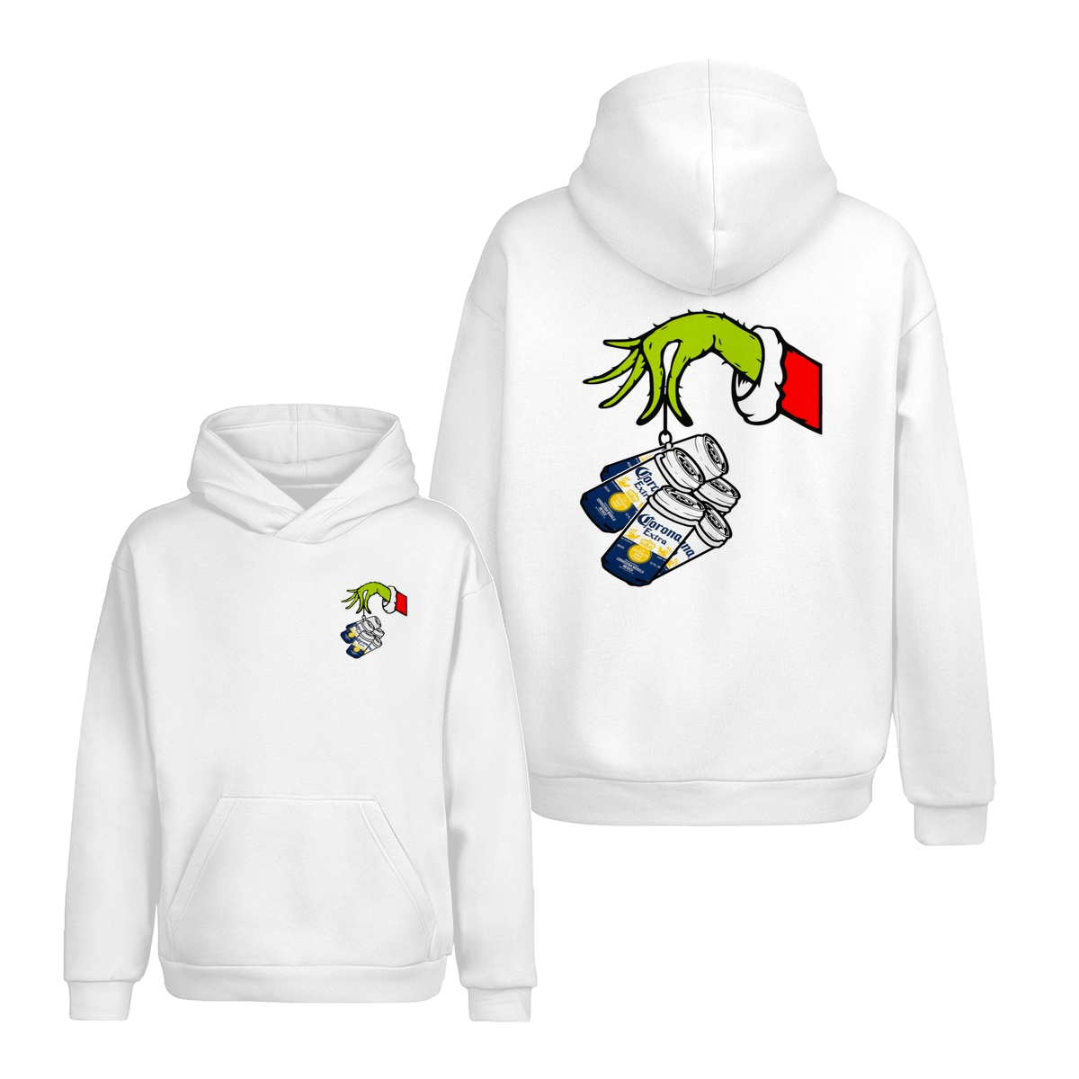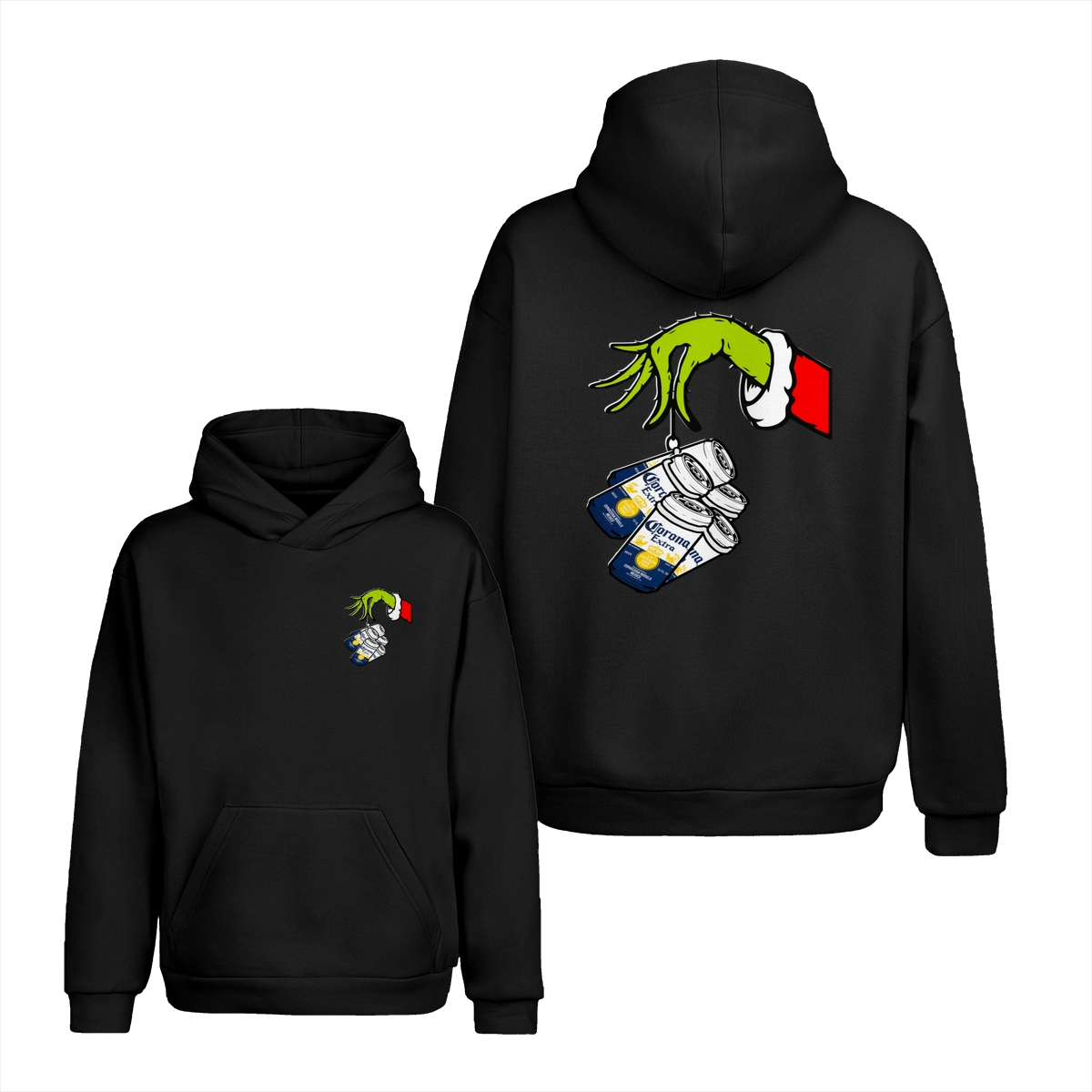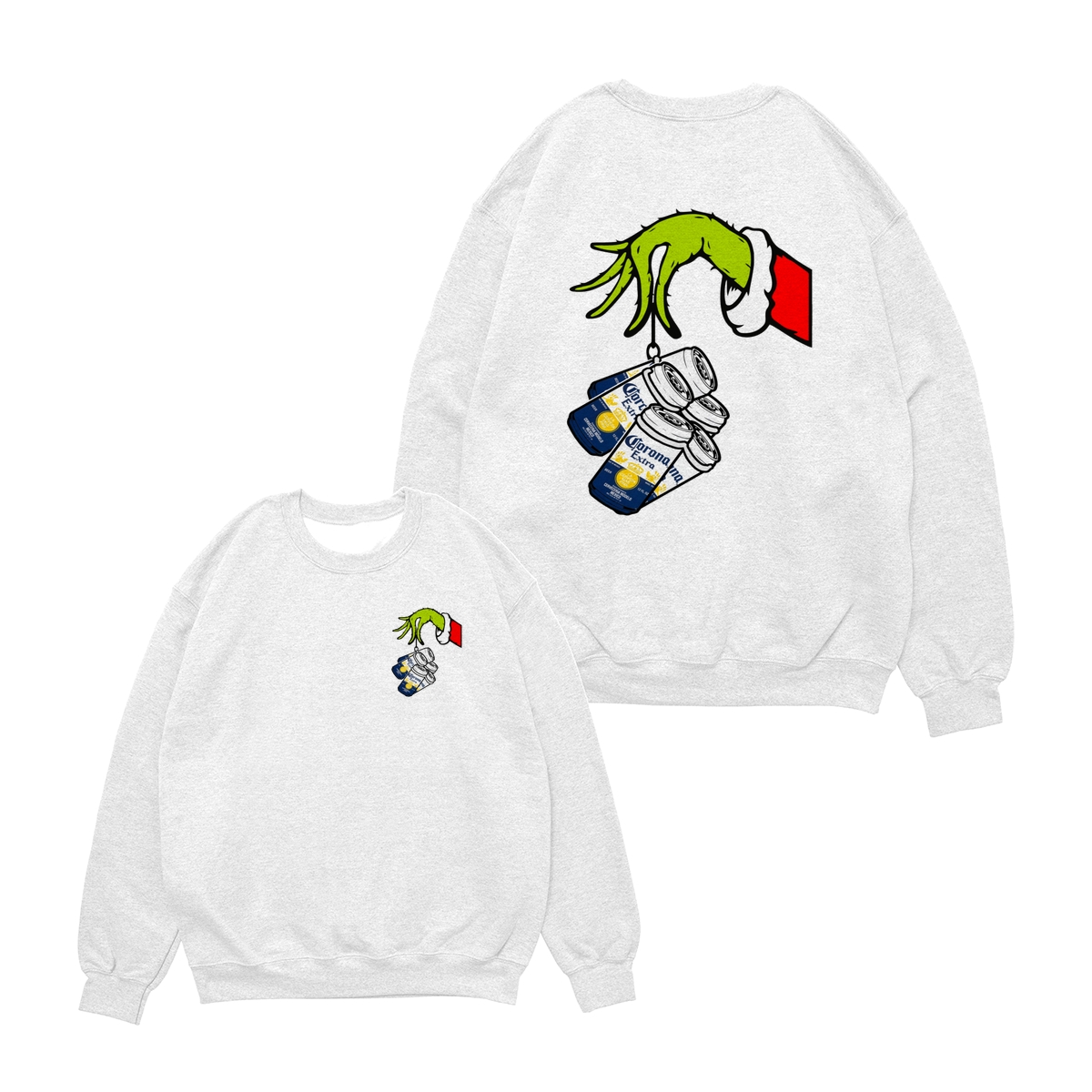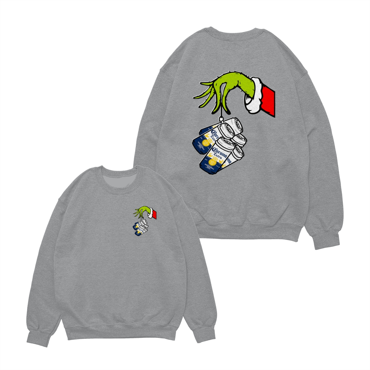 Corona Extra Christmas Movie The Grinch Hand T-Shirt, Christmas Green Guy Holding Corona Beer Cans 2 Sided Graphic Printed Unisex Classic Cotton T-Shirt