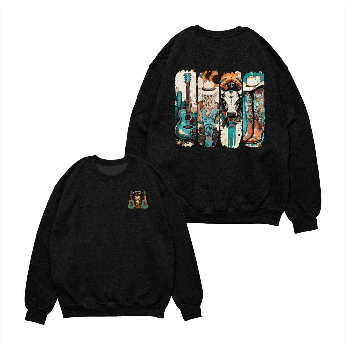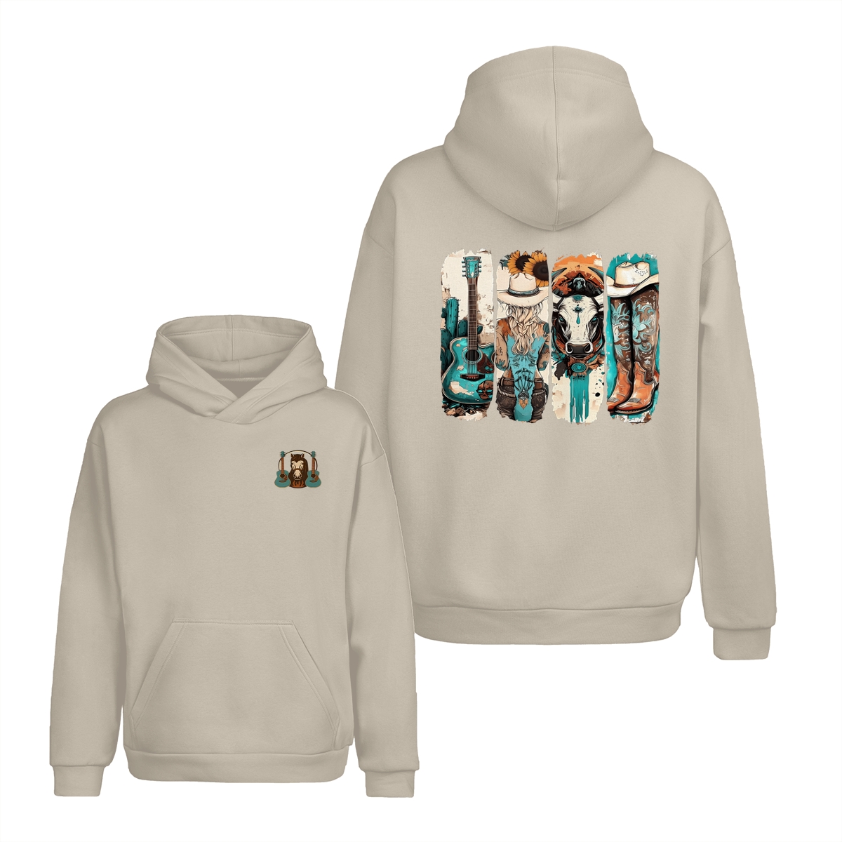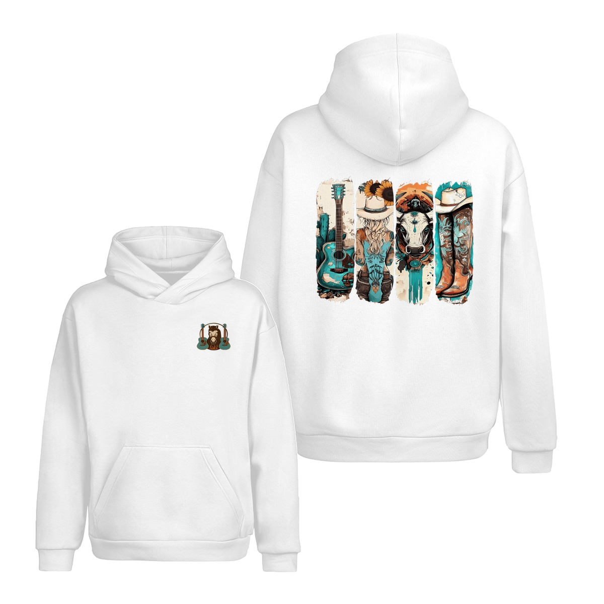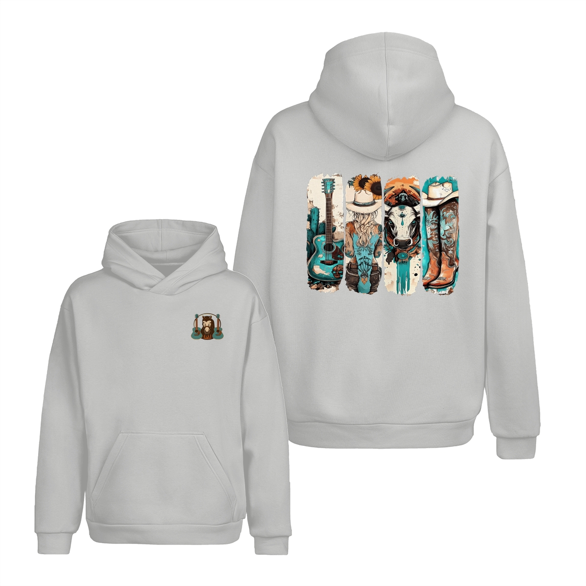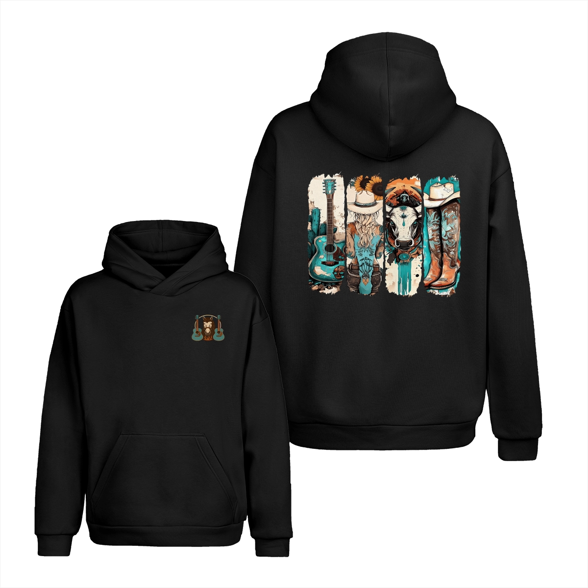 Country Soul in Every Thread – Western Hoodie with Cowgirl Hat, Horse, Boots & Turquoise Guitar Print – Perfect for Rodeo & Music Lovers