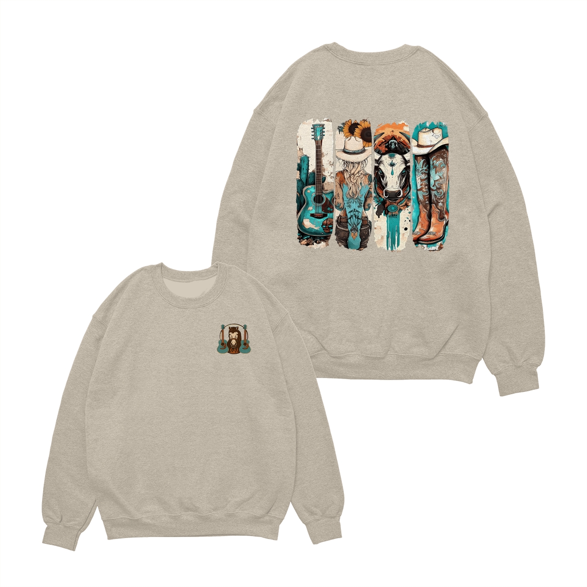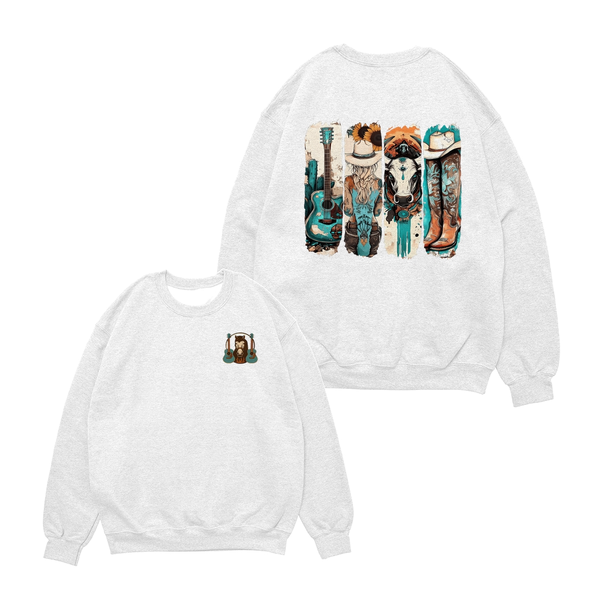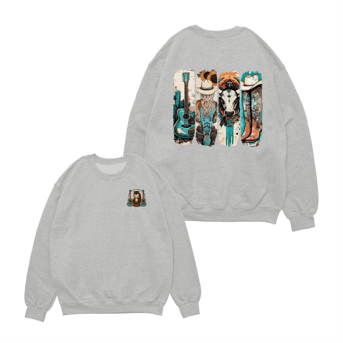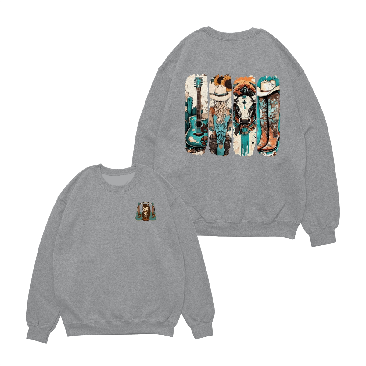 Country Soul in Every Thread – Western Hoodie with Cowgirl Hat, Horse, Boots & Turquoise Guitar Print – Perfect for Rodeo & Music Lovers