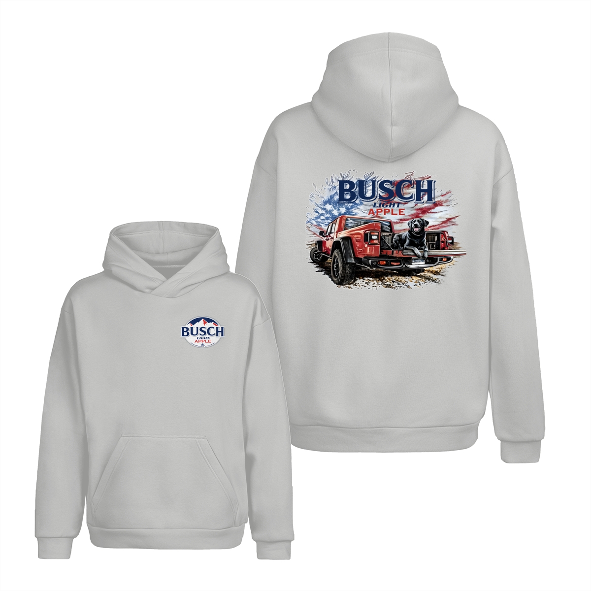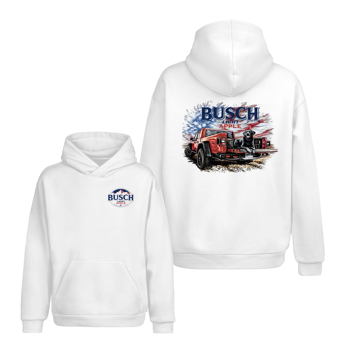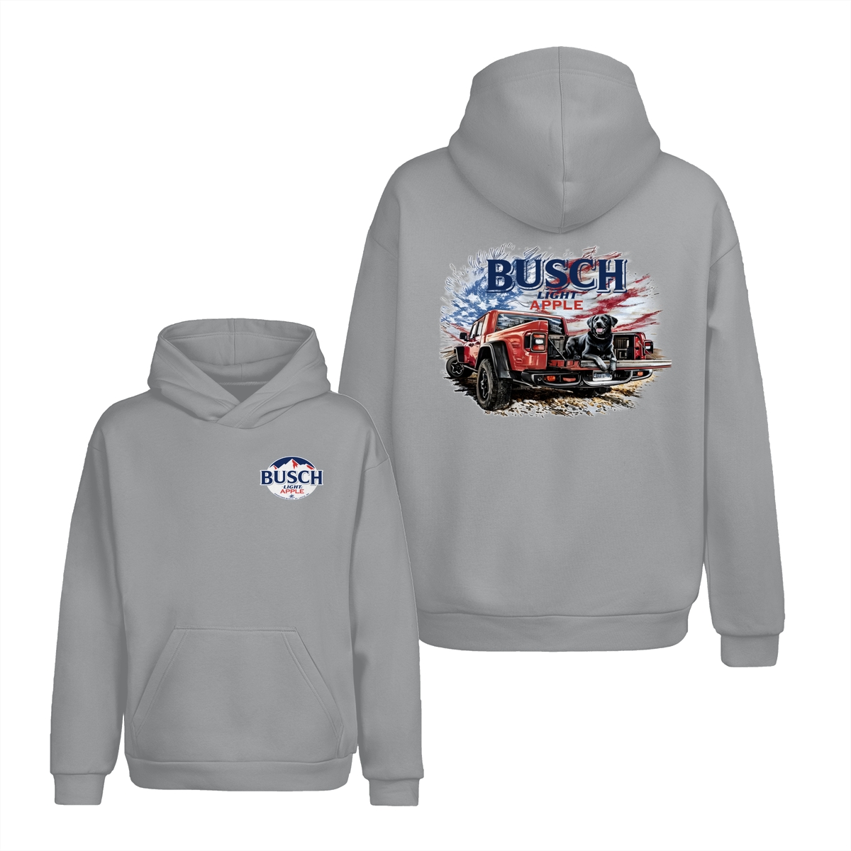 Country Style Hoodie for Hunters – Busch Light Print with Dog & Truck, Perfect for American Outdoorsmen & Beer Fans
