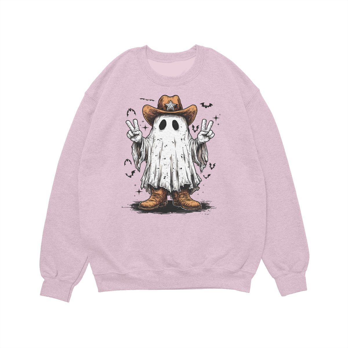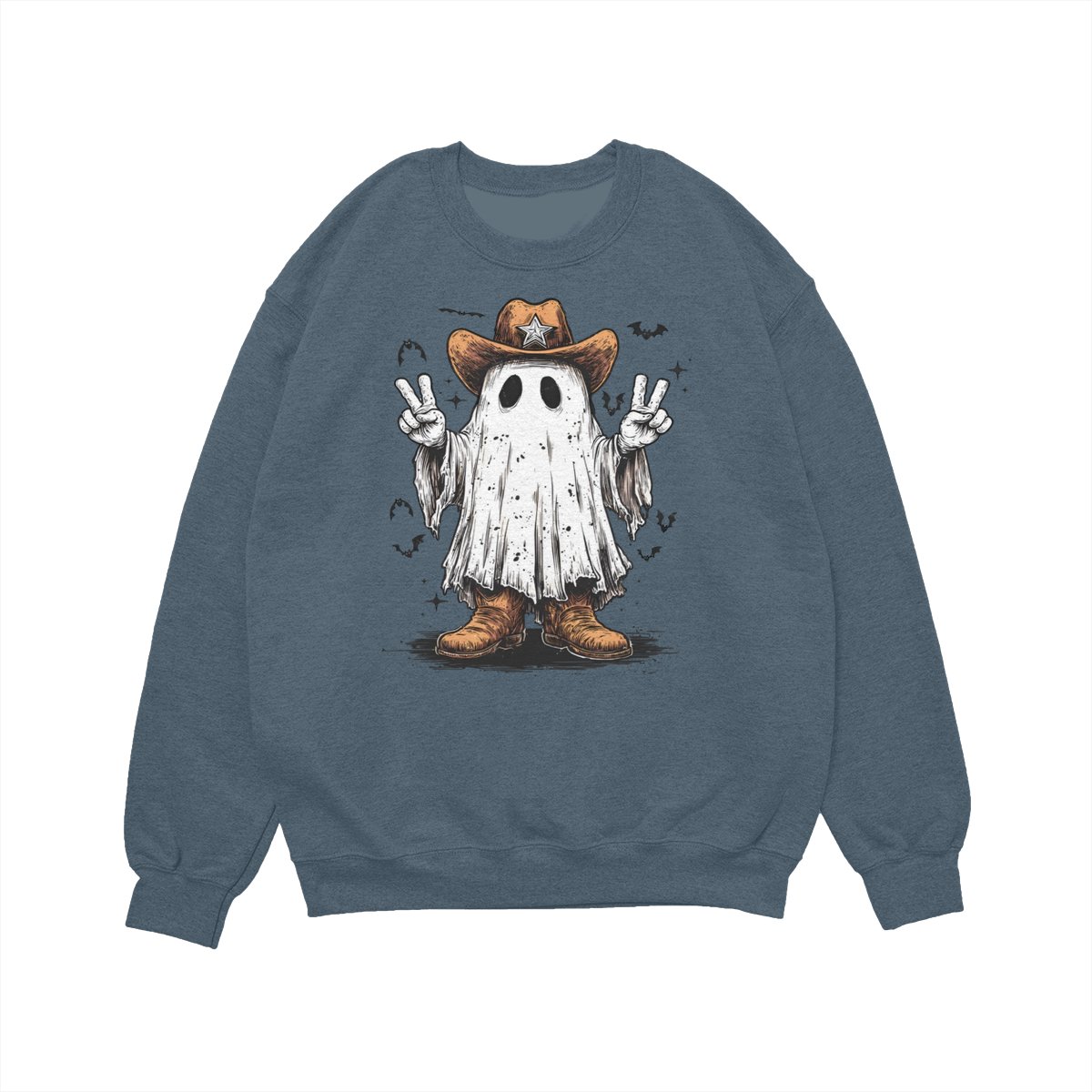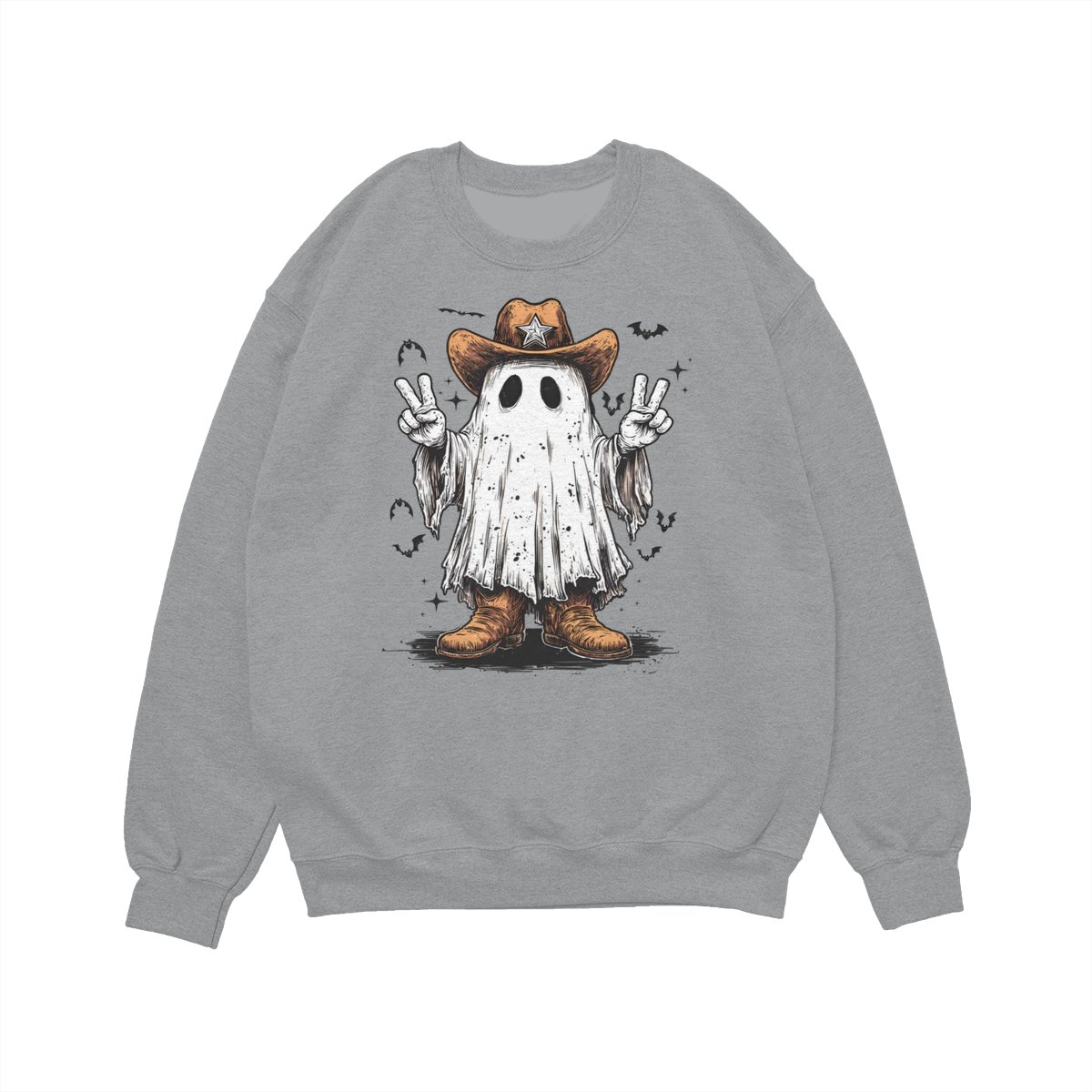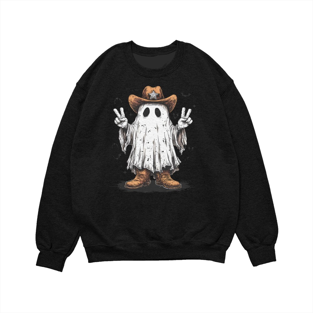 Cowboy Ghost Shirt – Funny Halloween Peace Sign Ghost with Hat & Boots, Perfect for Western Lovers & Spooky Vibes, Casual Crewneck Long Sleeve, 100% Cotton for Ash Color, Basic & Minimalist Style