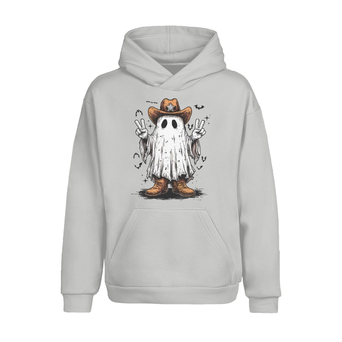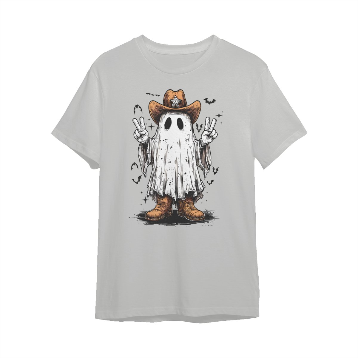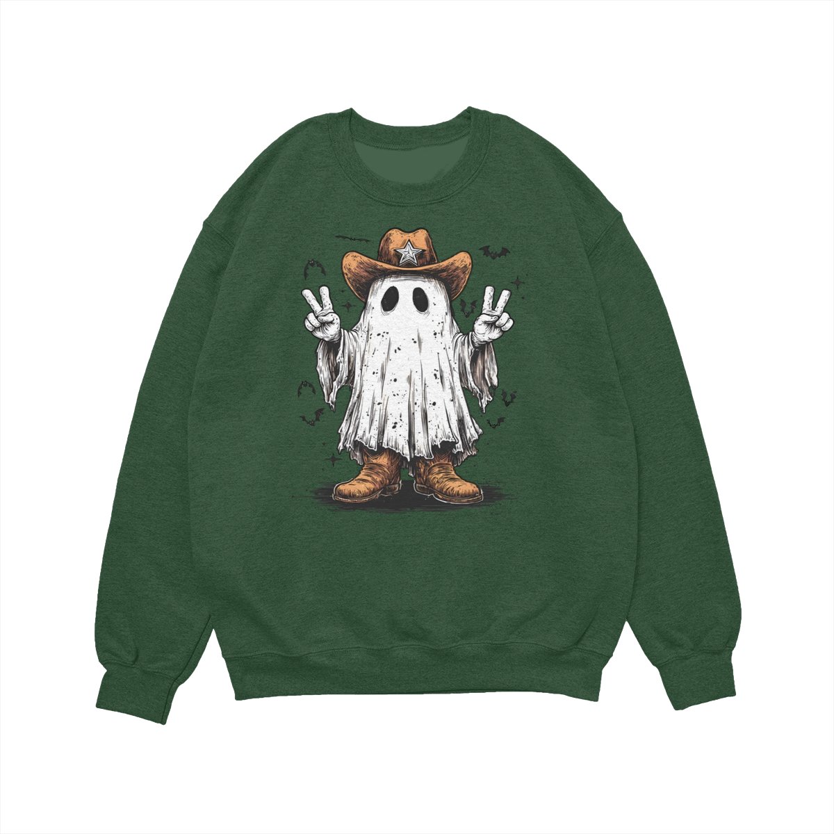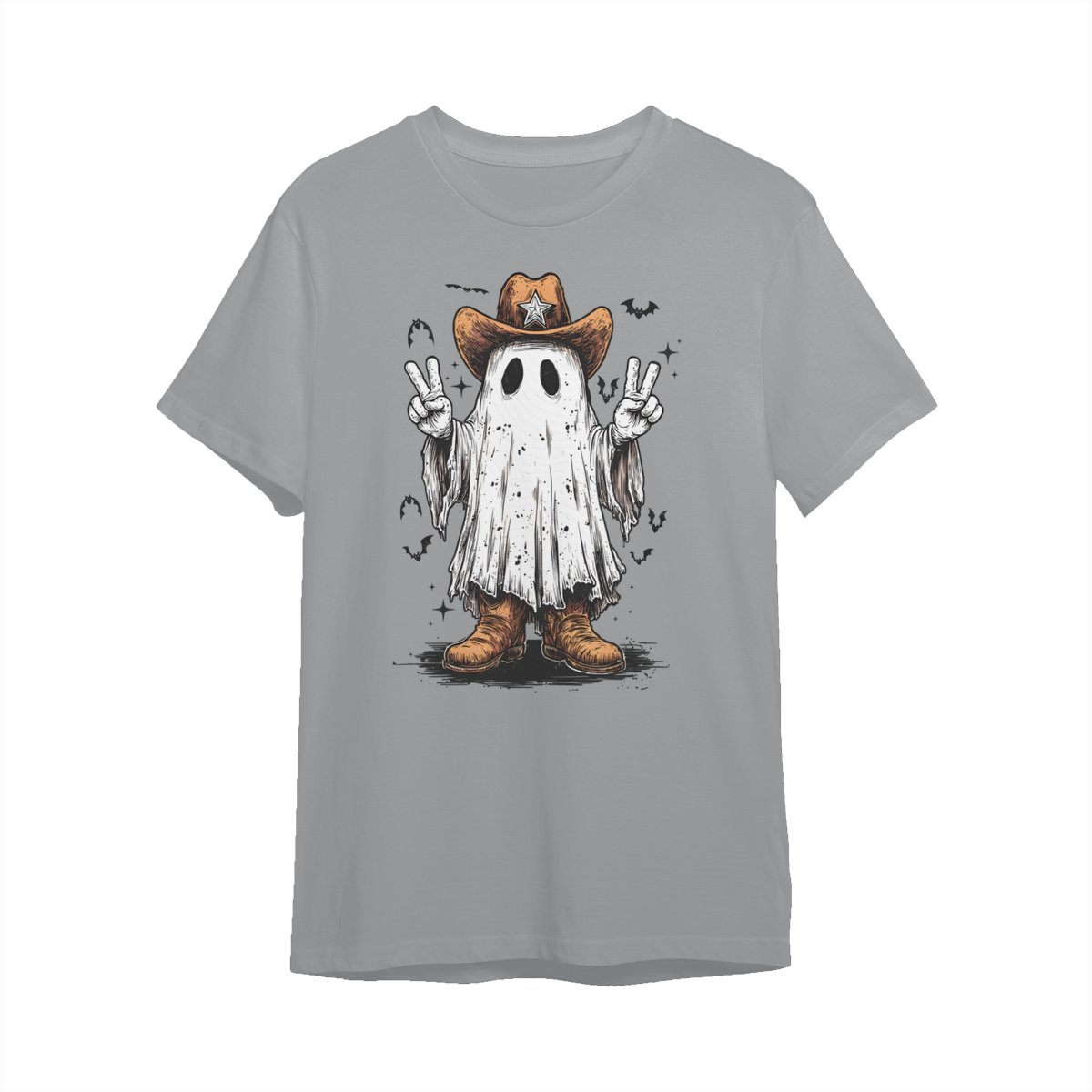 Cowboy Ghost Shirt – Funny Halloween Peace Sign Ghost with Hat & Boots, Perfect for Western Lovers & Spooky Vibes, Casual Crewneck Long Sleeve, 100% Cotton for Ash Color, Basic & Minimalist Style