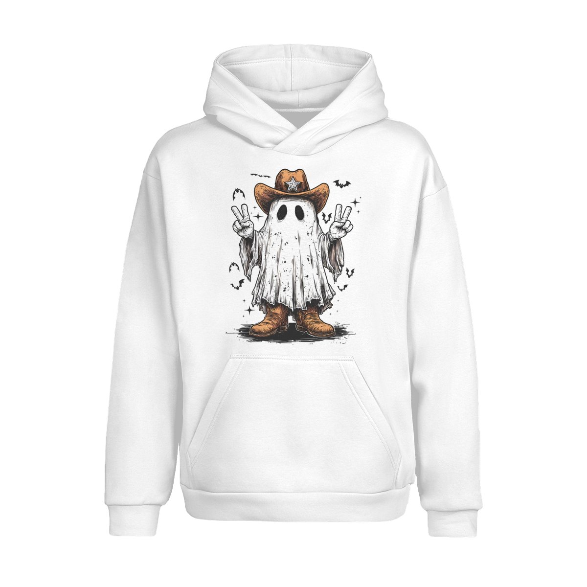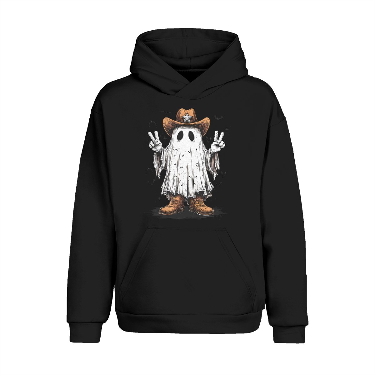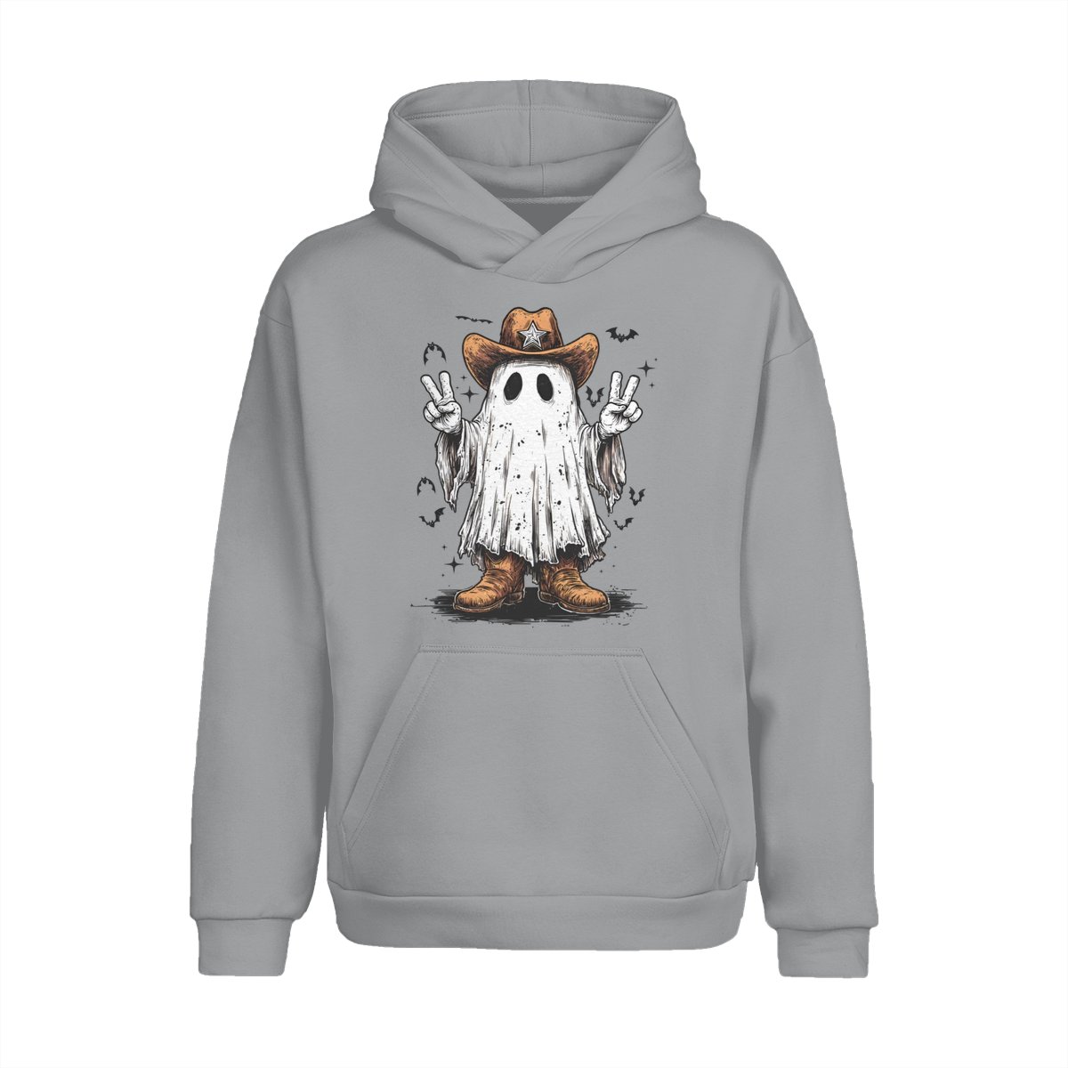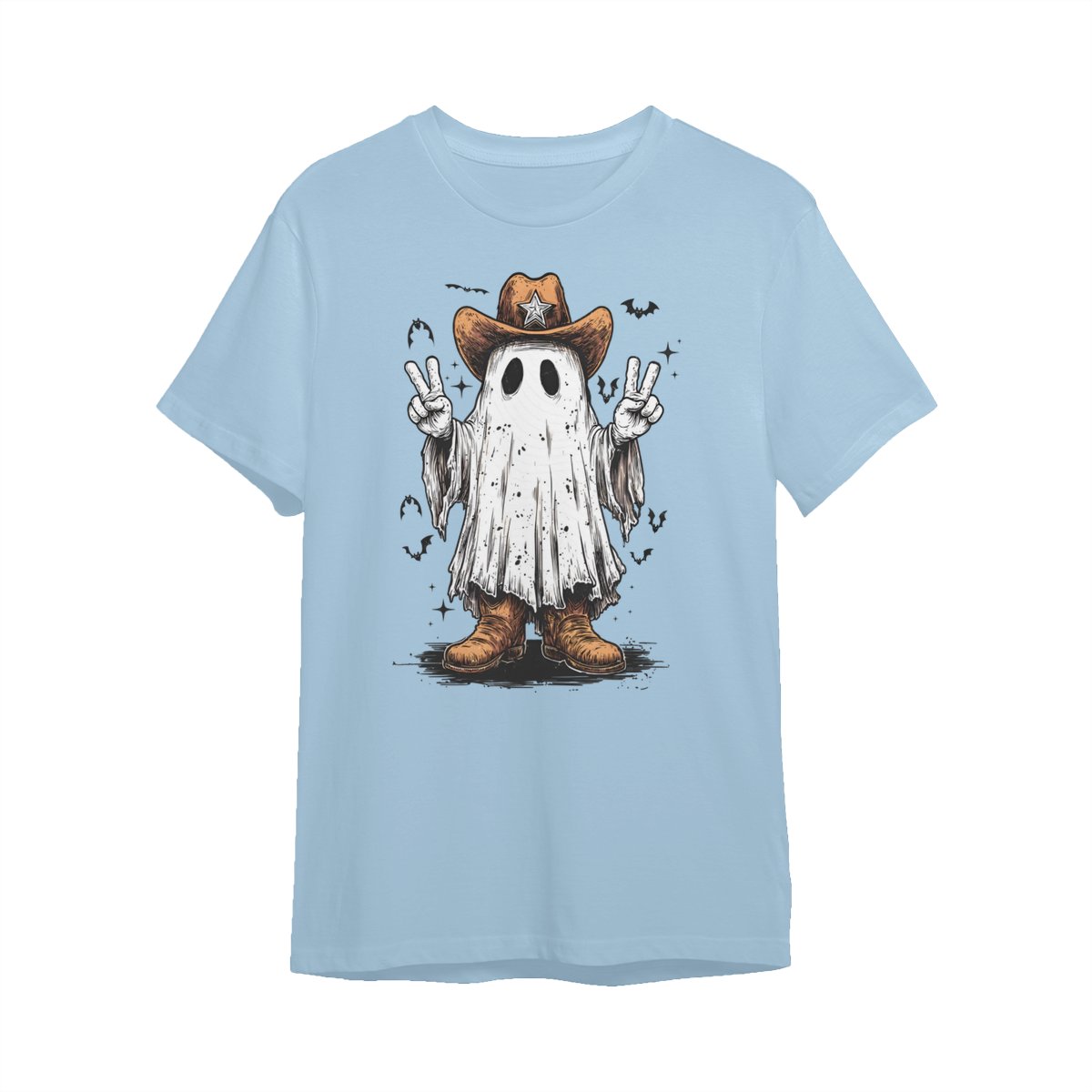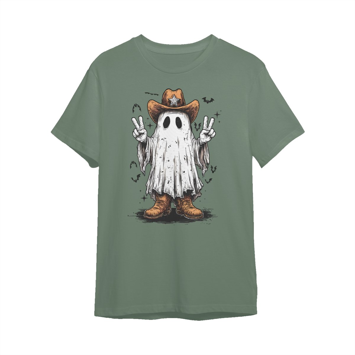 Cowboy Ghost Shirt – Funny Halloween Peace Sign Ghost with Hat & Boots, Perfect for Western Lovers & Spooky Vibes, Casual Crewneck Long Sleeve, 100% Cotton for Ash Color, Basic & Minimalist Style