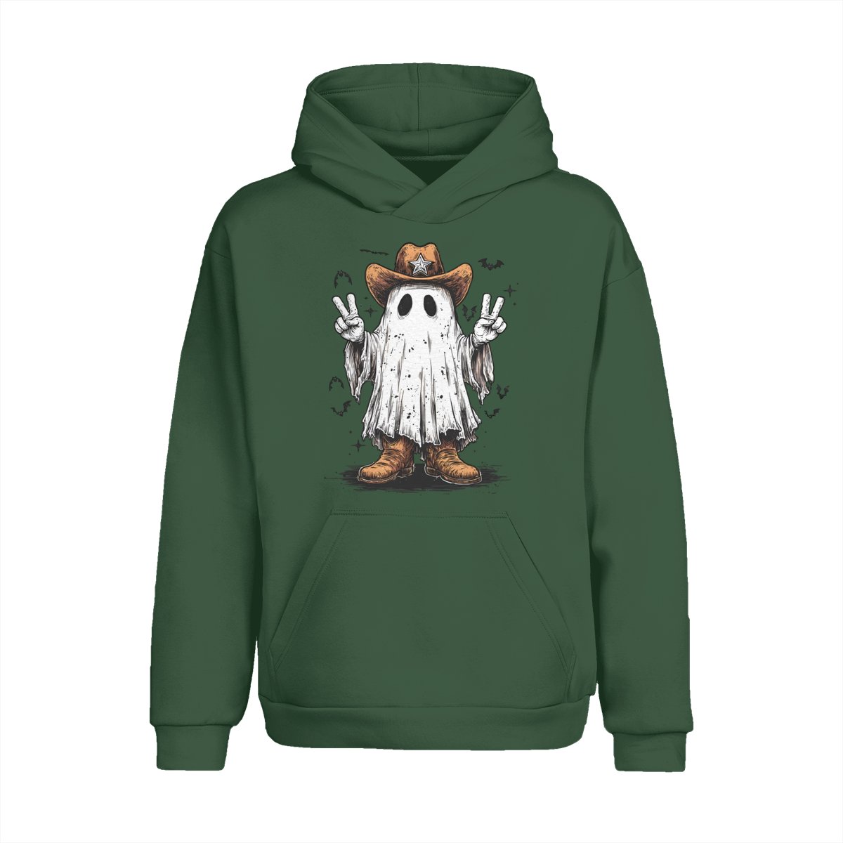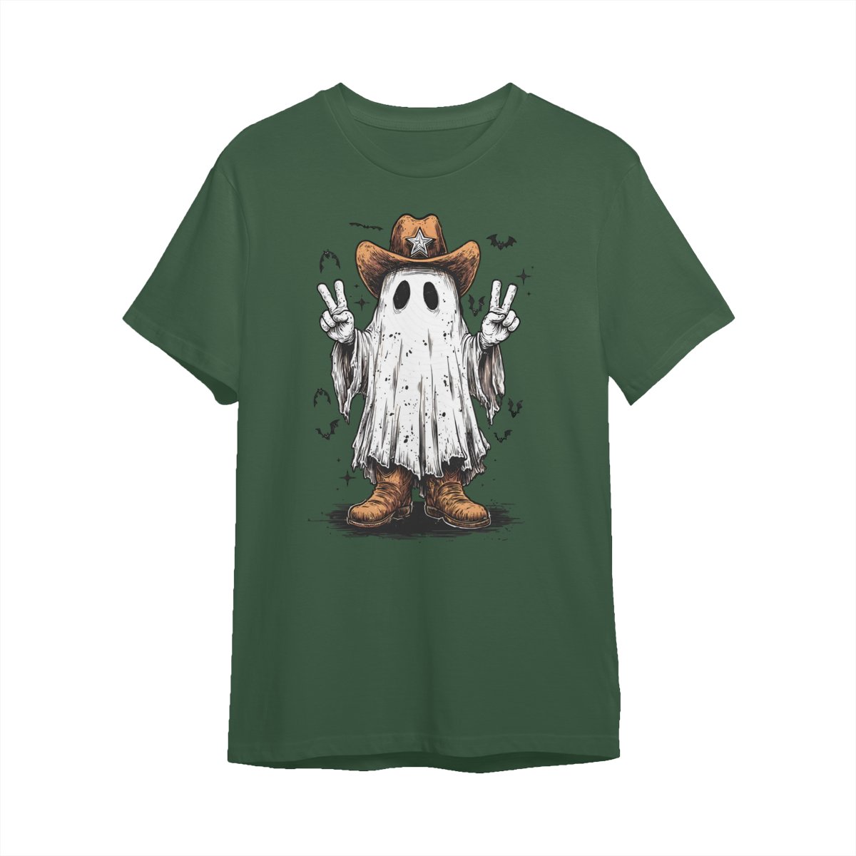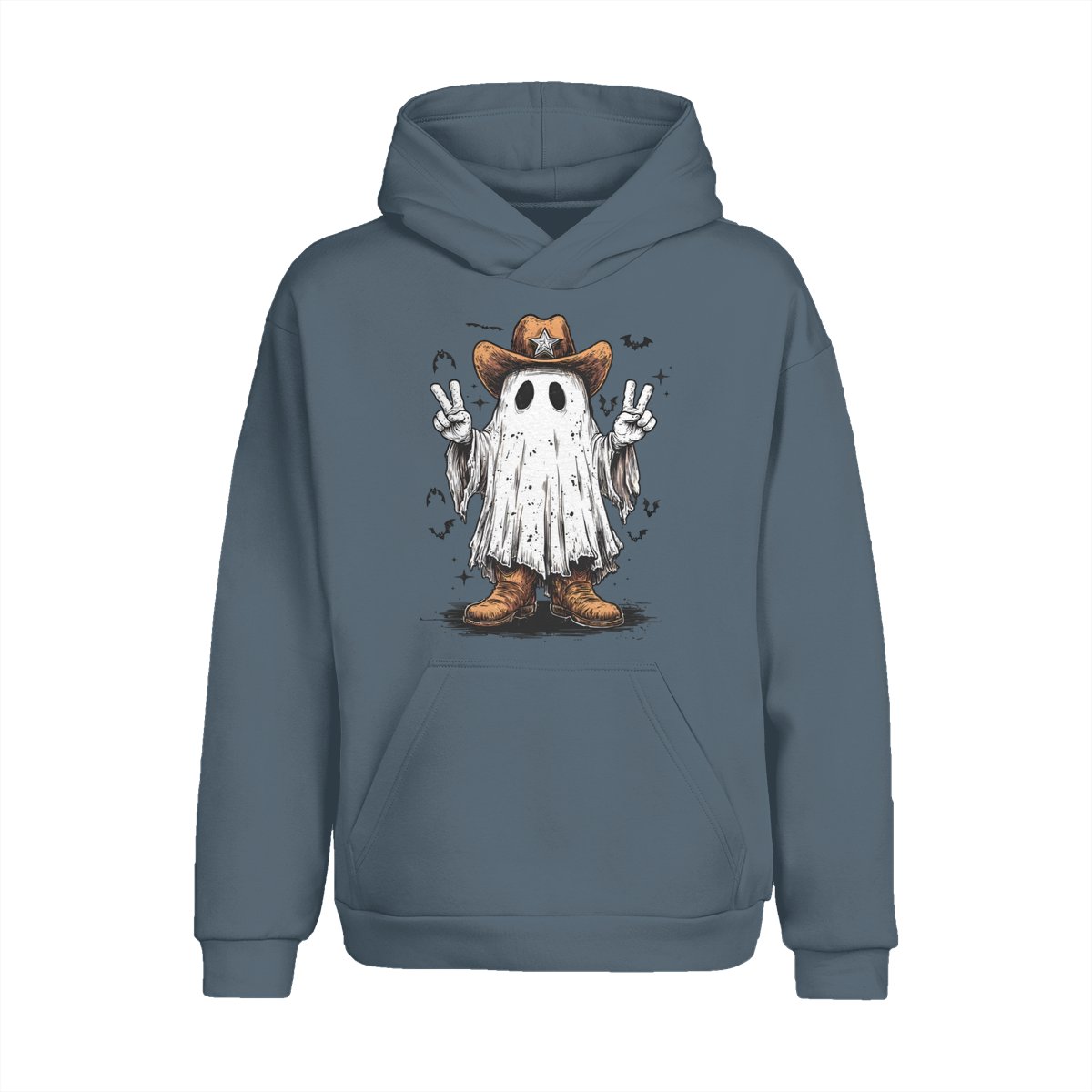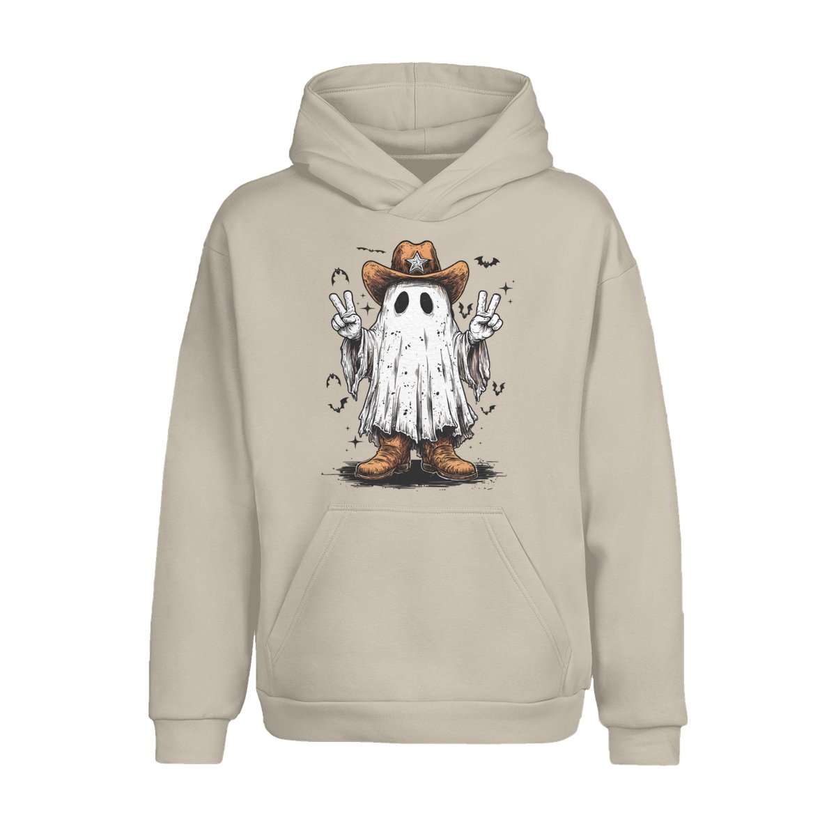 Cowboy Ghost Shirt – Funny Halloween Peace Sign Ghost with Hat & Boots, Perfect for Western Lovers & Spooky Vibes, Casual Crewneck Long Sleeve, 100% Cotton for Ash Color, Basic & Minimalist Style