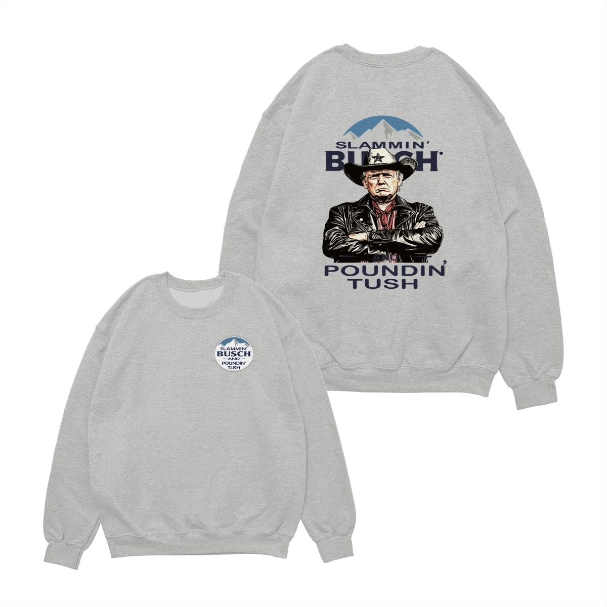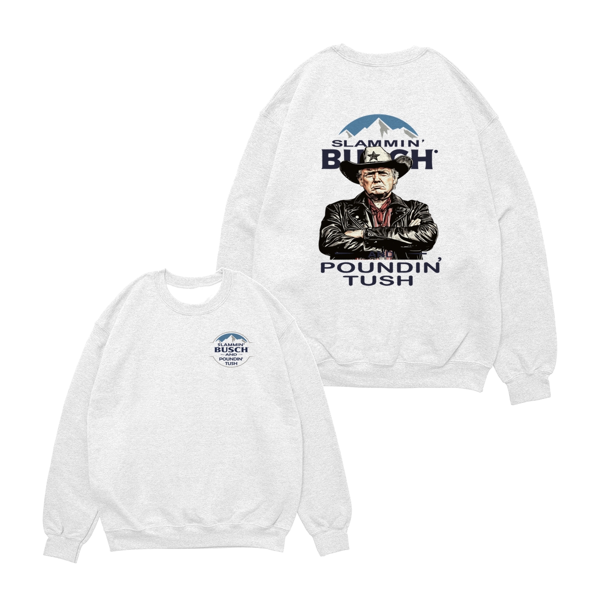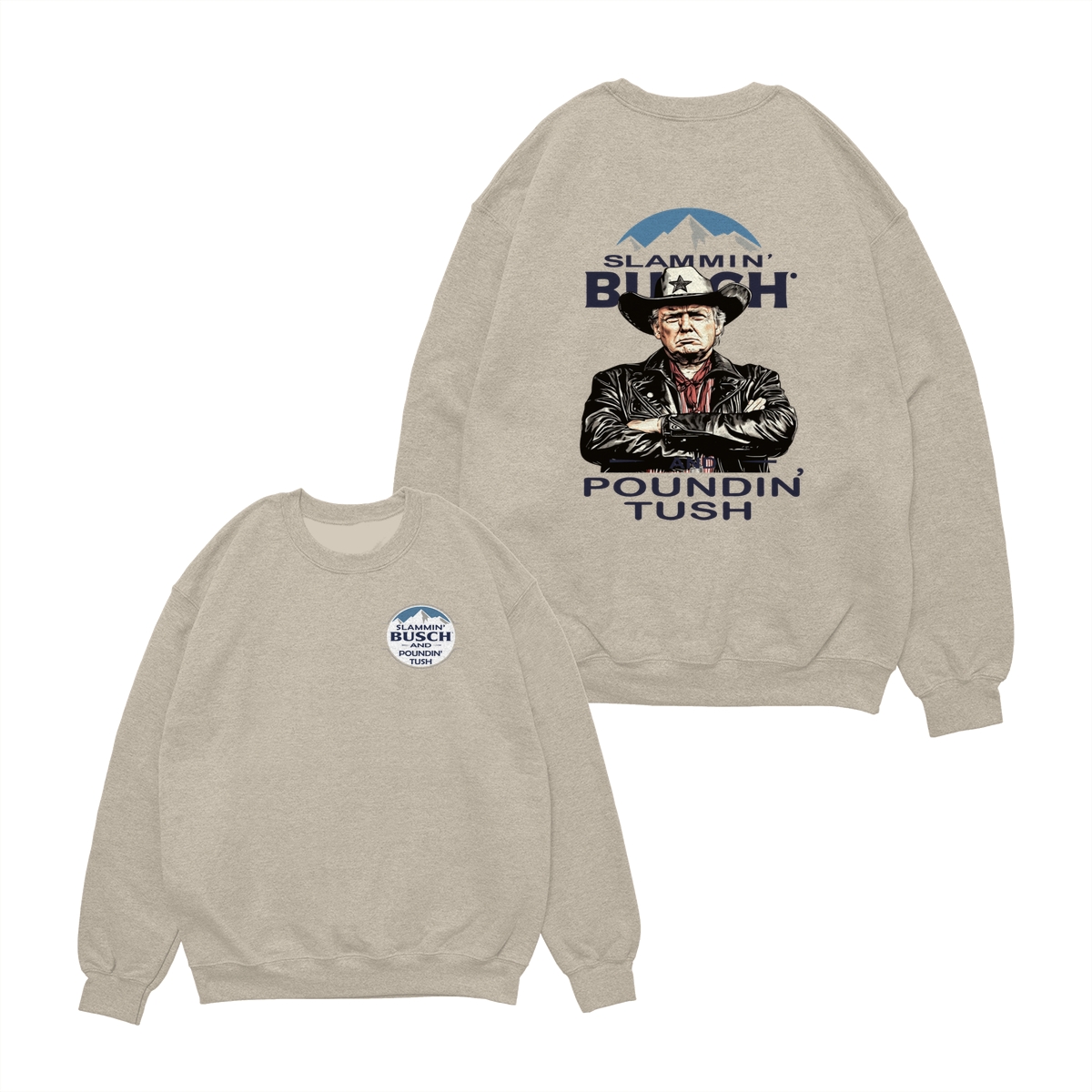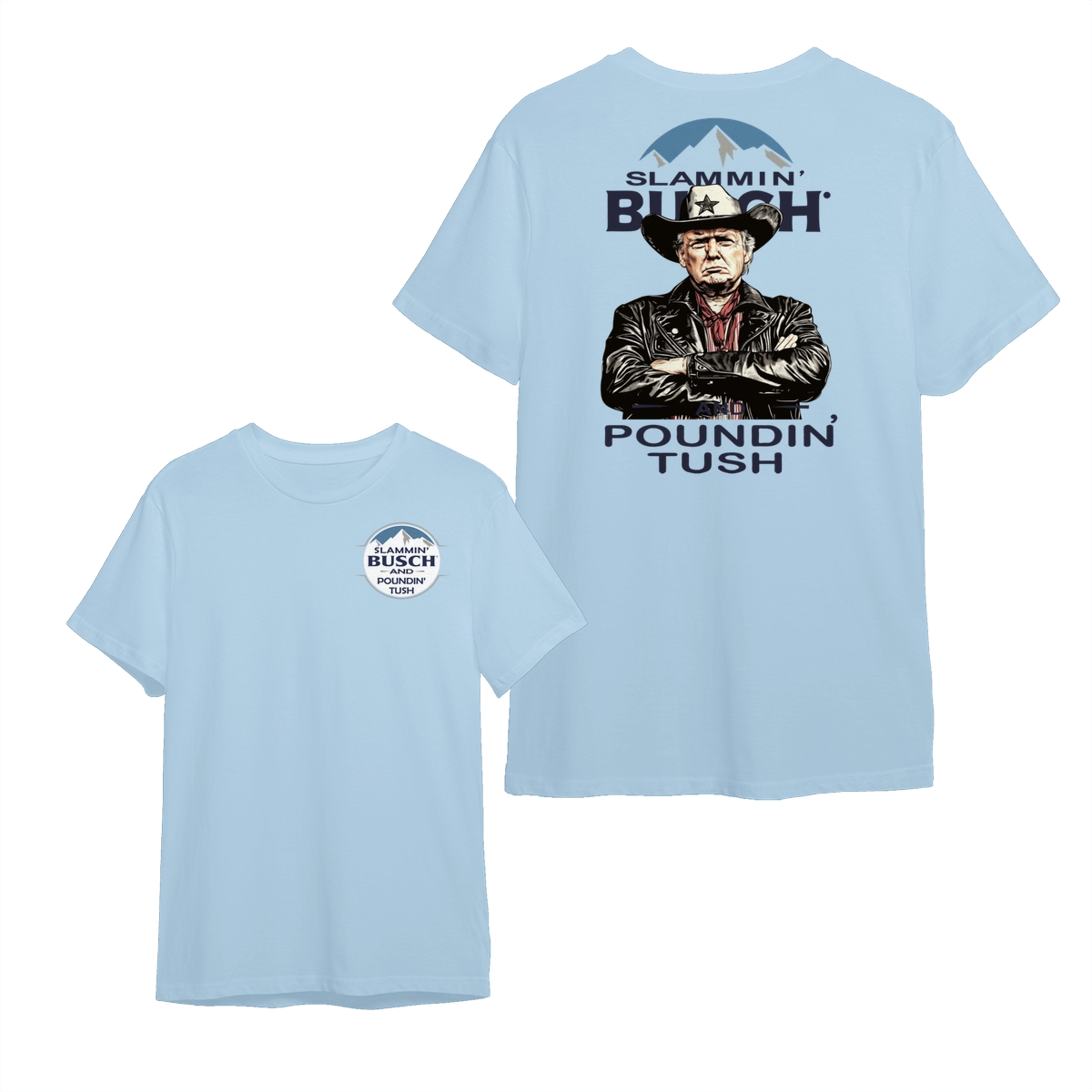 Cowboy Trumm with Busch T-Shirt – “Slammin’ Busch, Poundin’ Tush” Quote Tee, Bold & Patriotic Graphic Tee for Beer Lovers
