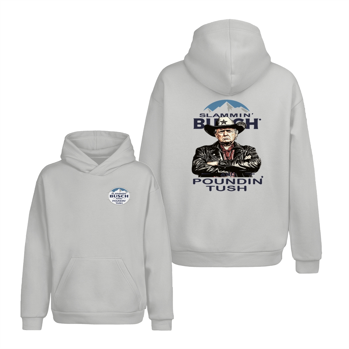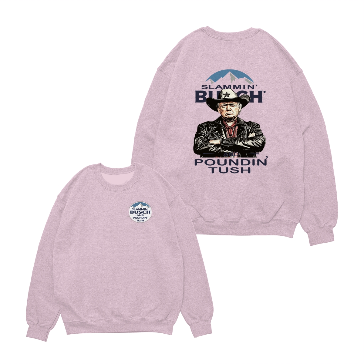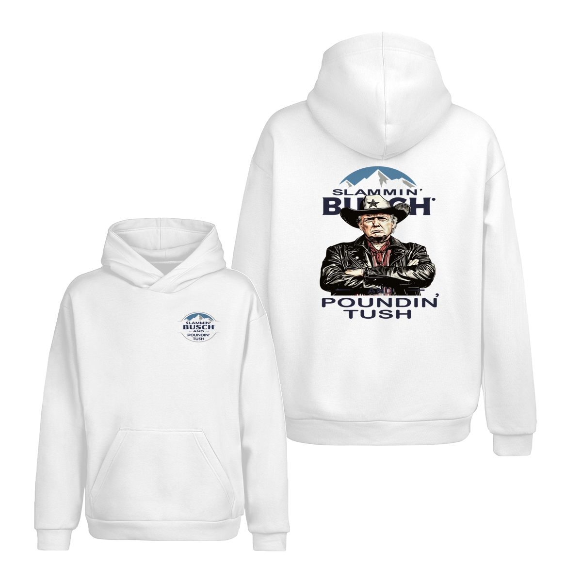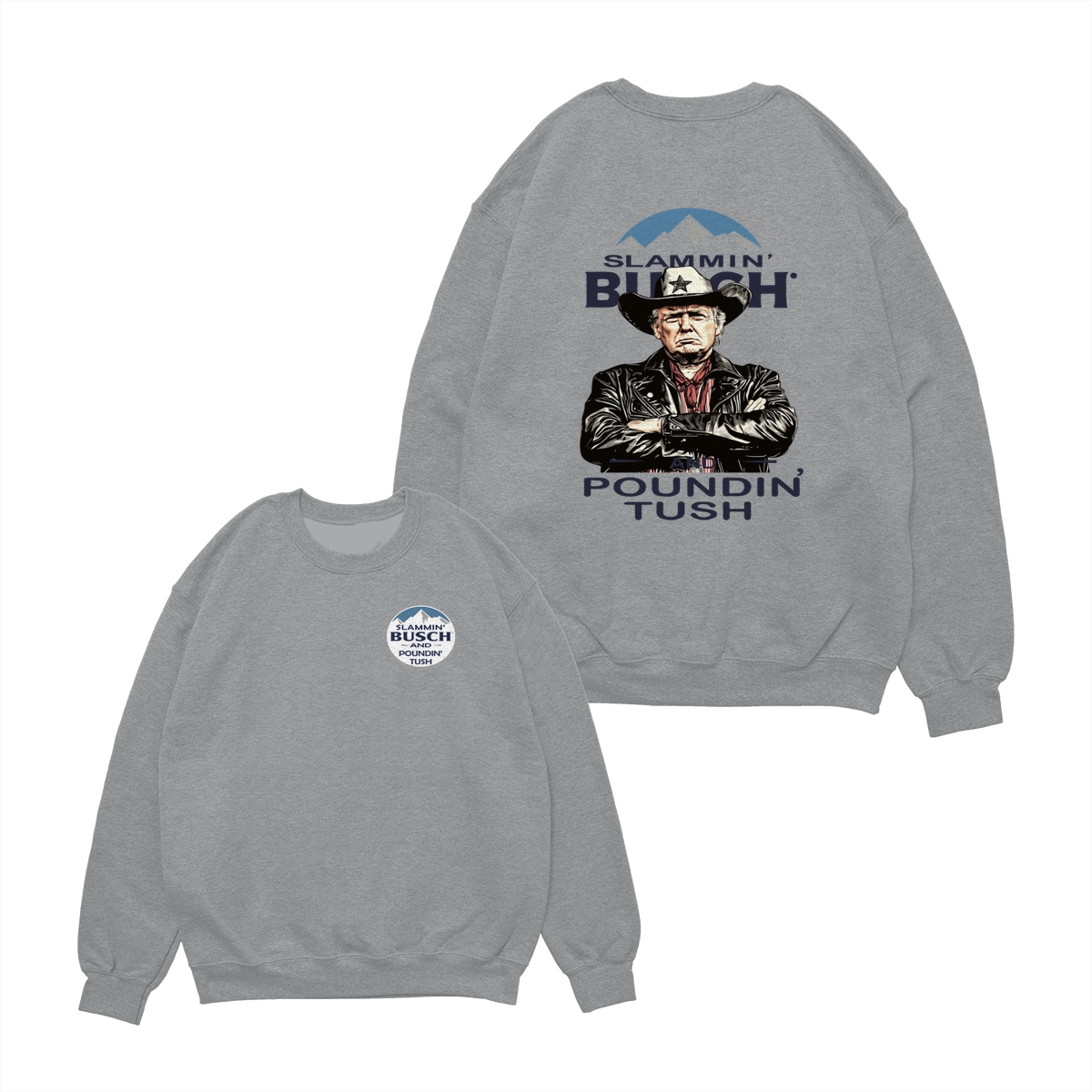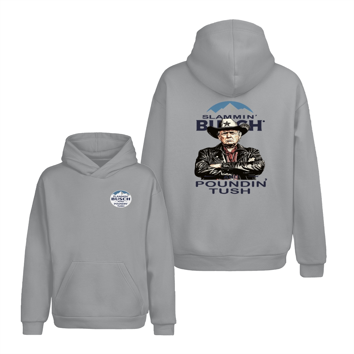 Cowboy Trumm with Busch T-Shirt – “Slammin’ Busch, Poundin’ Tush” Quote Tee, Bold & Patriotic Graphic Tee for Beer Lovers