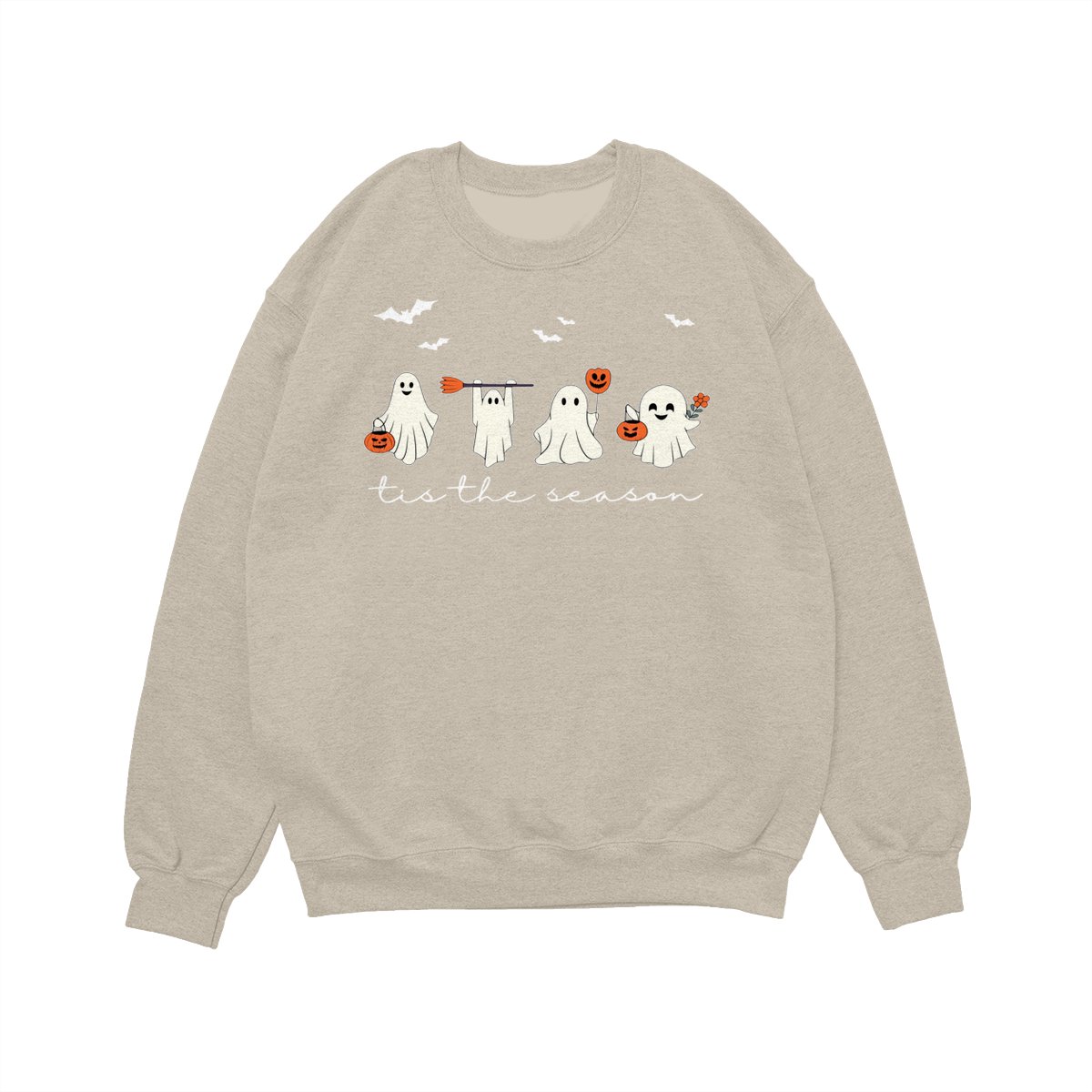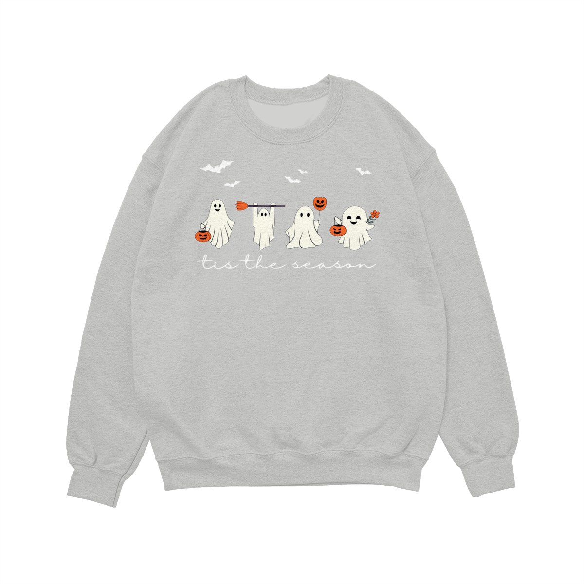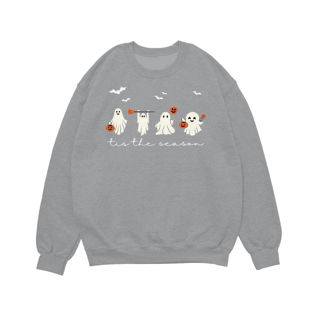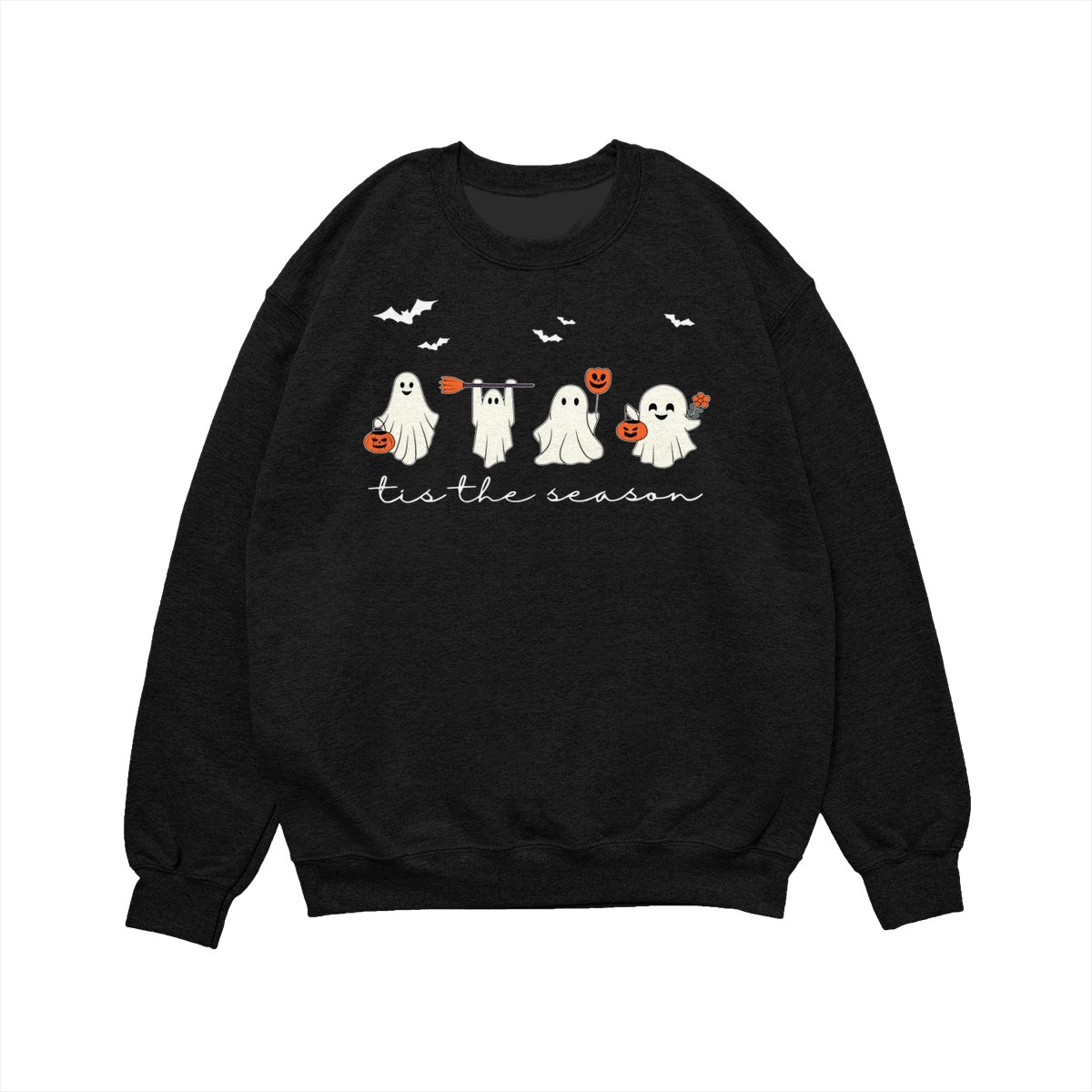 Cute Ghost and Pumpkin Halloween Sweatshirt – T-Shirt – Hoodie – ‘Tis the Season Cute Ghost Crewneck for Women, Fun Fall Graphic Sweatshirt with Pumpkin and Bats, Spooky Season Apparel