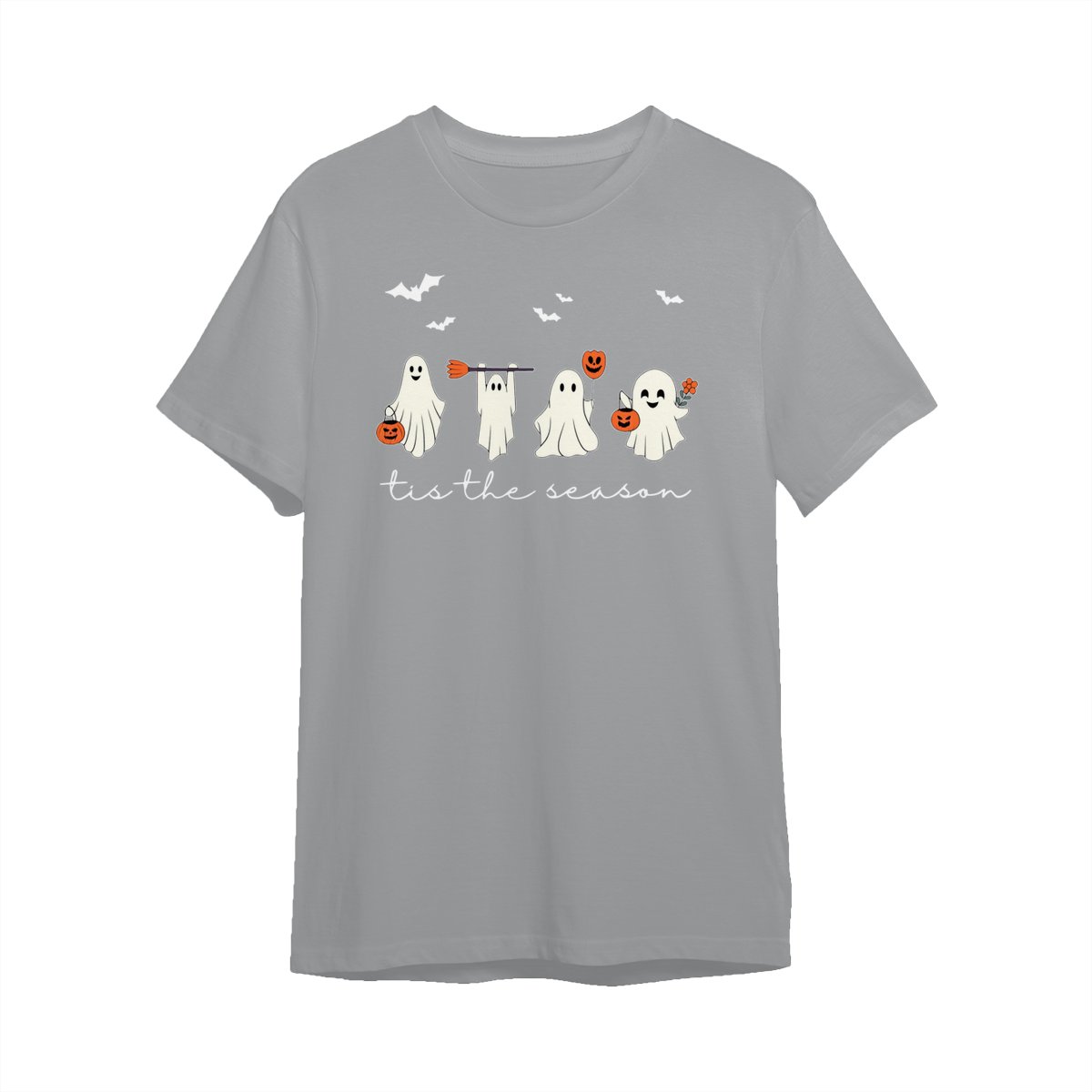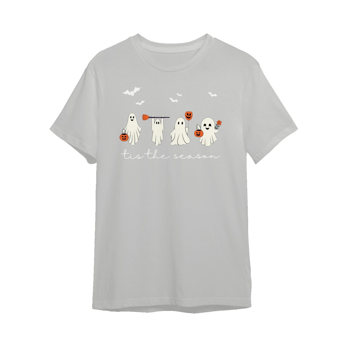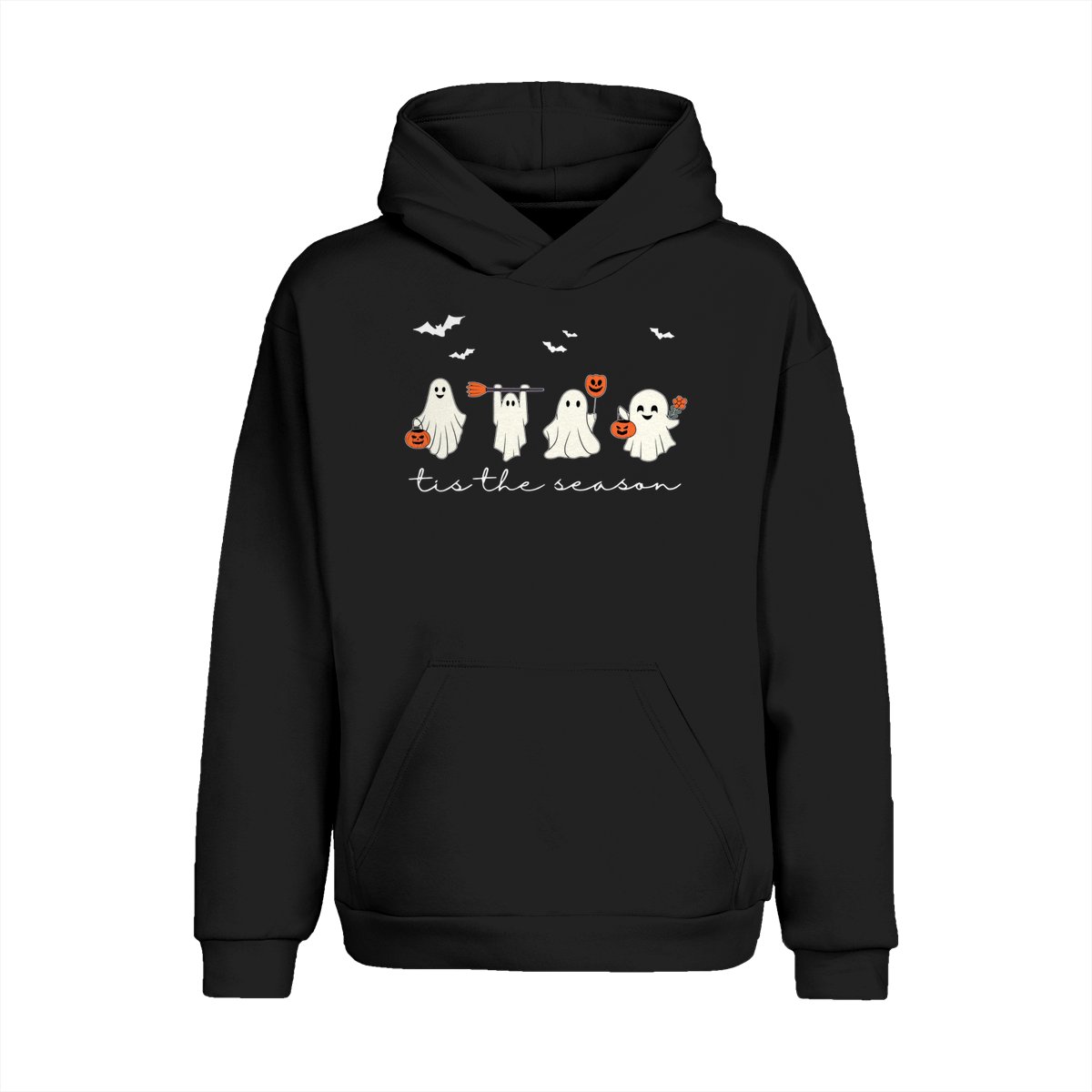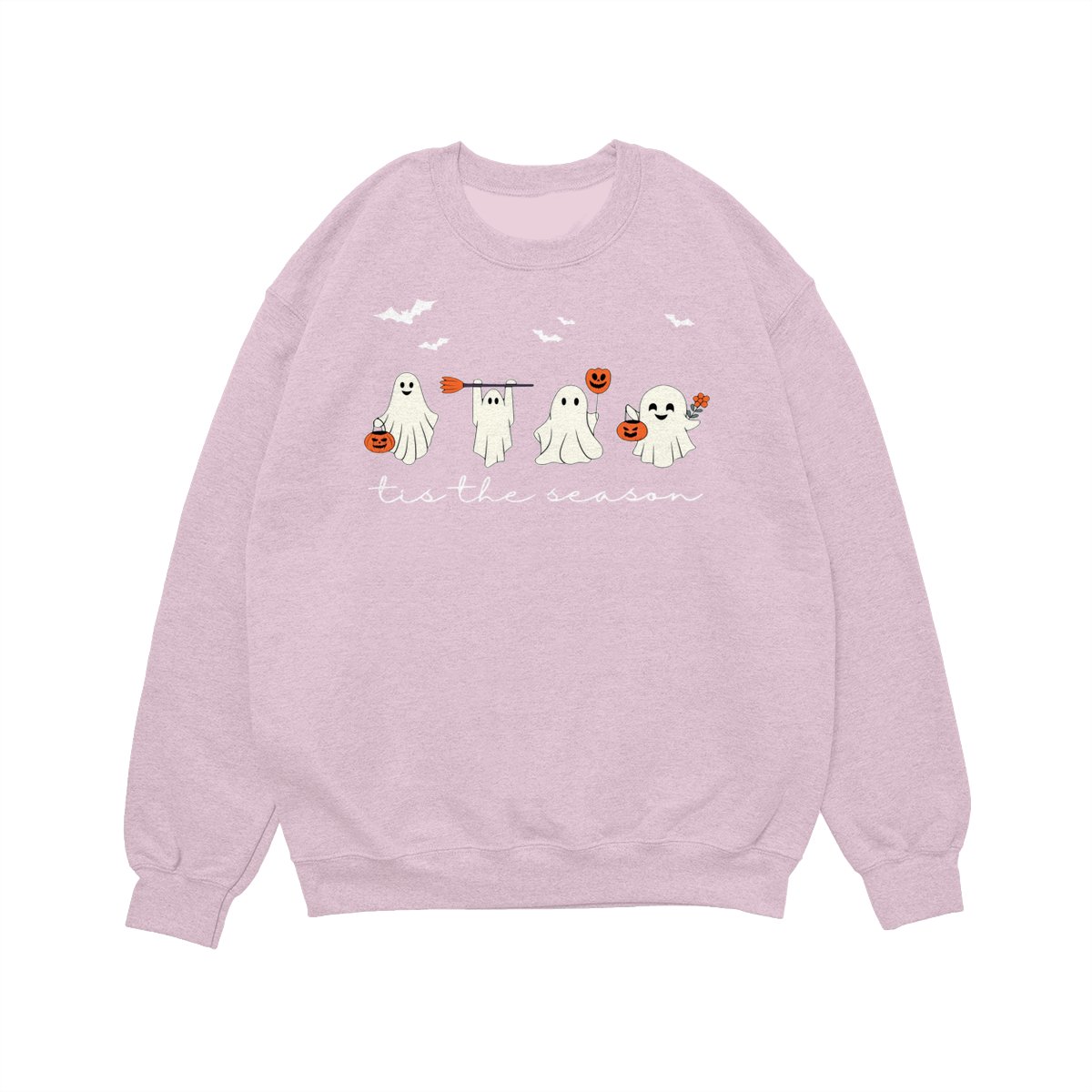 Cute Ghost and Pumpkin Halloween Sweatshirt – T-Shirt – Hoodie – ‘Tis the Season Cute Ghost Crewneck for Women, Fun Fall Graphic Sweatshirt with Pumpkin and Bats, Spooky Season Apparel
