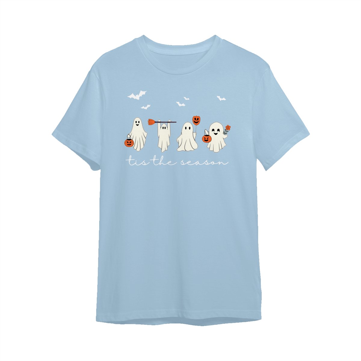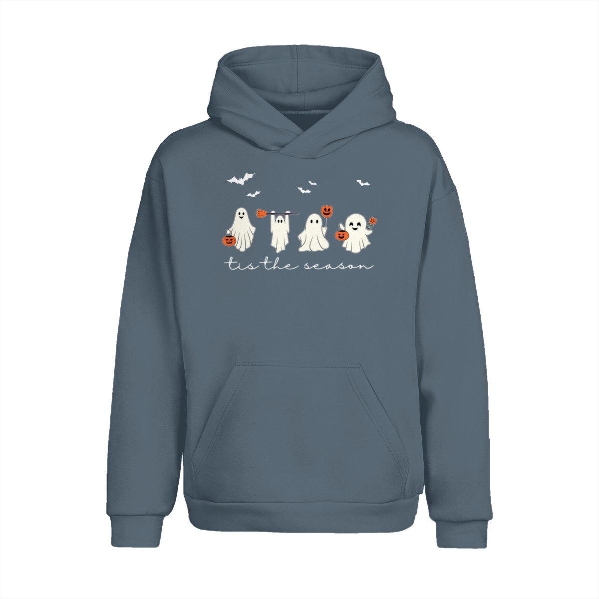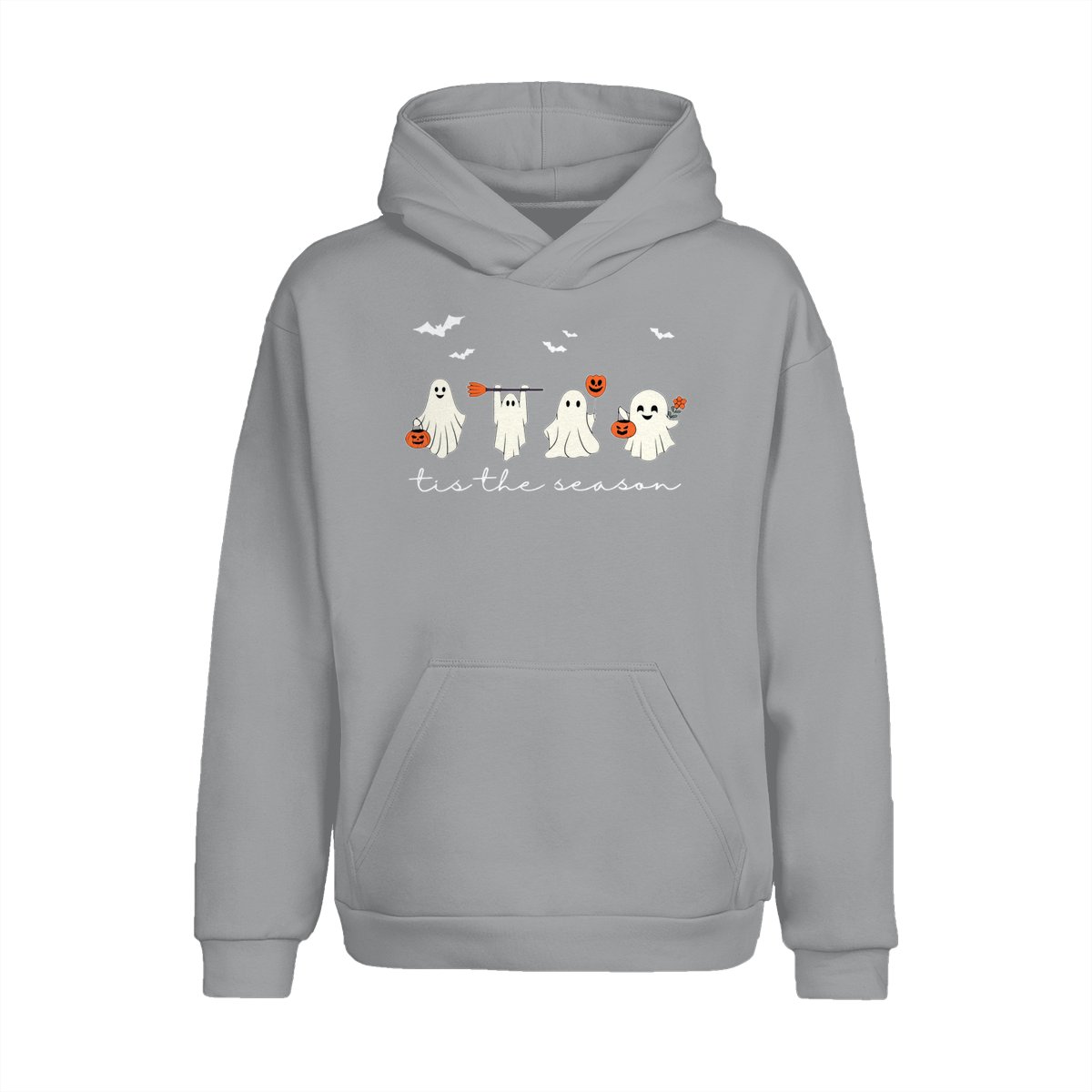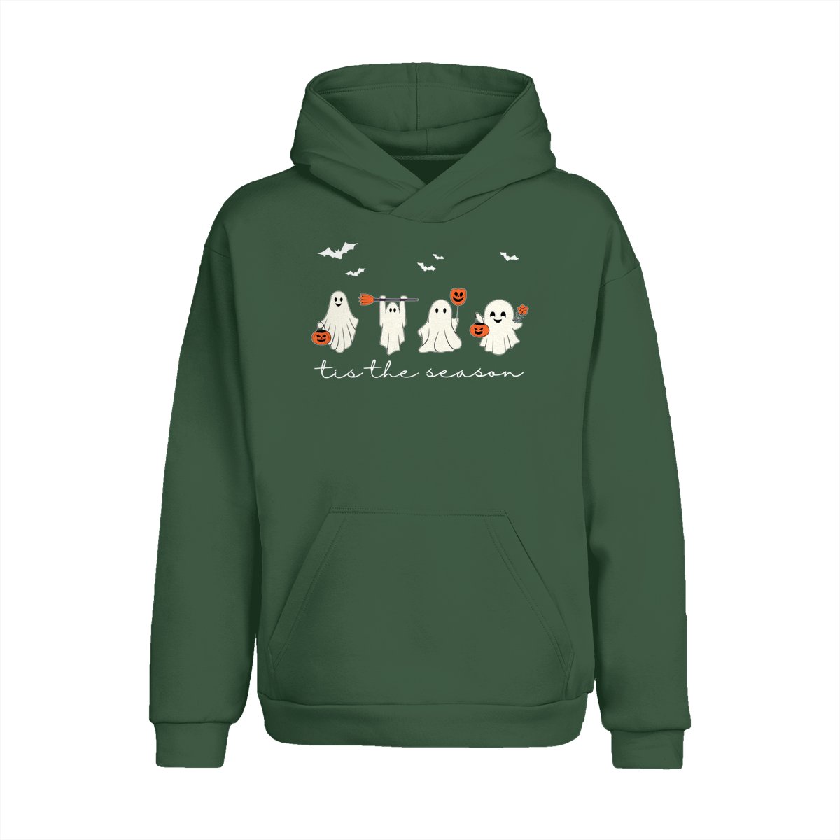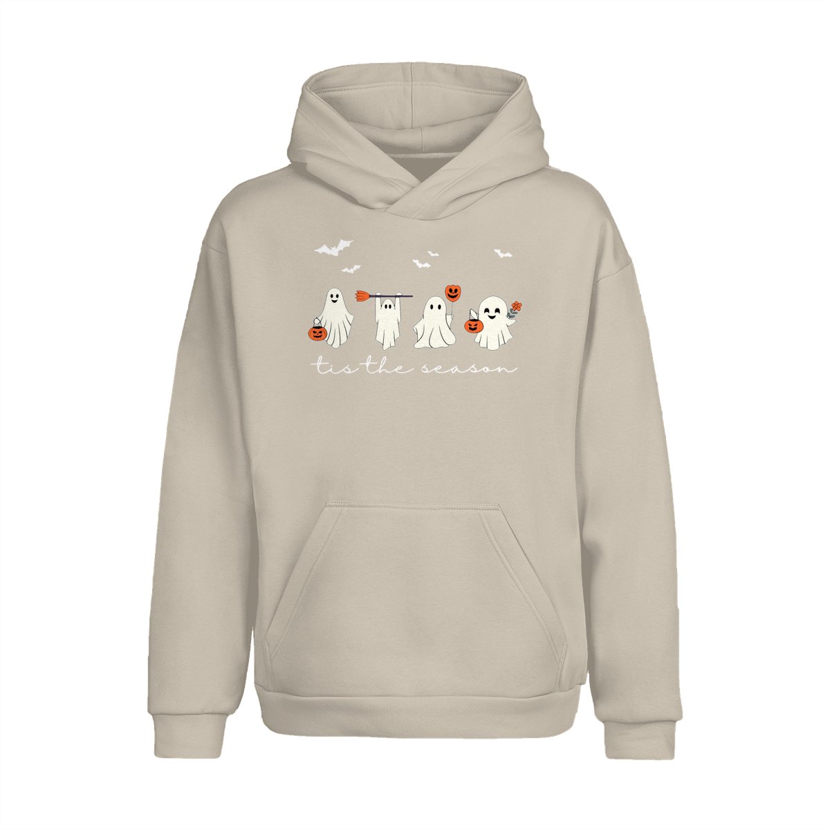 Cute Ghost and Pumpkin Halloween Sweatshirt – T-Shirt – Hoodie – ‘Tis the Season Cute Ghost Crewneck for Women, Fun Fall Graphic Sweatshirt with Pumpkin and Bats, Spooky Season Apparel