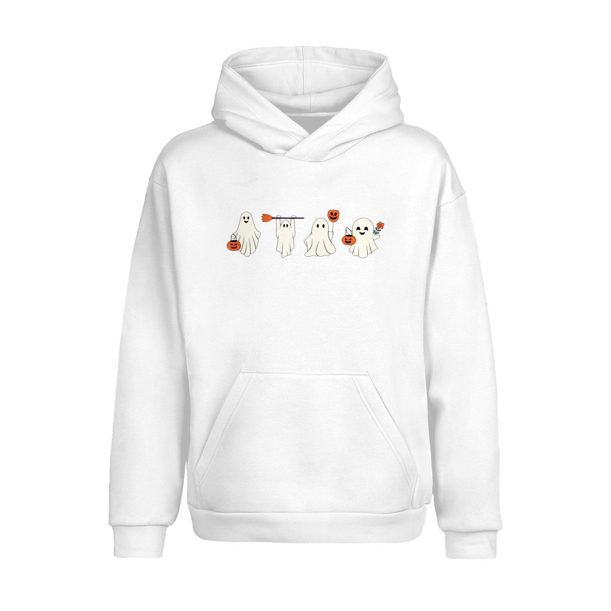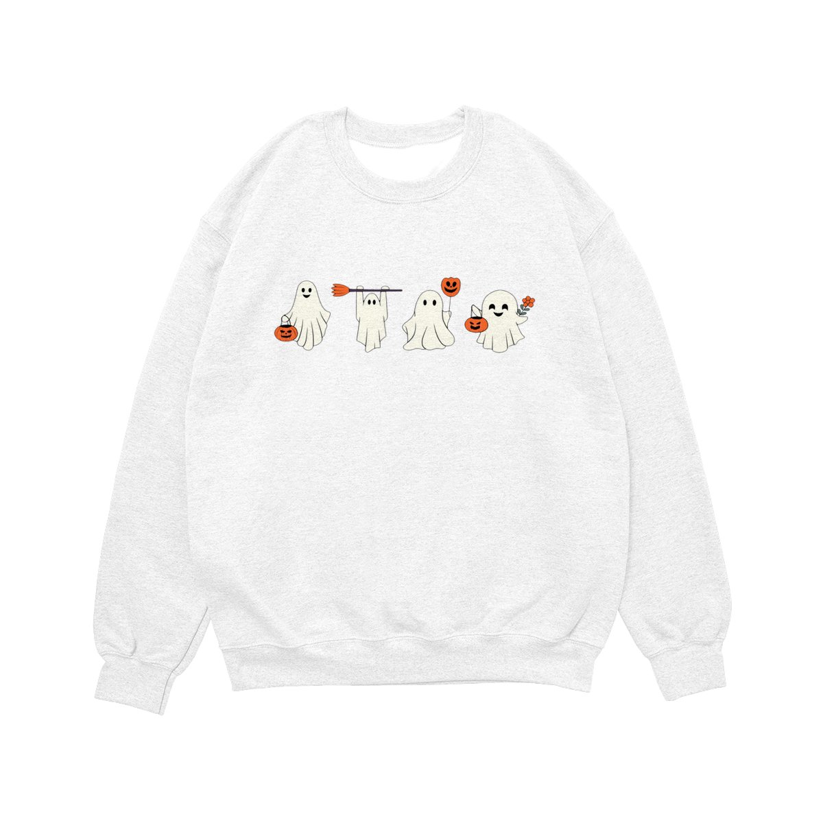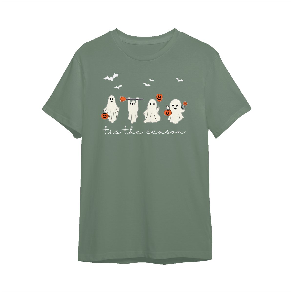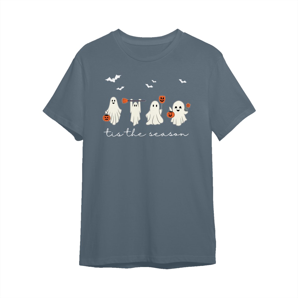 Cute Ghost and Pumpkin Halloween Sweatshirt – T-Shirt – Hoodie – ‘Tis the Season Cute Ghost Crewneck for Women, Fun Fall Graphic Sweatshirt with Pumpkin and Bats, Spooky Season Apparel
