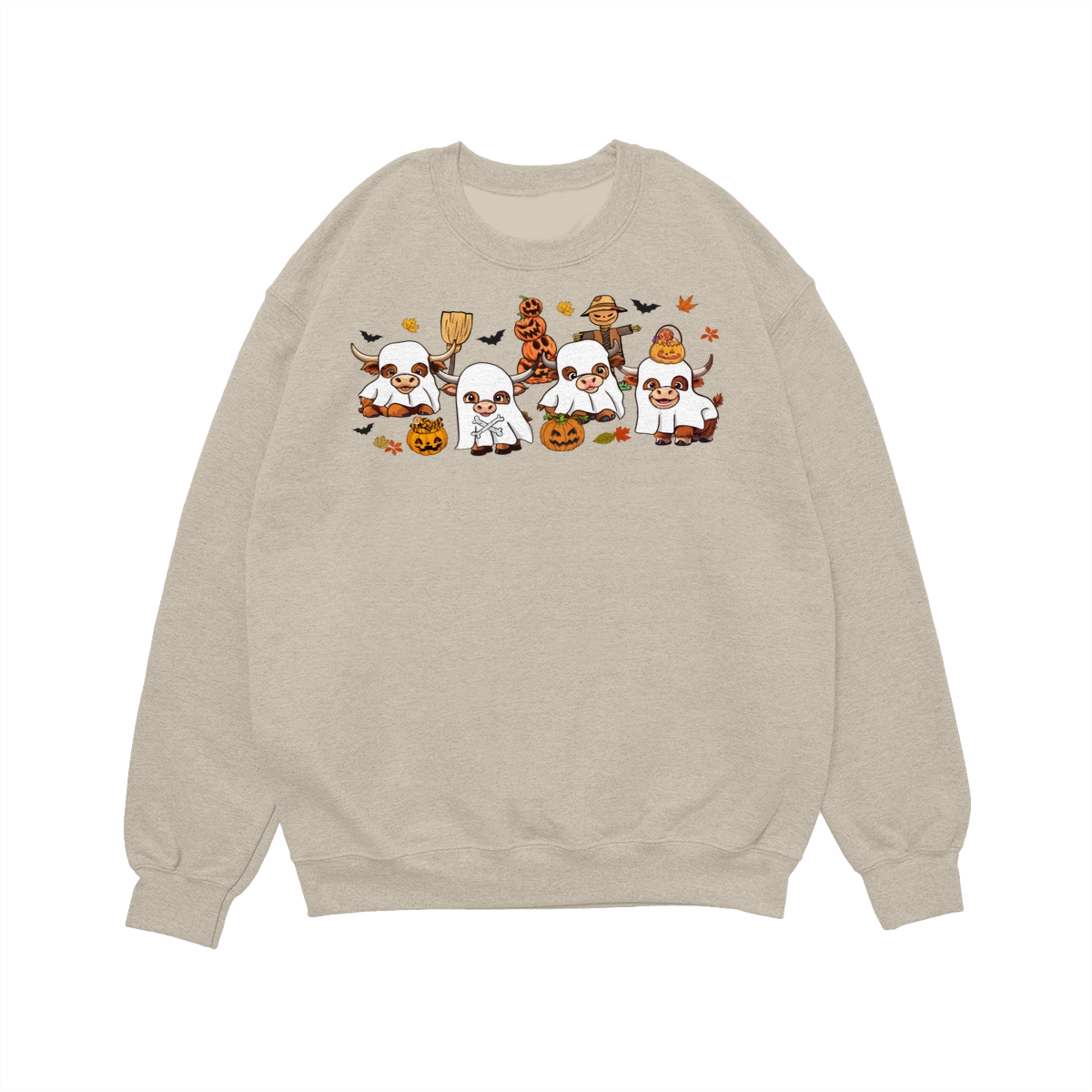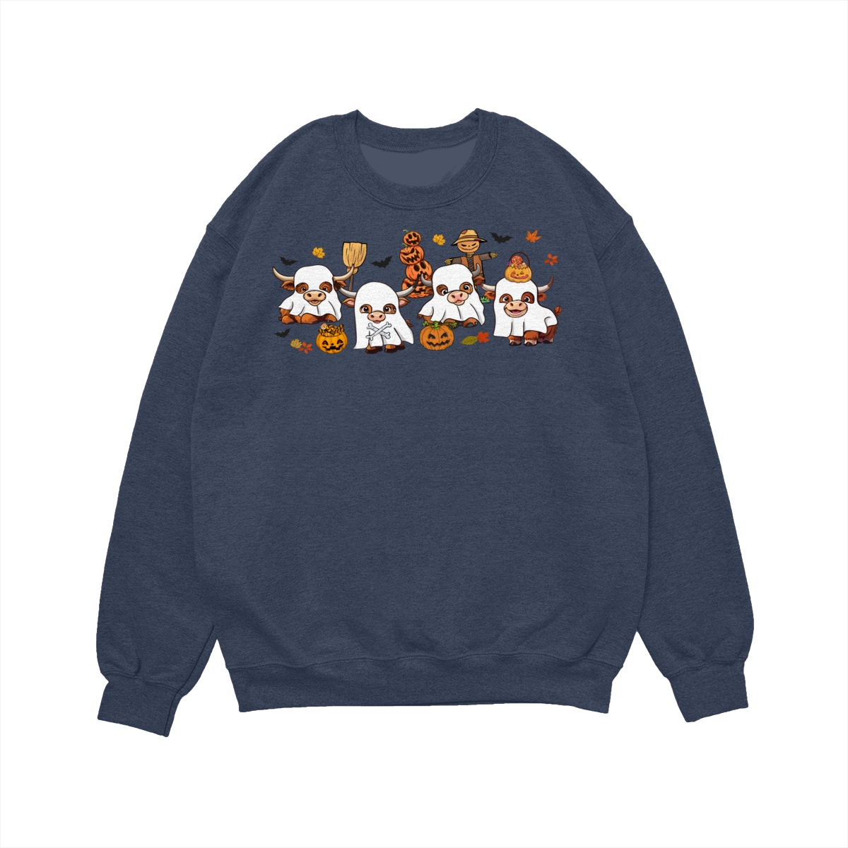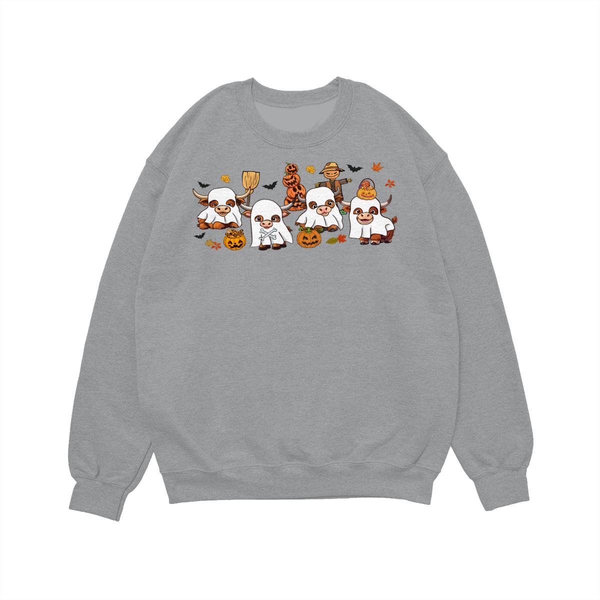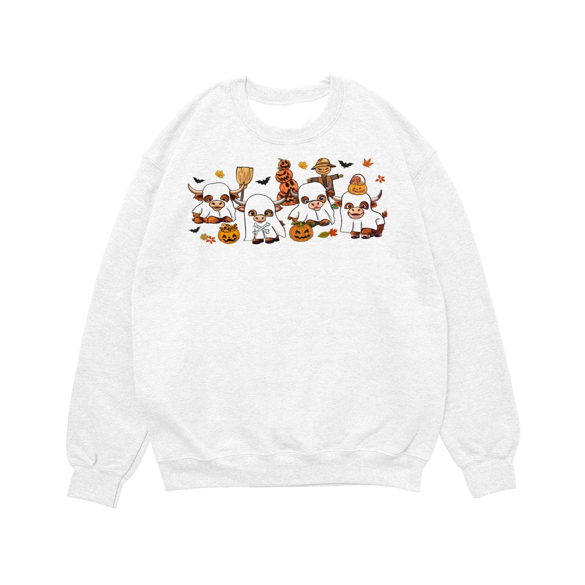 Cute Highland Cow Ghost Costume Graphic Tee – Cozy Fall Crewneck with Pumpkins and Bats – Trending Animal Sweatshirts
