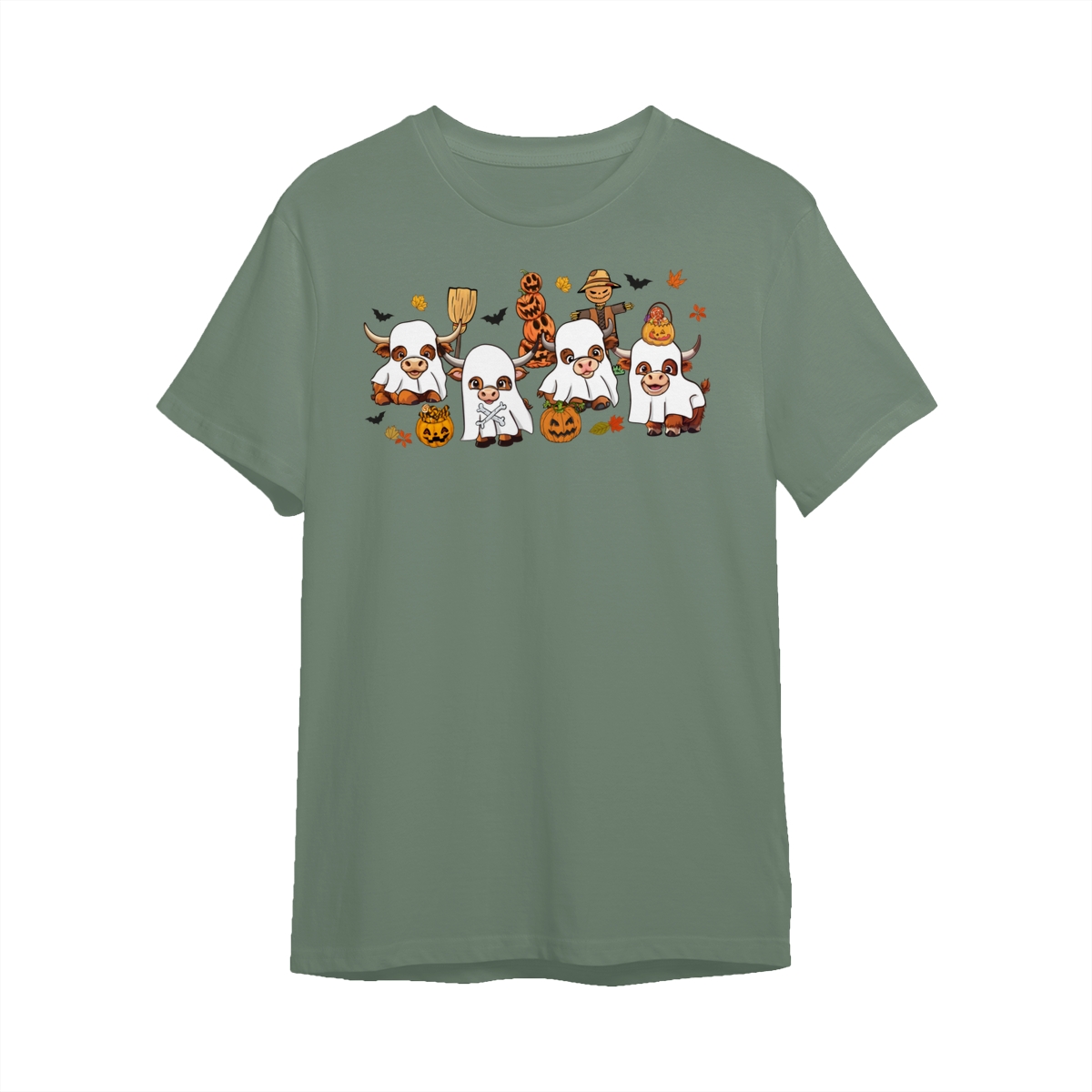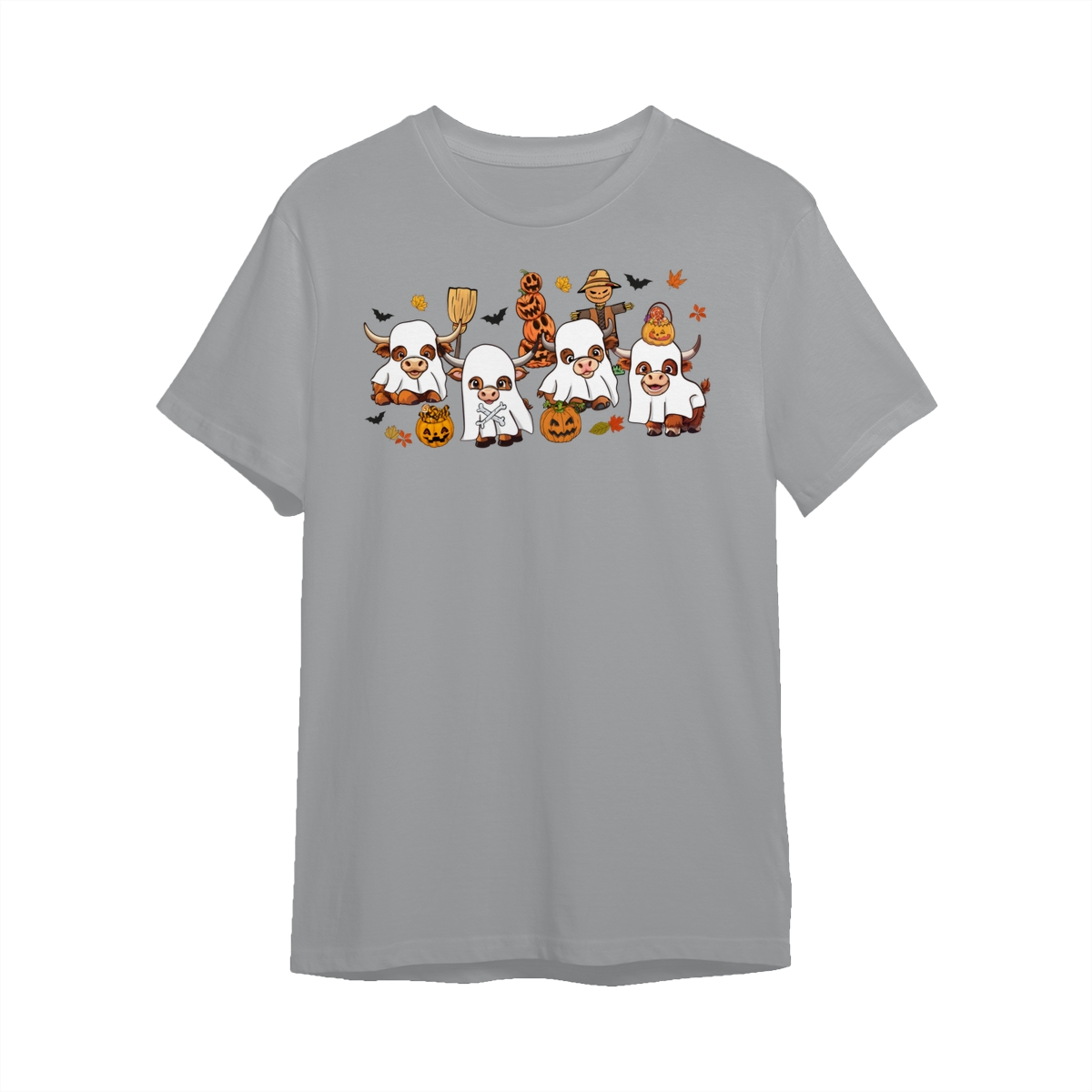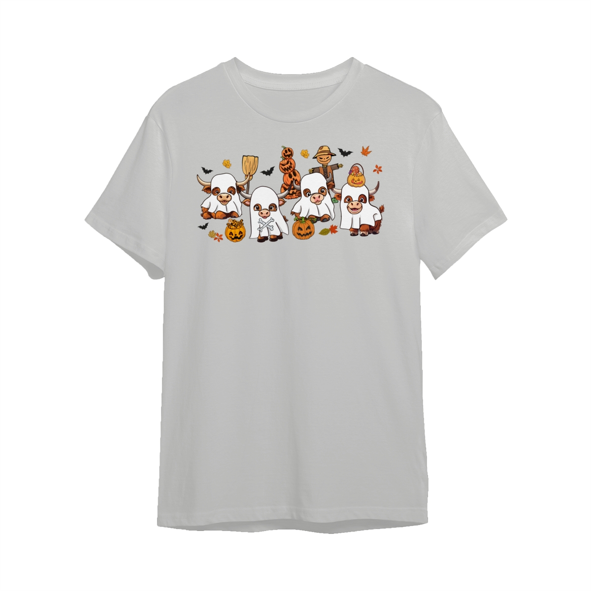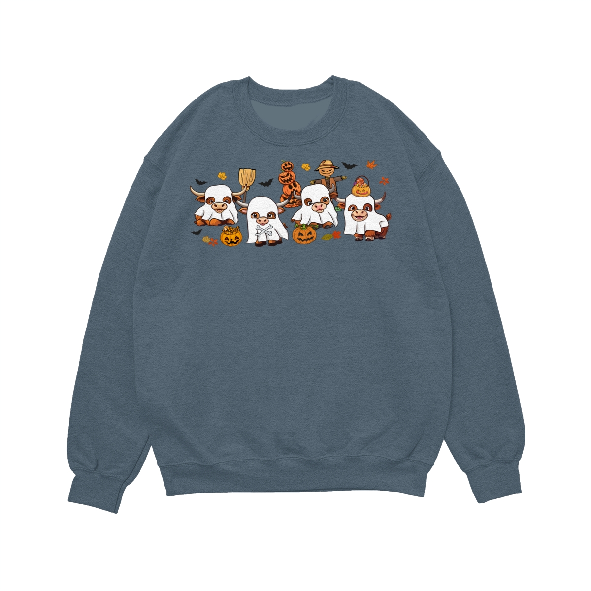 Cute Highland Cow Ghost Costume Graphic Tee – Cozy Fall Crewneck with Pumpkins and Bats – Trending Animal Sweatshirts