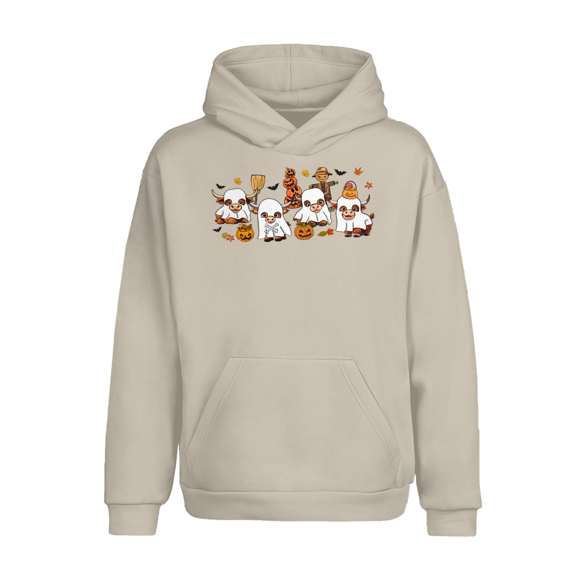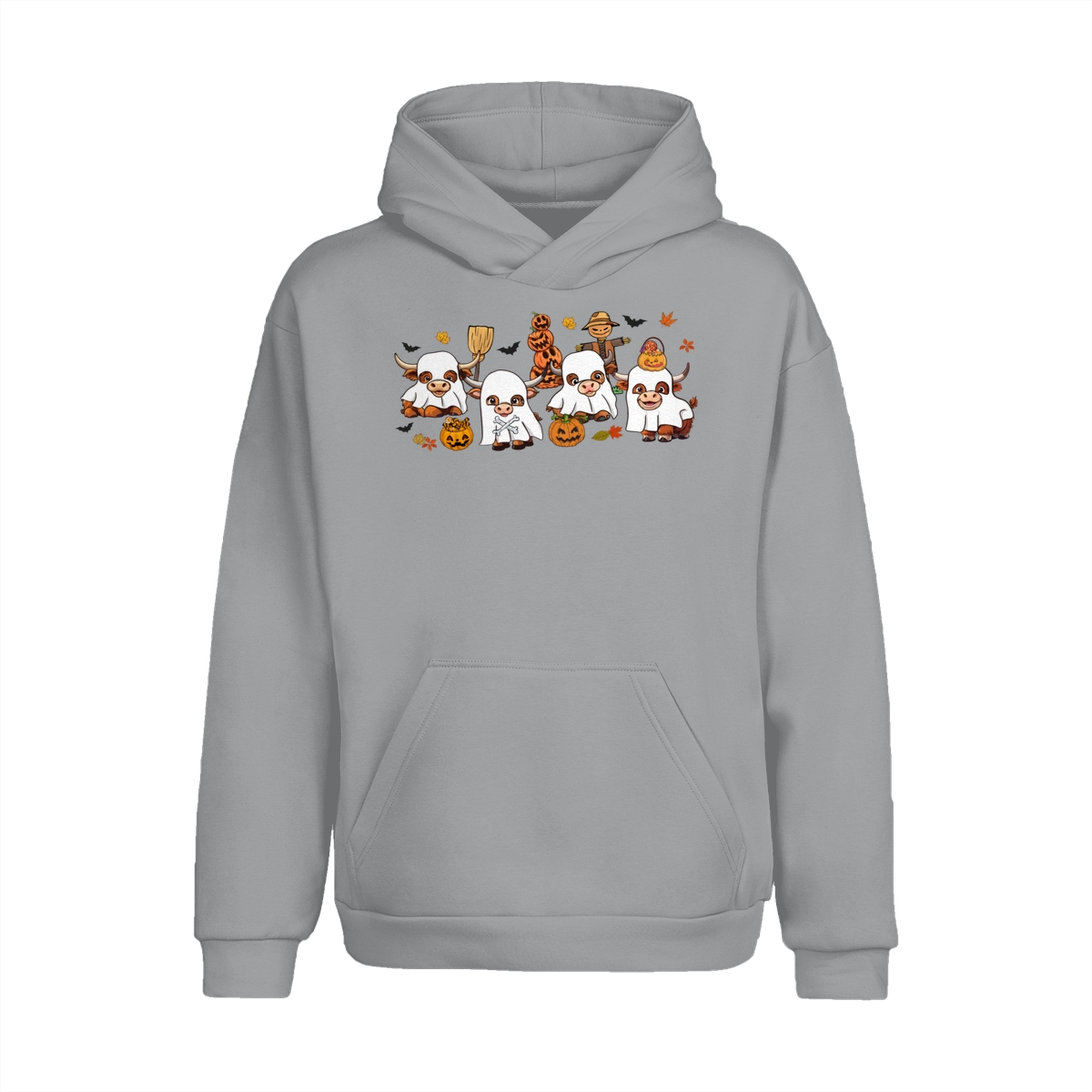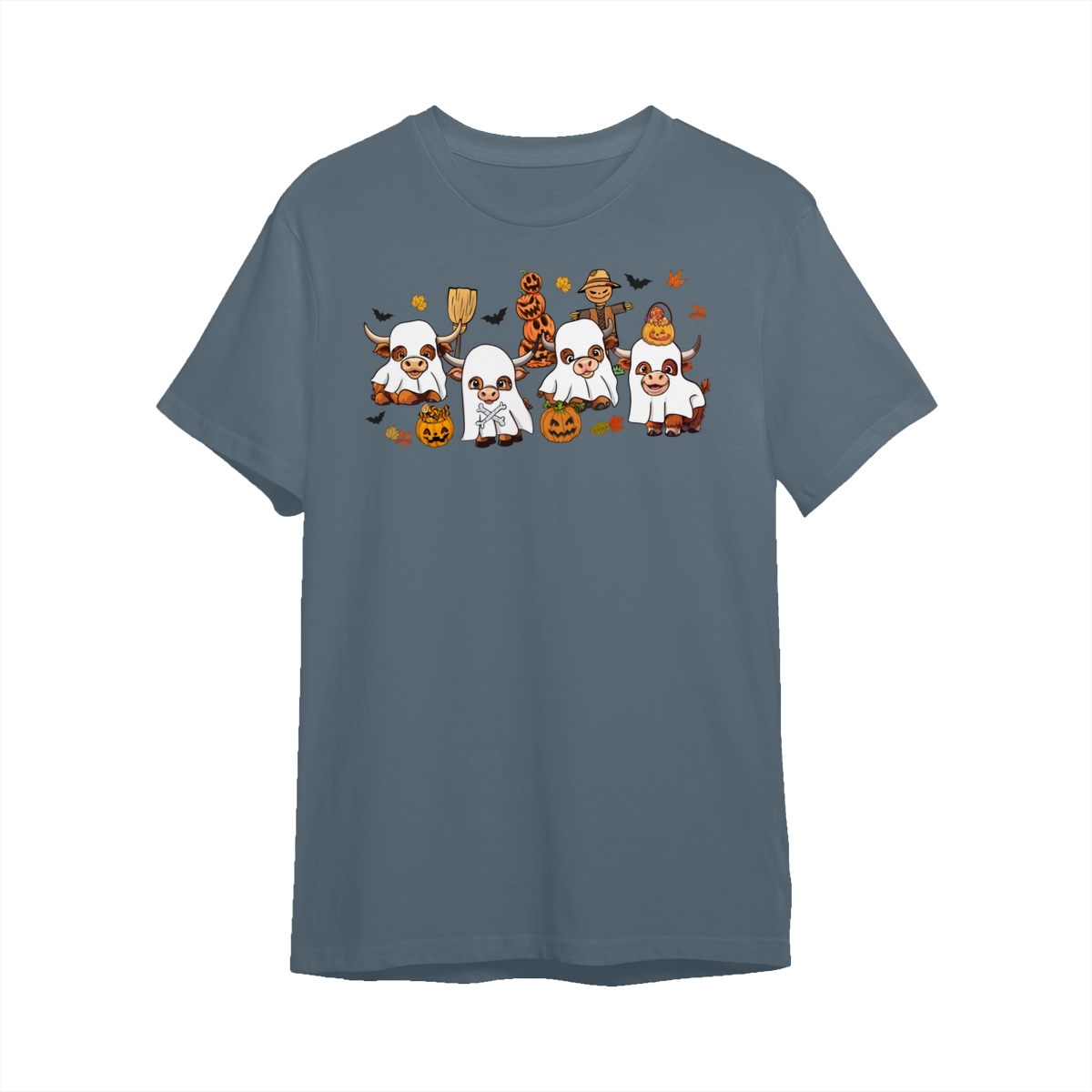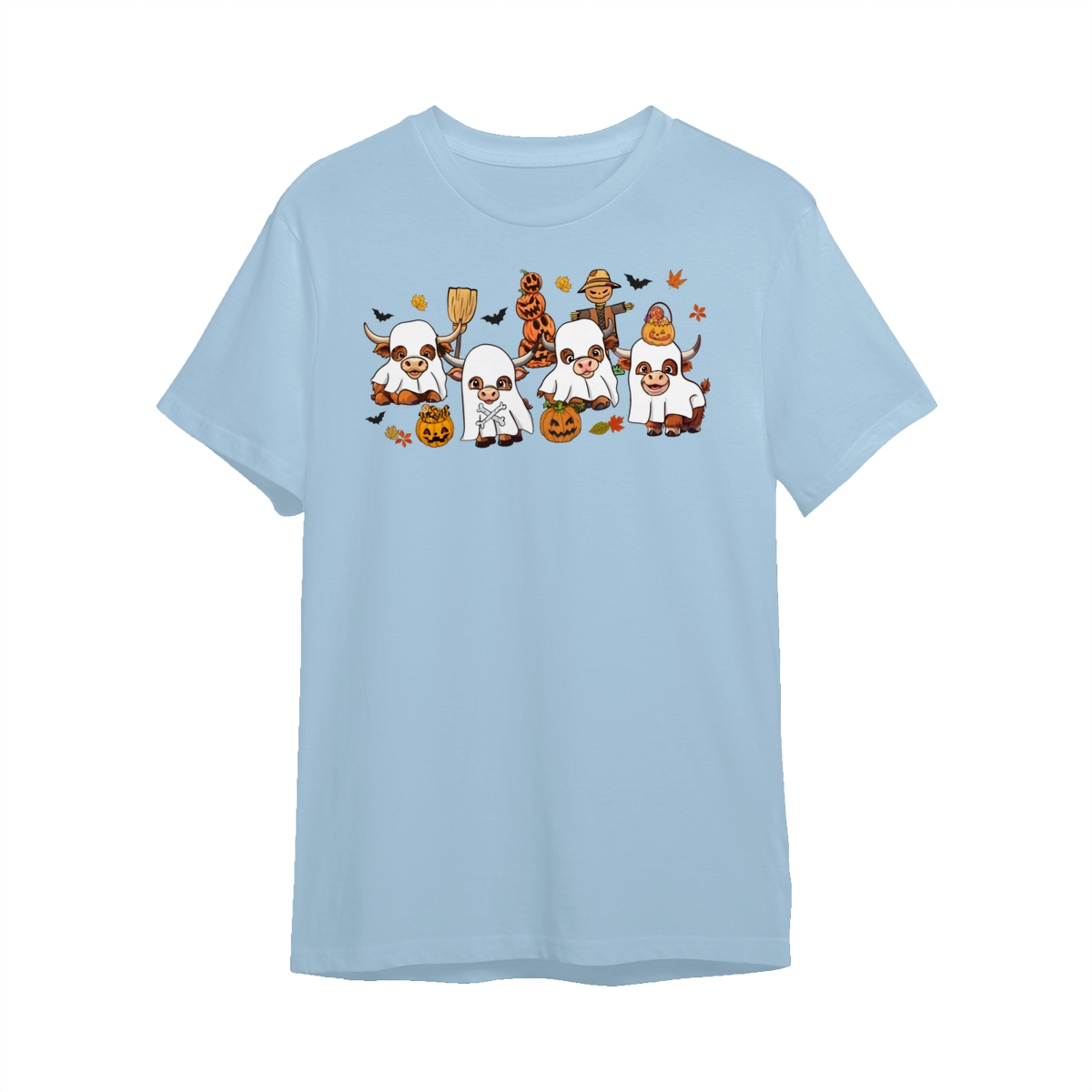 Cute Highland Cow Ghost Costume Graphic Tee – Cozy Fall Crewneck with Pumpkins and Bats – Trending Animal Sweatshirts