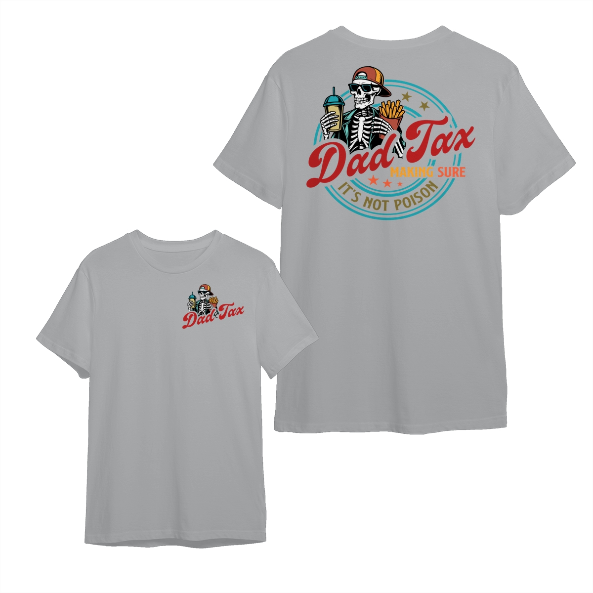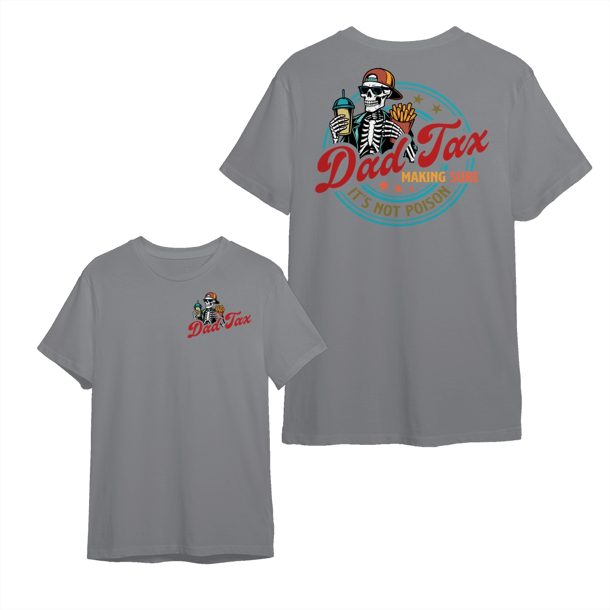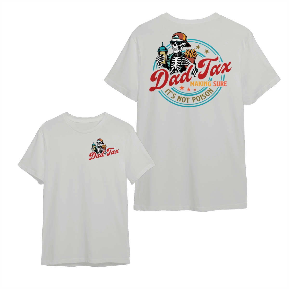 Dad Tax T-Shirt – Cotton Tee with Small Chest Logo, Large Graphic Featuring a Skeleton Holding a Drink and Fries with “Dad Tax Making Sure It’s Not Poison” Text on Back, Stylish and Comfortable Apparel for Fathers Who Love a Good Joke