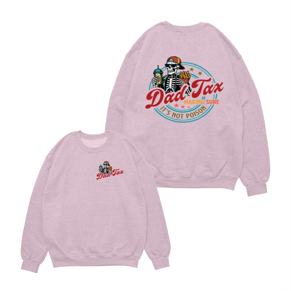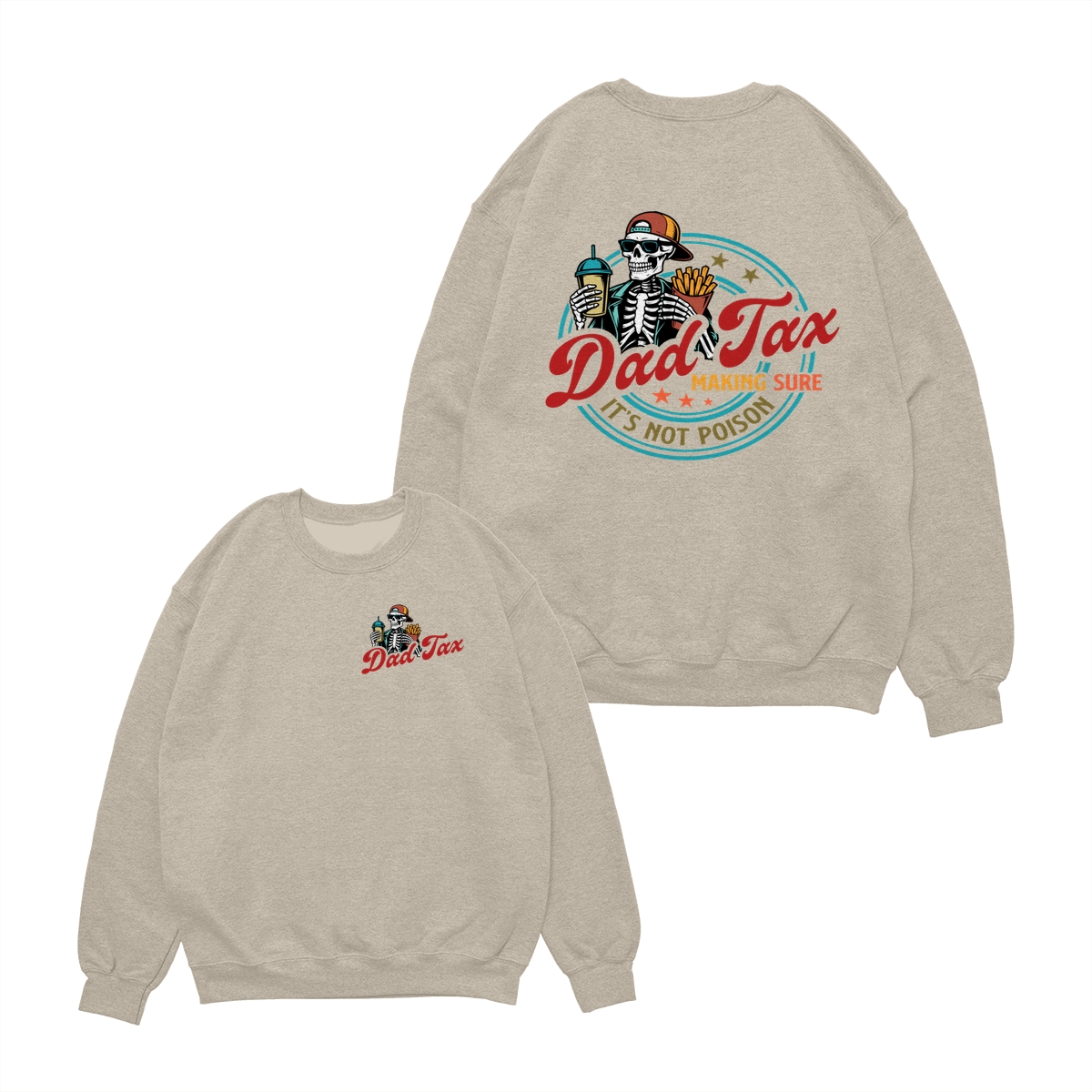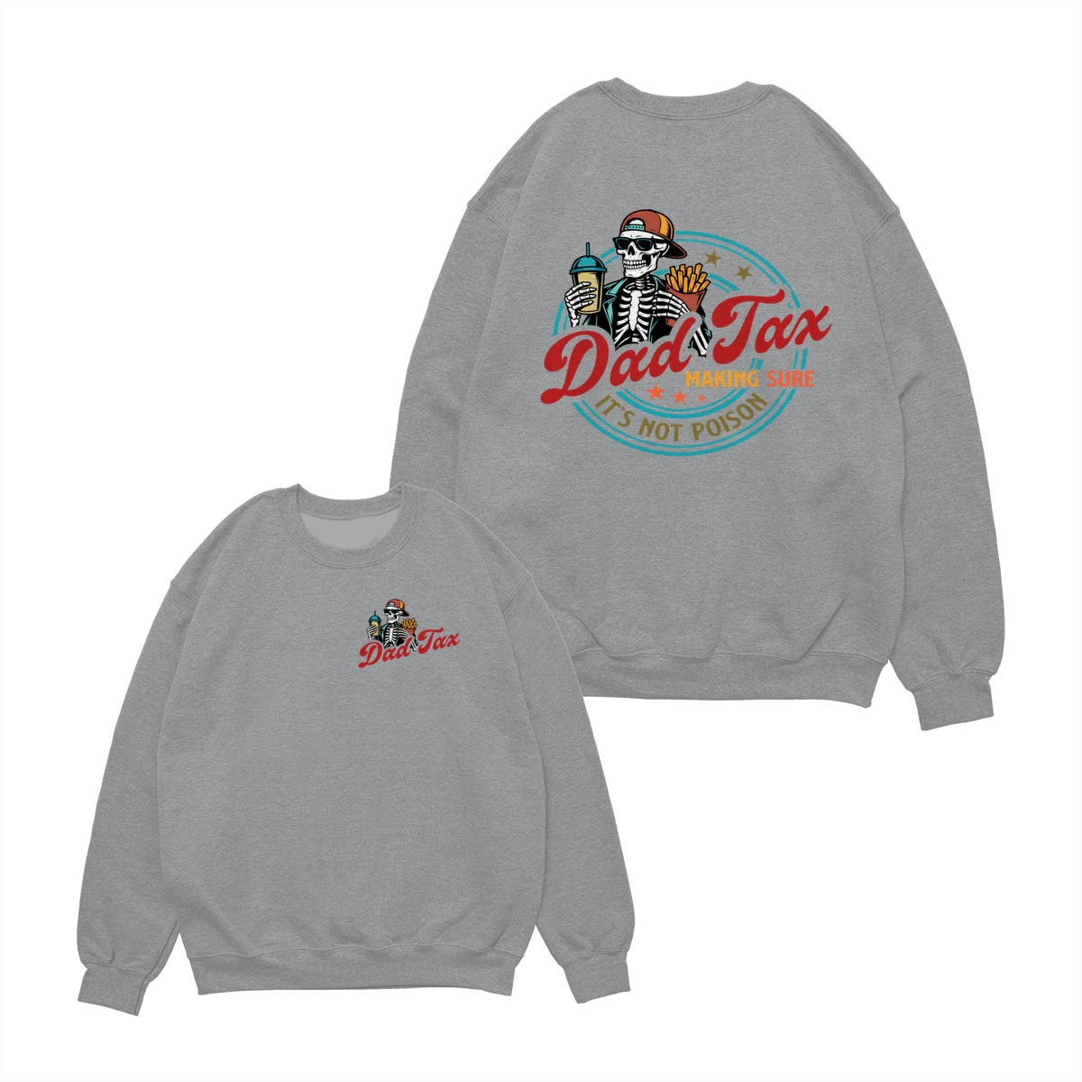 Dad Tax T-Shirt – Cotton Tee with Small Chest Logo, Large Graphic Featuring a Skeleton Holding a Drink and Fries with “Dad Tax Making Sure It’s Not Poison” Text on Back, Stylish and Comfortable Apparel for Fathers Who Love a Good Joke