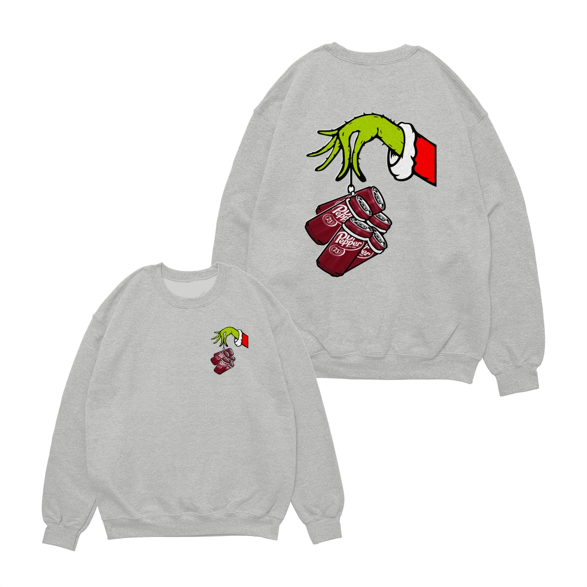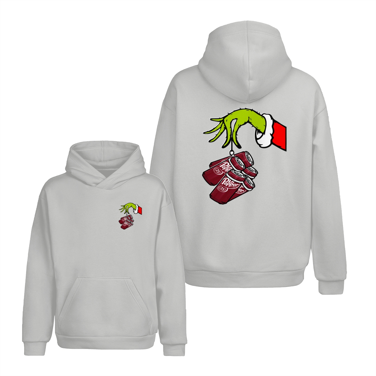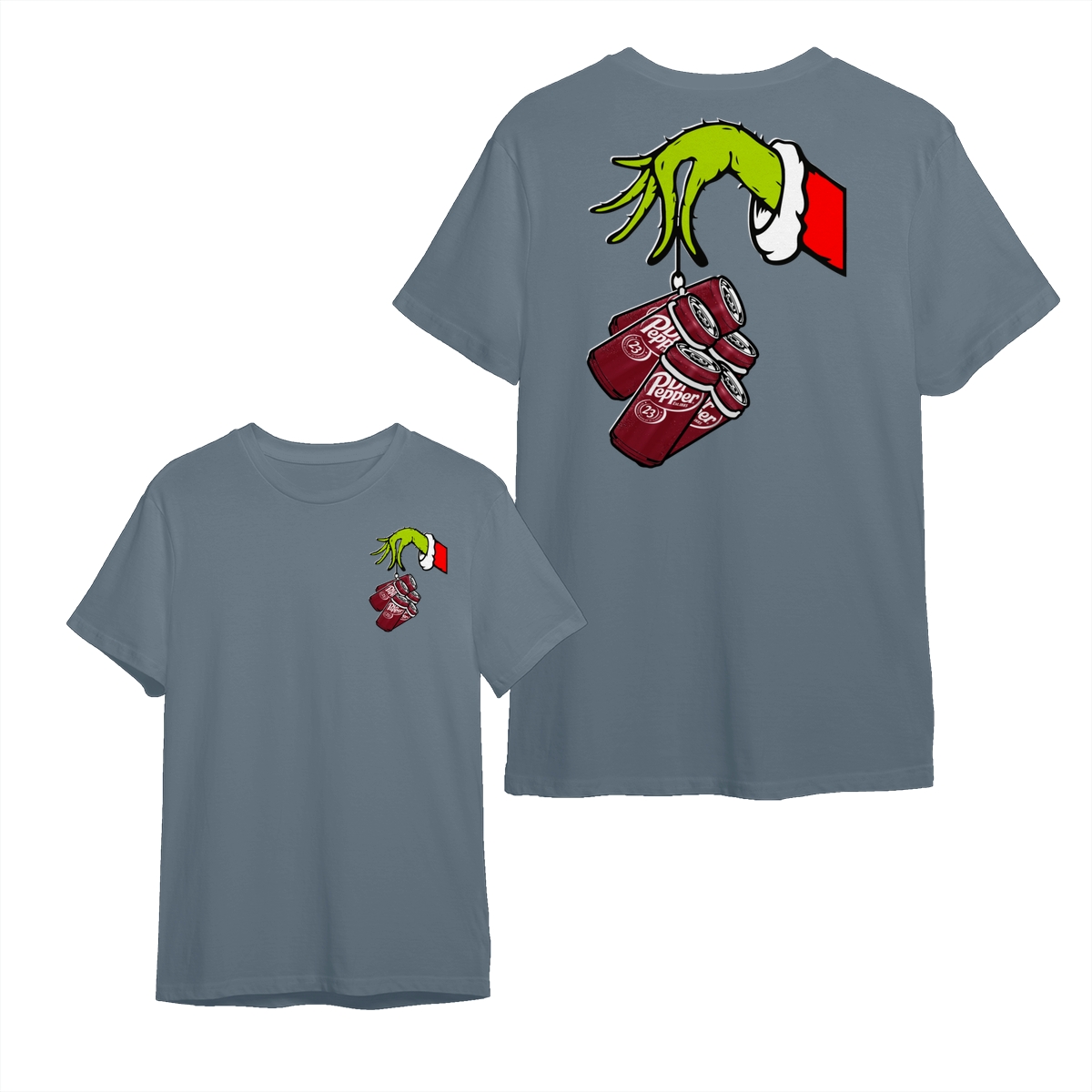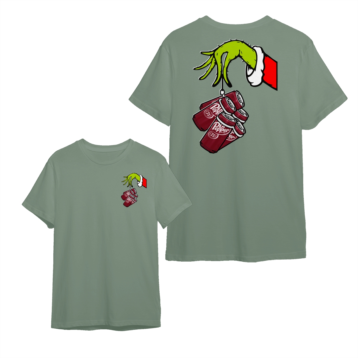 Dr Pepper Soda Soft Drink The Grinch Hand T-Shirt, Christmas Green Guy Holding Dr Pepper Cans 2 Sided Graphic Printed Unisex Classic Cotton T-Shirts