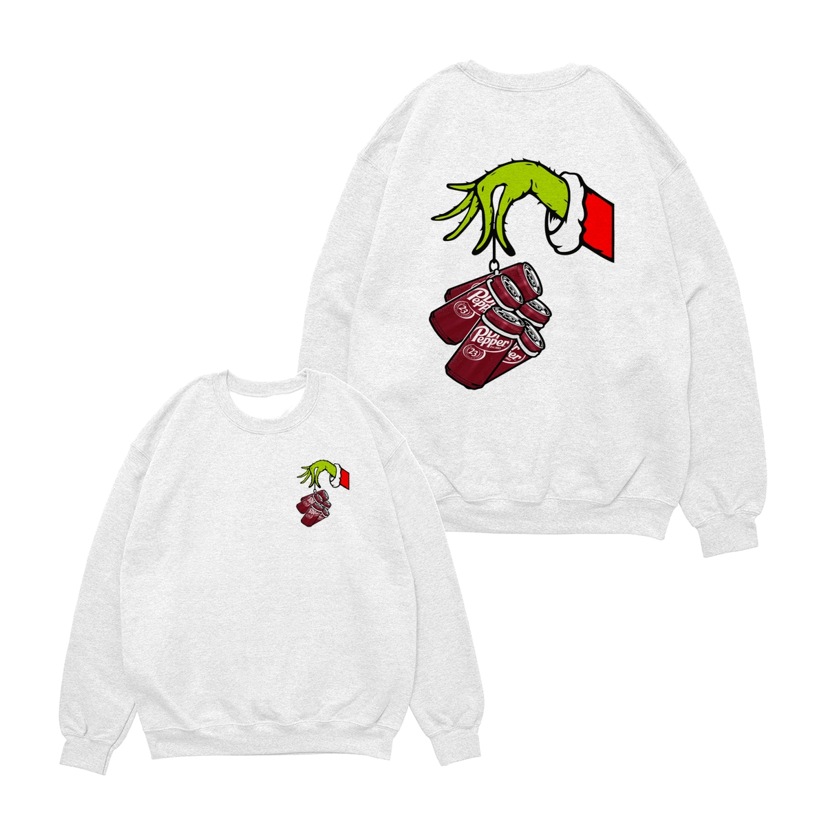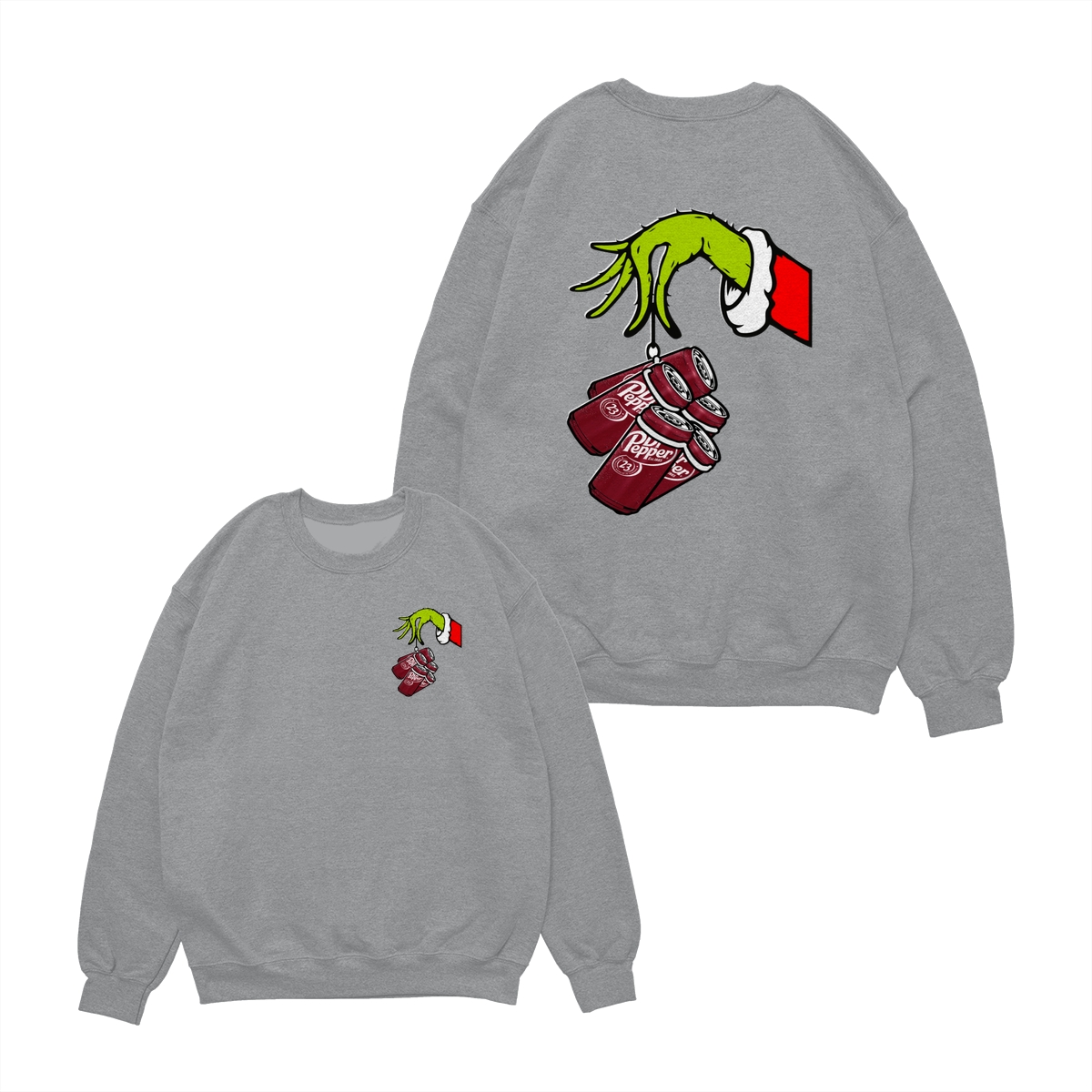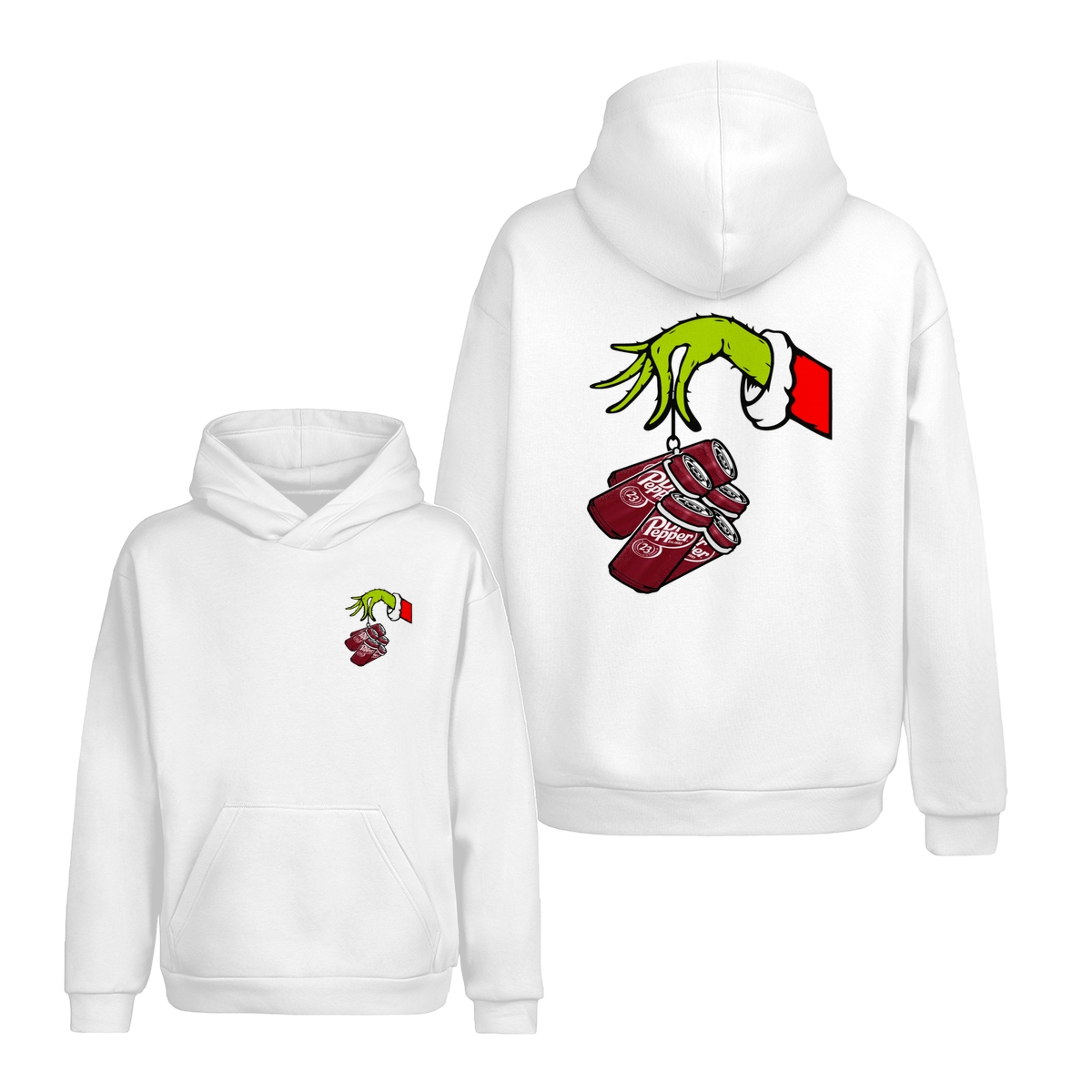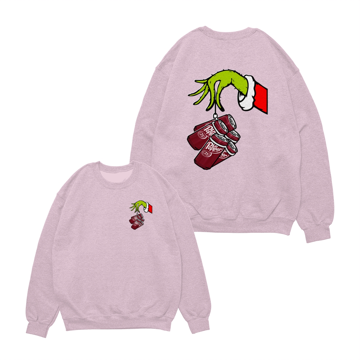 Dr Pepper Soda Soft Drink The Grinch Hand T-Shirt, Christmas Green Guy Holding Dr Pepper Cans 2 Sided Graphic Printed Unisex Classic Cotton T-Shirts