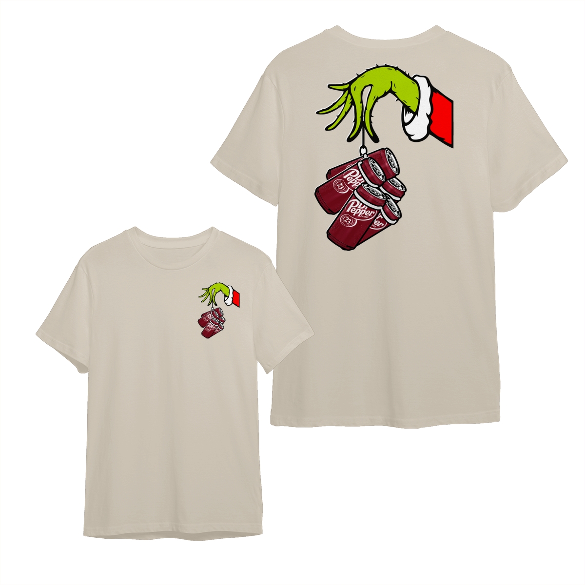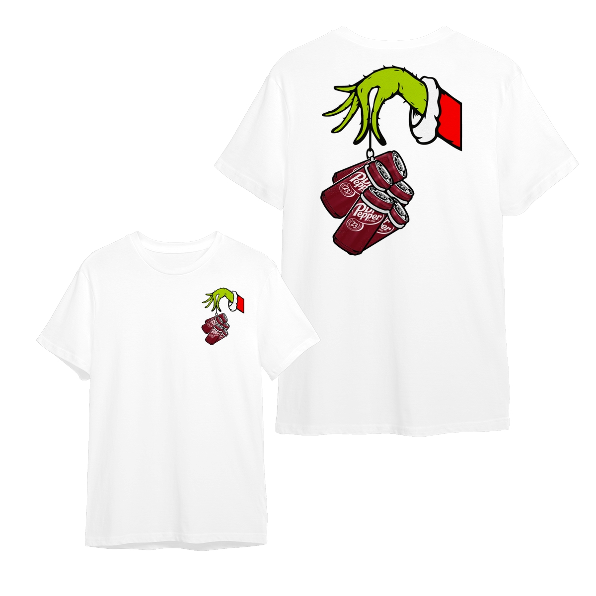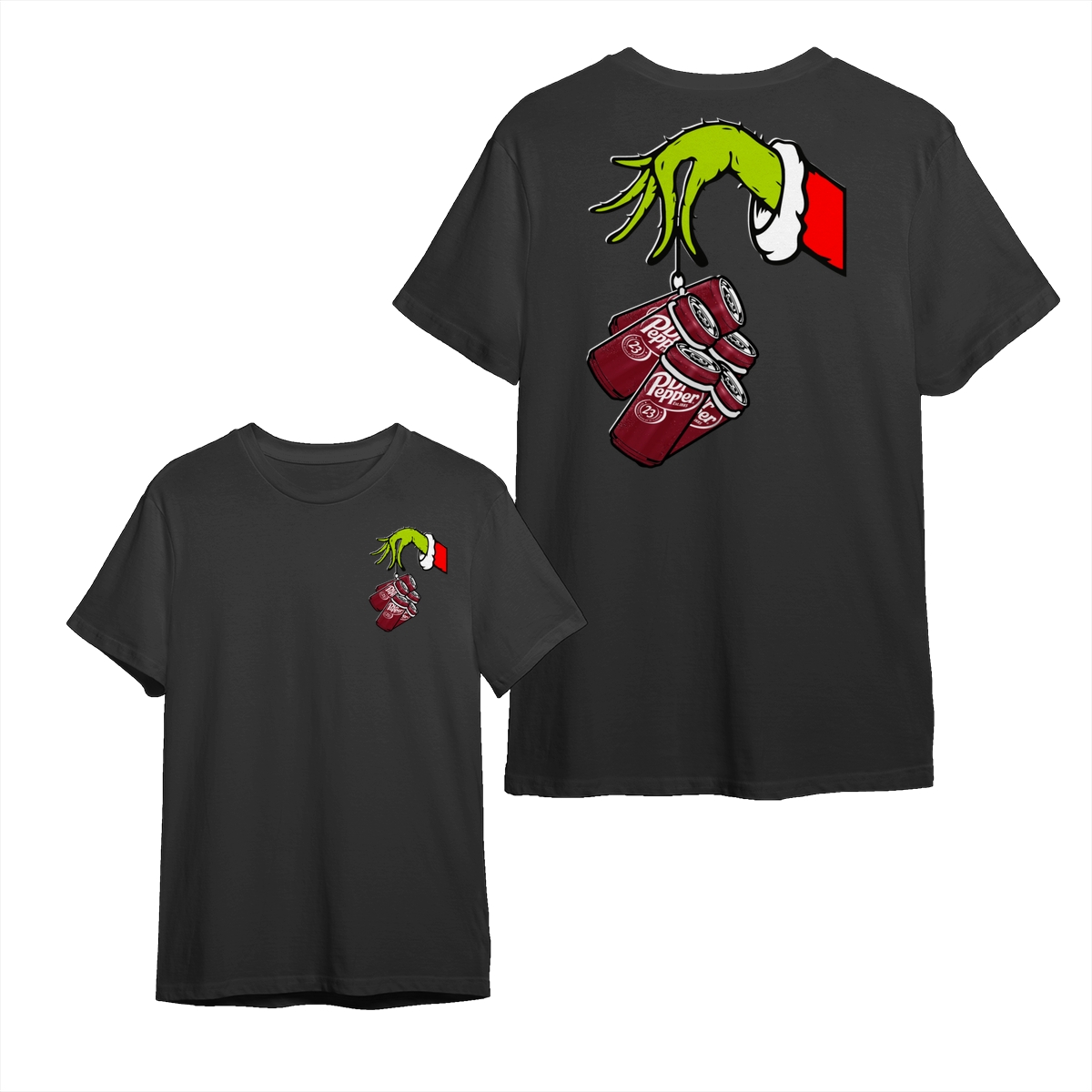 Dr Pepper Soda Soft Drink The Grinch Hand T-Shirt, Christmas Green Guy Holding Dr Pepper Cans 2 Sided Graphic Printed Unisex Classic Cotton T-Shirts