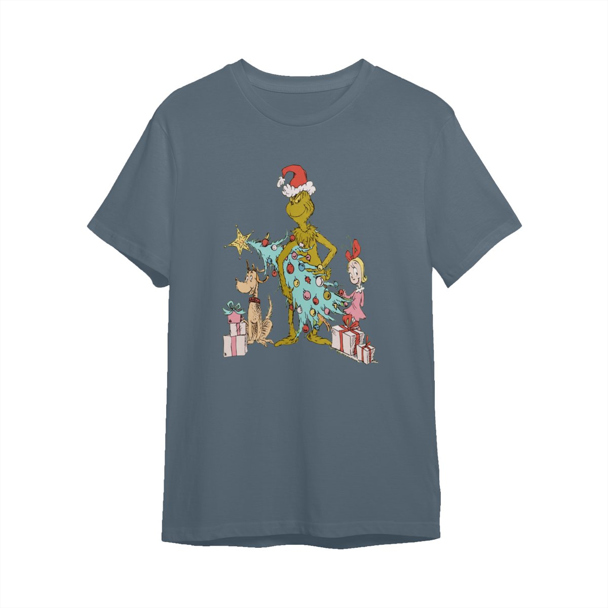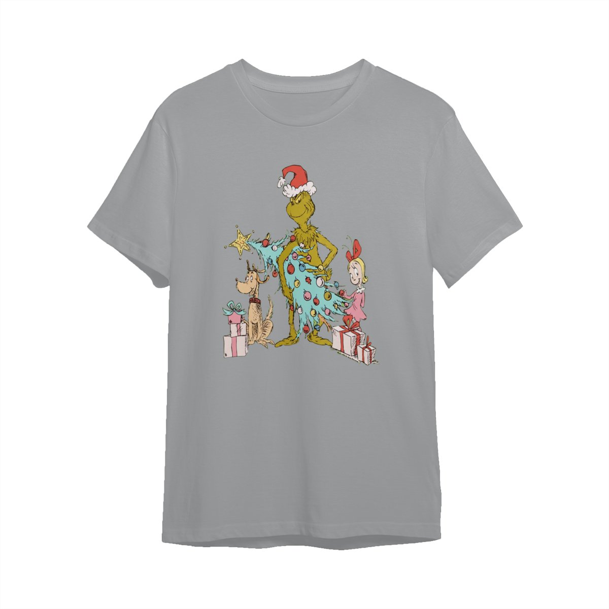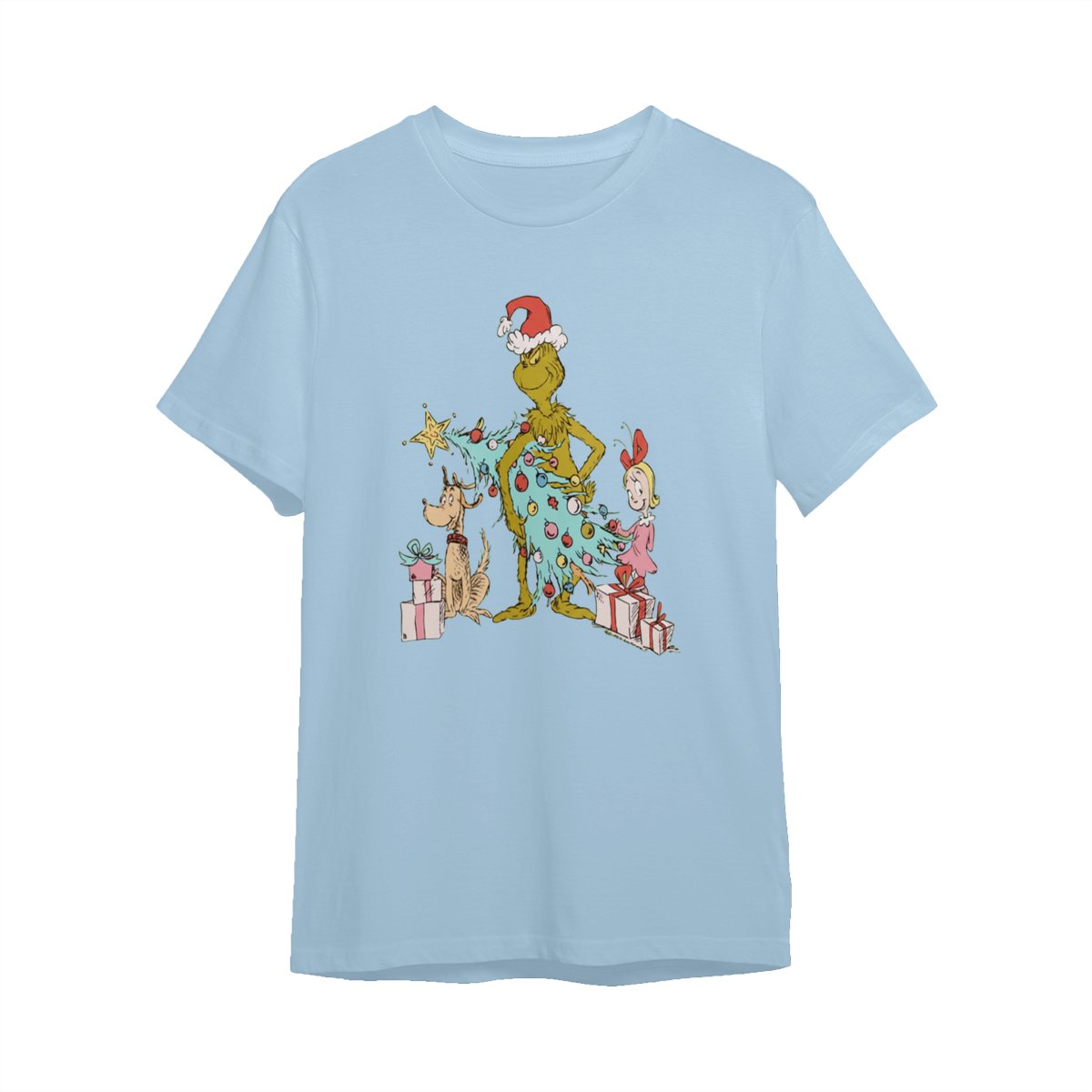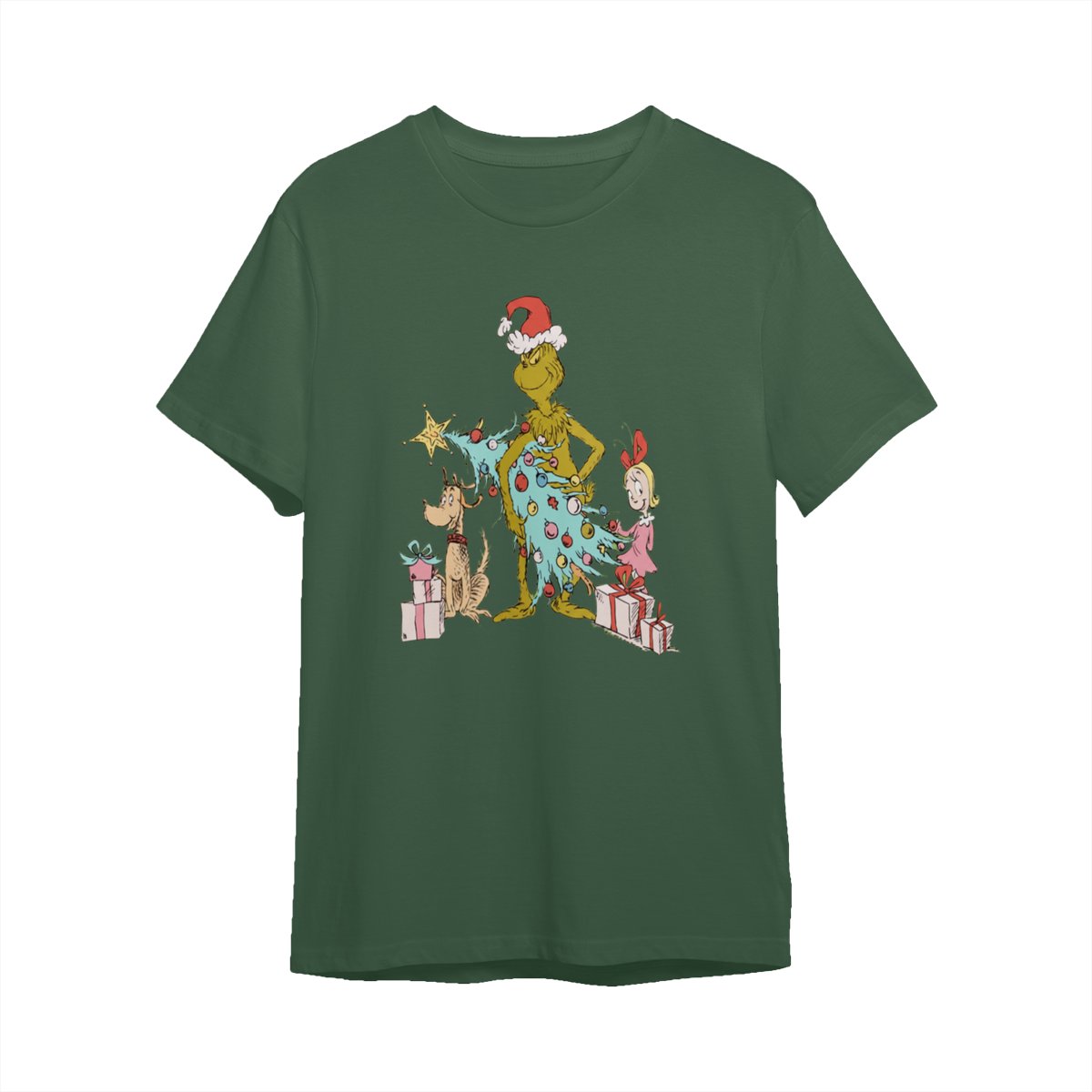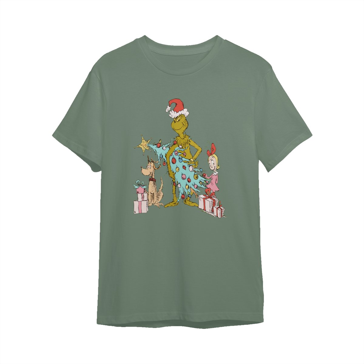 Dr. Seuss’ The Grinch Whoville Style Christmas Cartoon Tee – Funny Green Holiday Mischief Character with Girl and Dog, Decorated Tree & Gifts – Cute Retro Xmas Illustration Shirt for Winter Season, Festive Outfits, Holiday Parties & Christmas Gift Ideas
